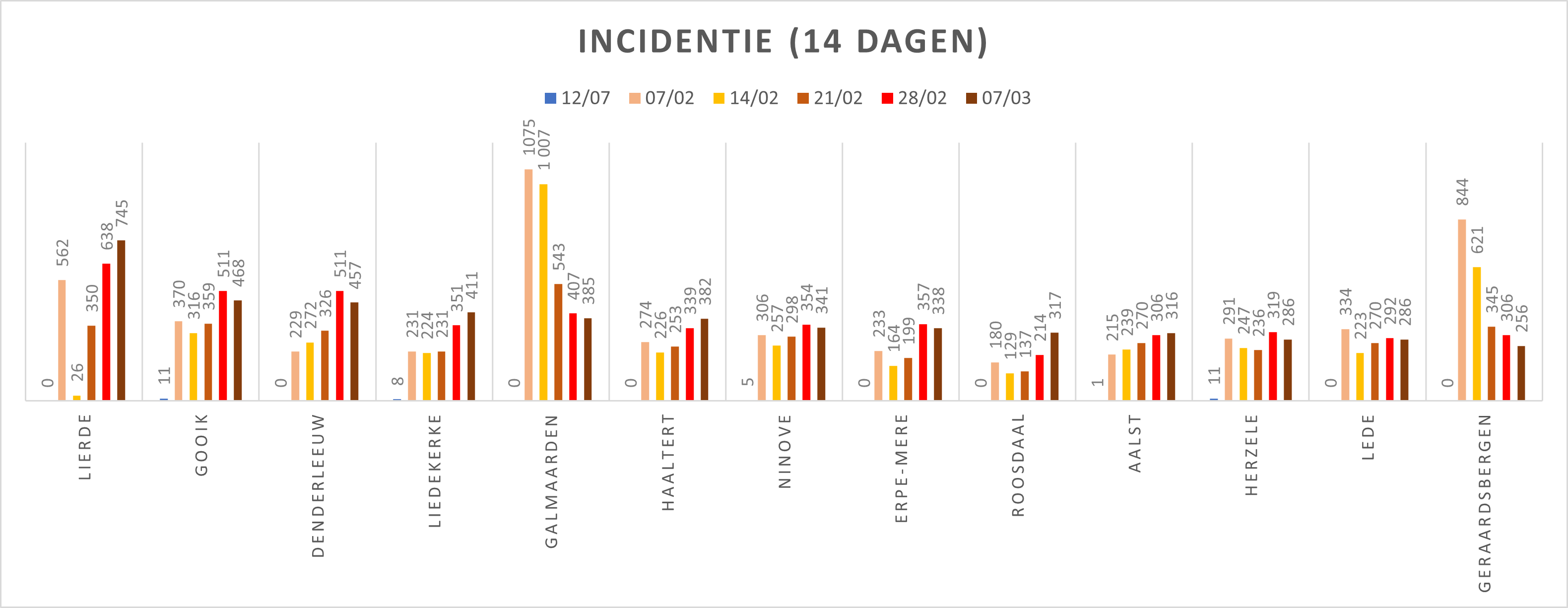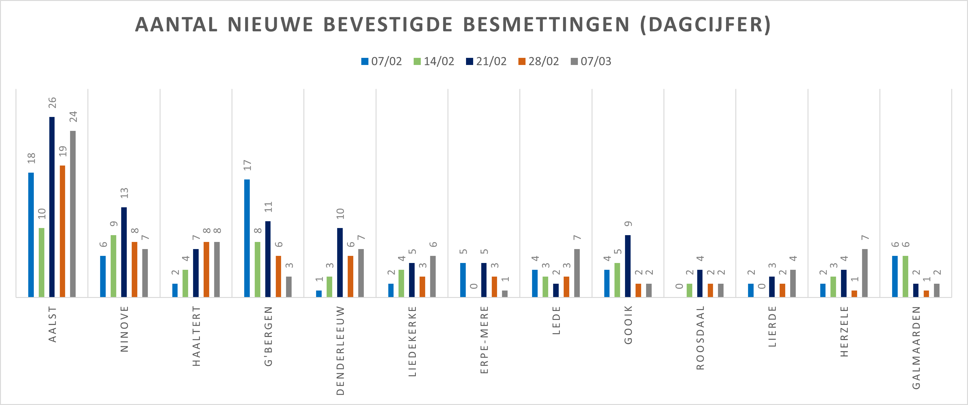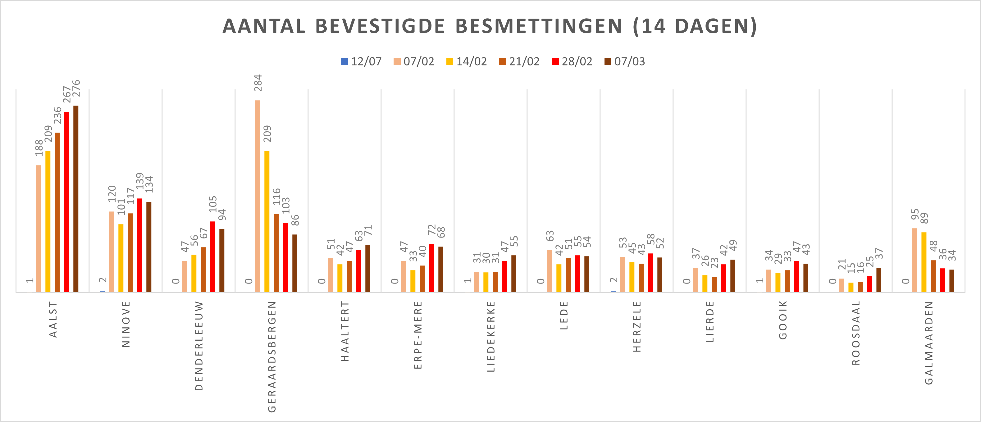 NINOVE – Volgens Sciensano zijn de afgelopen 14 dagen 134 bevestigde besmettingen genoteerd in Ninove. We brengen deze en andere cijfers van de omliggende steden en gemeenten elke week in kaart.