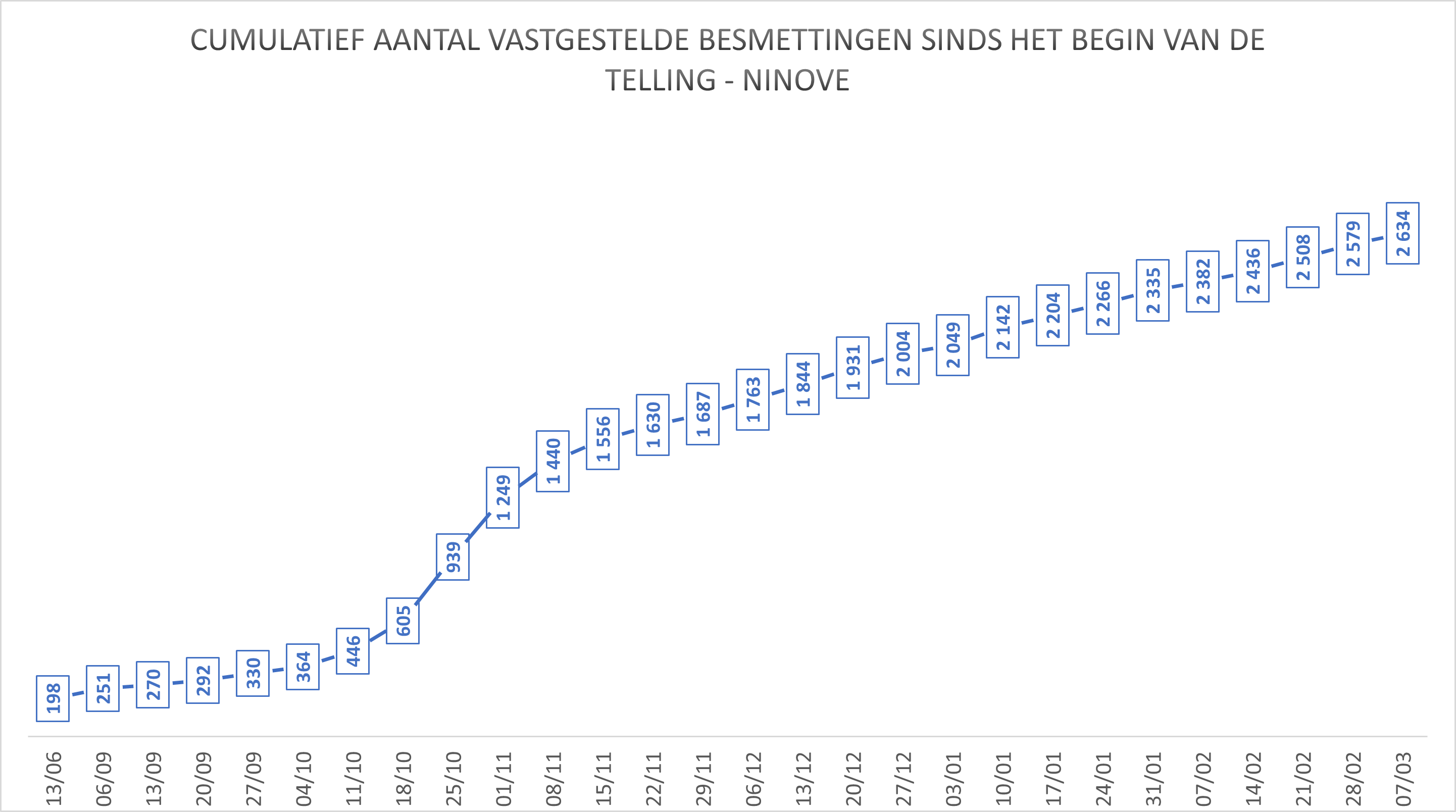 - In totaal zijn in Ninove 2.634 besmettingen genoteerd sinds het begin van de telling.
