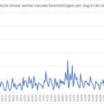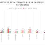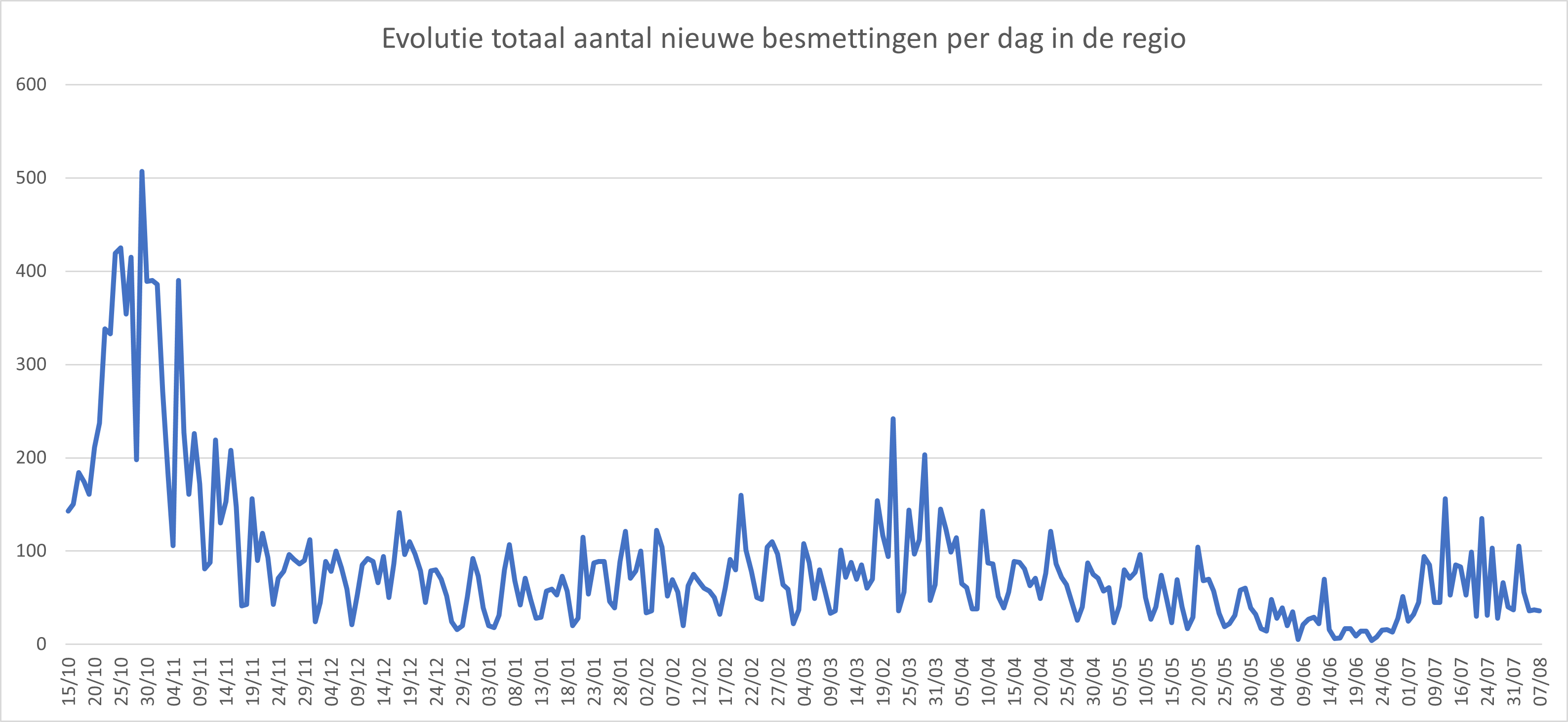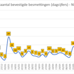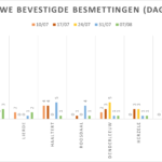 Hieronder een tabel met het aantal bevestigde besmettingen, telkens over een periode van 14 dagen (12 juli 2020 als referentie). Deze en de andere gegevens zetten we in grafieken (bijlagen).