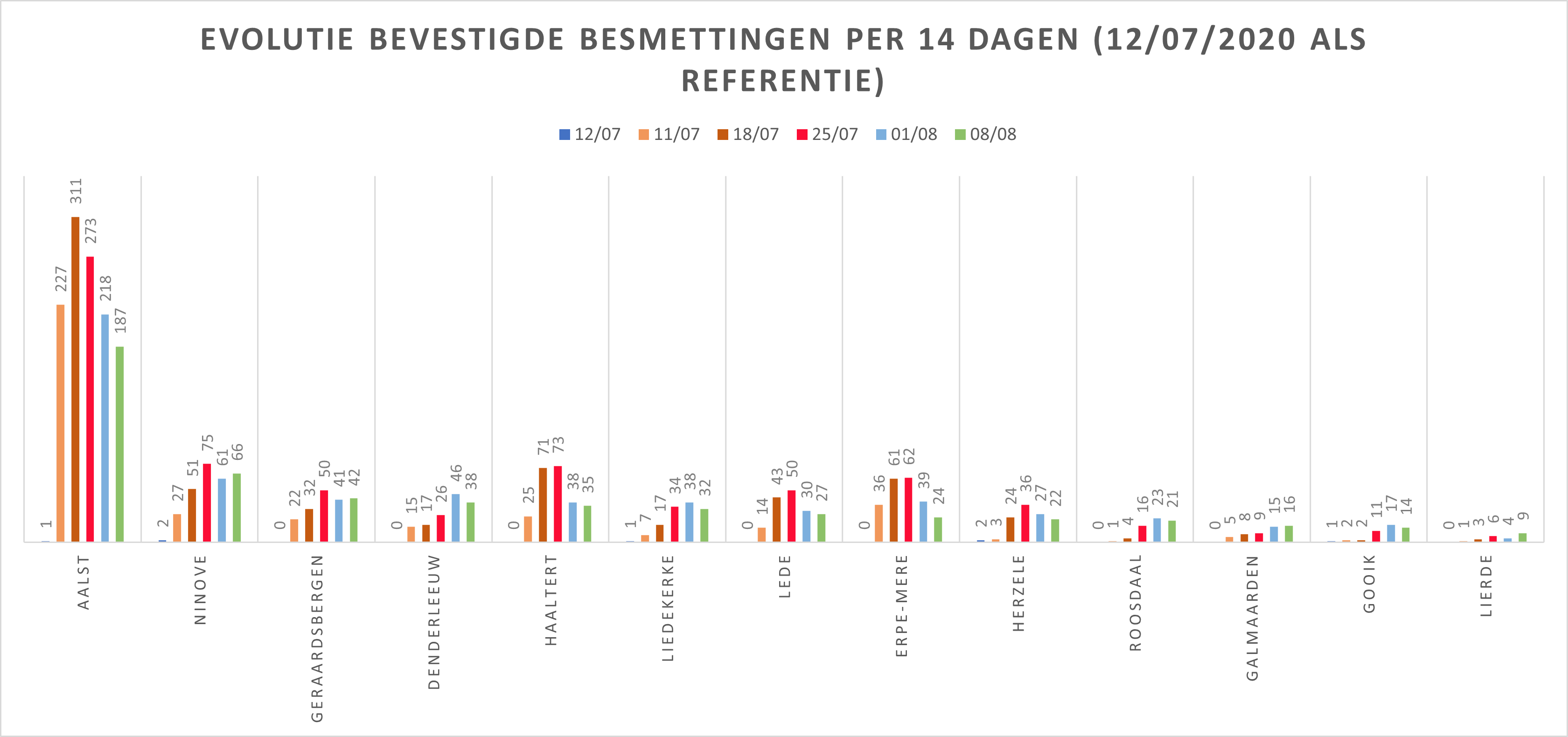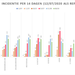 | Aantal bevestigde besmettingen (laatste 14 dagen) – 12/07/2020 als referentie | ||||||