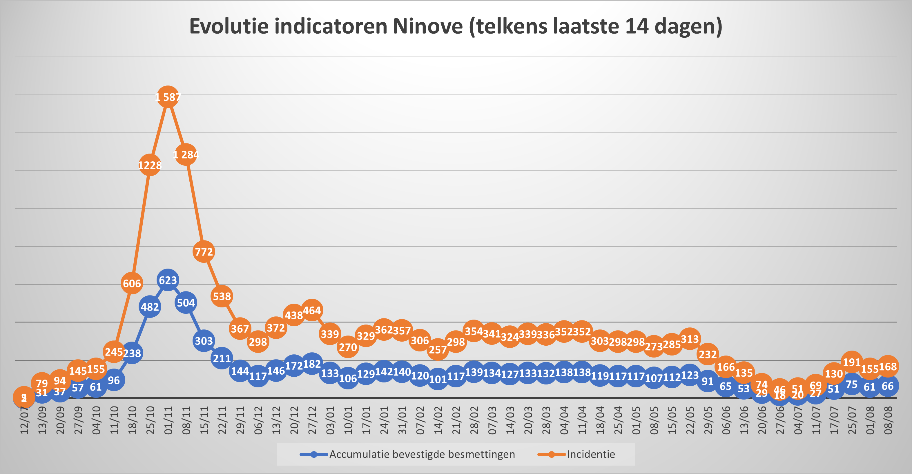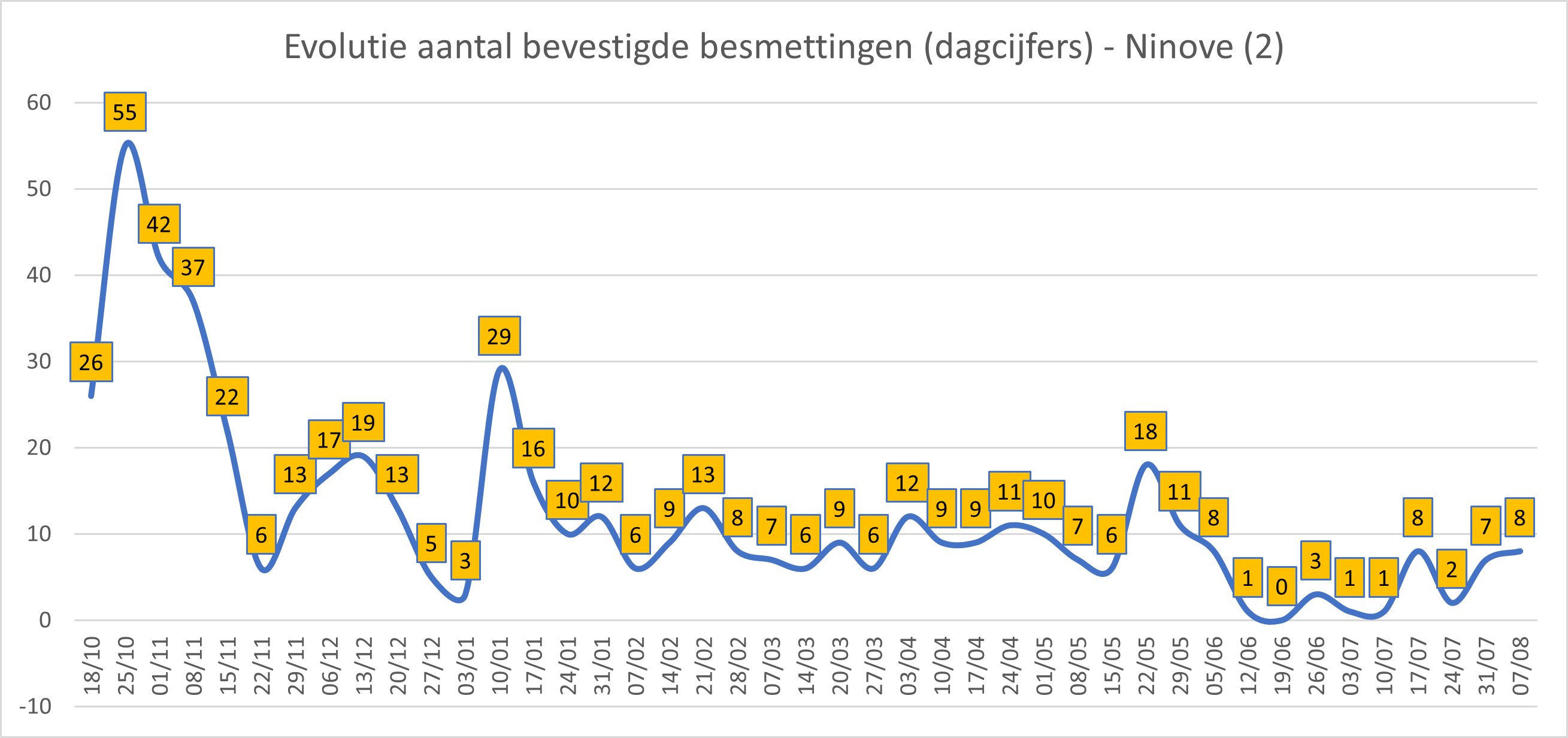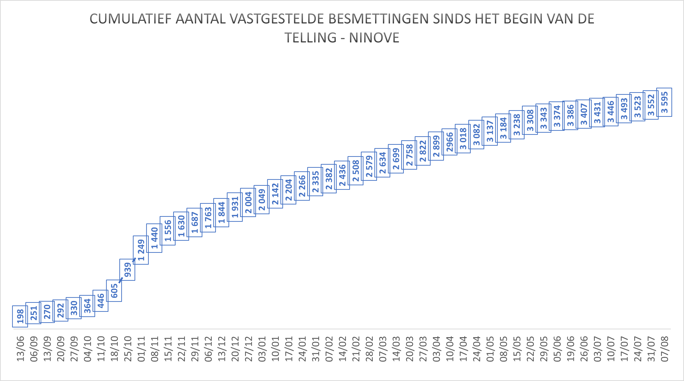 - In totaal zijn in Ninove 3.595 besmettingen genoteerd sinds het begin van de telling.
