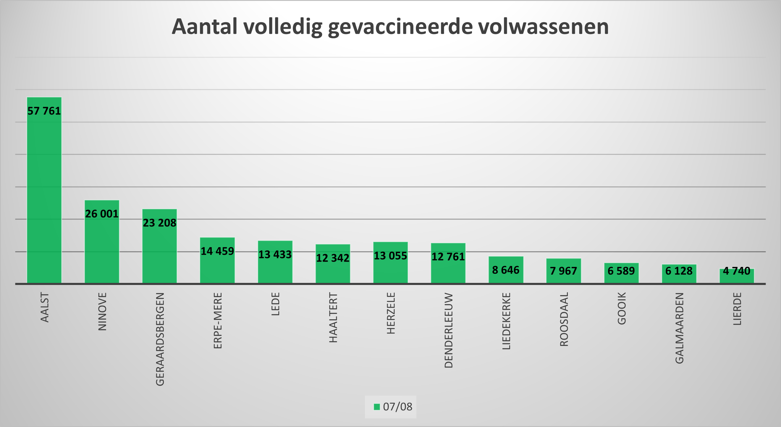 - Tot 07 augustus zijn 26.001 van alle +18-jarigen volledig gevaccineerd. Dat is 82,59 % van die bevolkingsgroep.