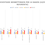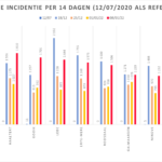 Hieronder een tabel met het aantal bevestigde besmettingen, telkens over een periode van 14 dagen (12 juli 2020 als referentie). Deze en de andere gegevens zetten we in grafieken (bijlagen).