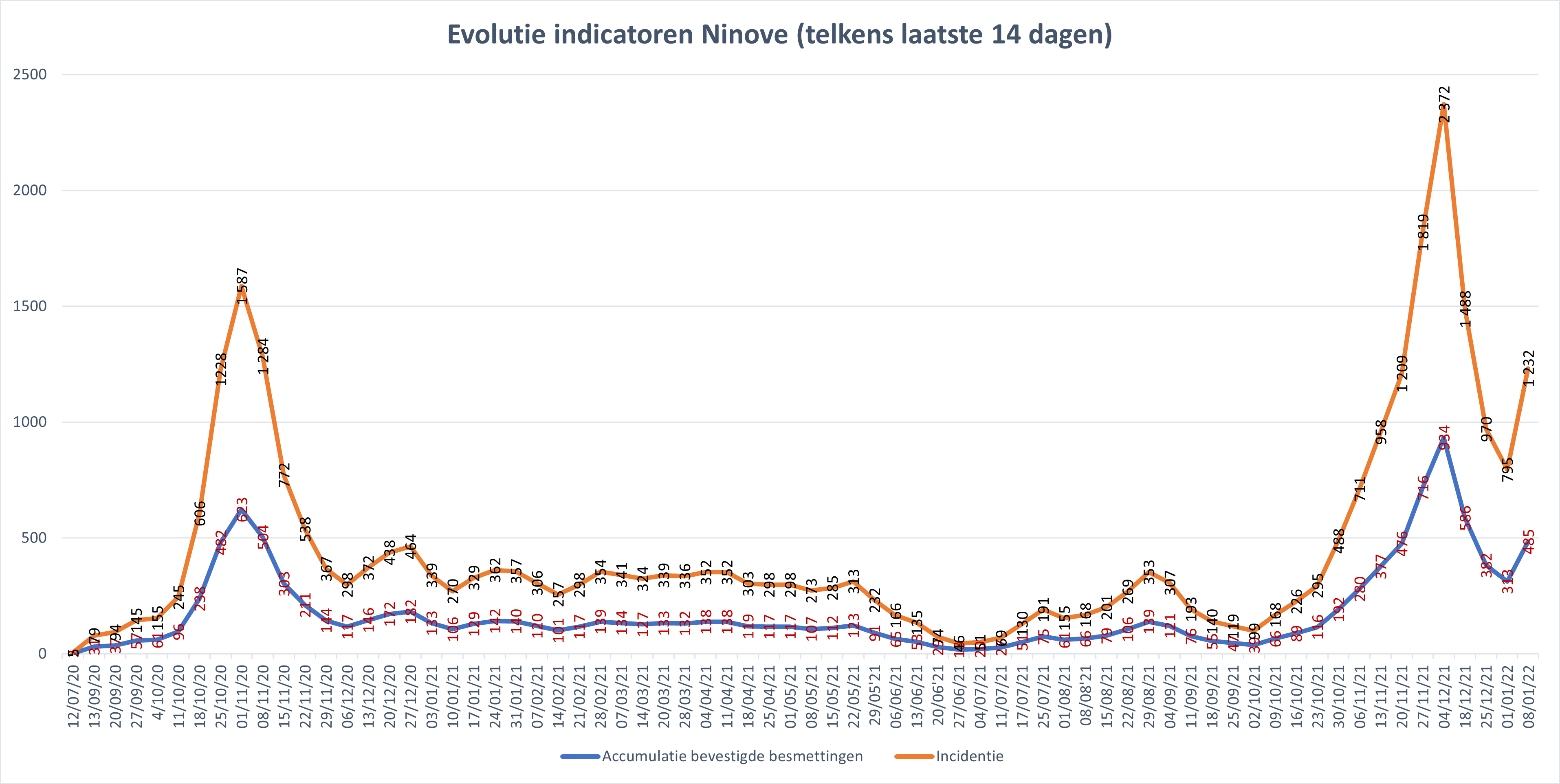 NINOVE – Volgens Sciensano zijn de afgelopen 14 dagen 485 bevestigde besmettingen genoteerd in Ninove. We brengen deze en andere cijfers van de omliggende steden en gemeenten elke week in kaart.