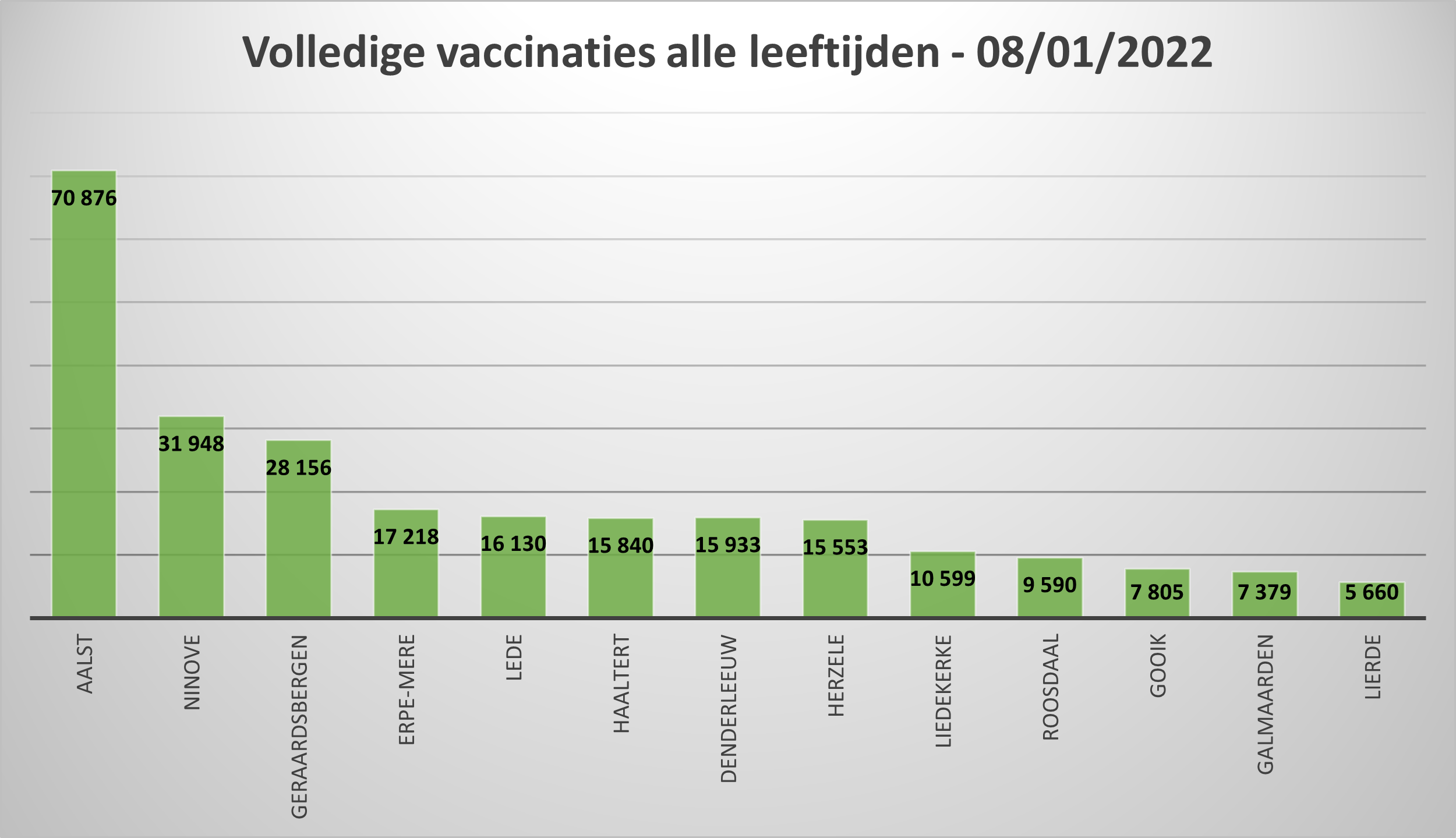 • Tot 08 januari zijn 31.948 (81,15 %) personen van alle leeftijden in Ninove volledig gevaccineerd.