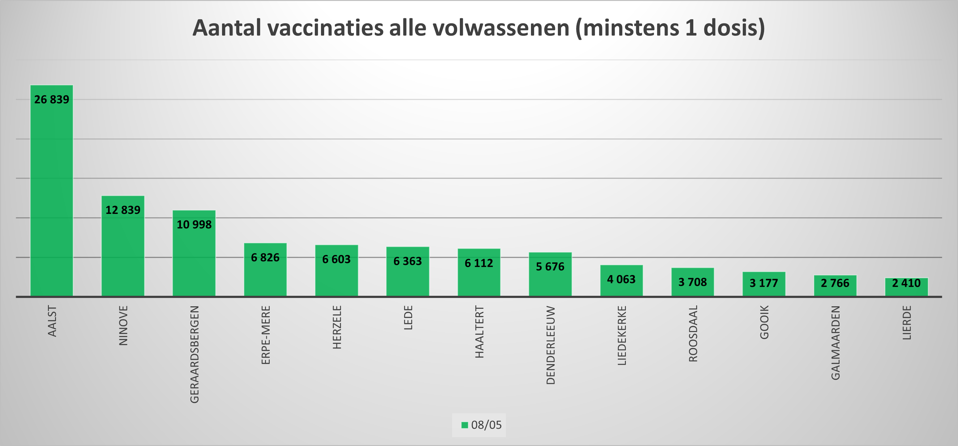 - Tot 08 mei kregen 12.839 van alle +18-jarigen minstens 1 vaccinatieprik. Dat is 40,92 % van die bevolkingsgroep.