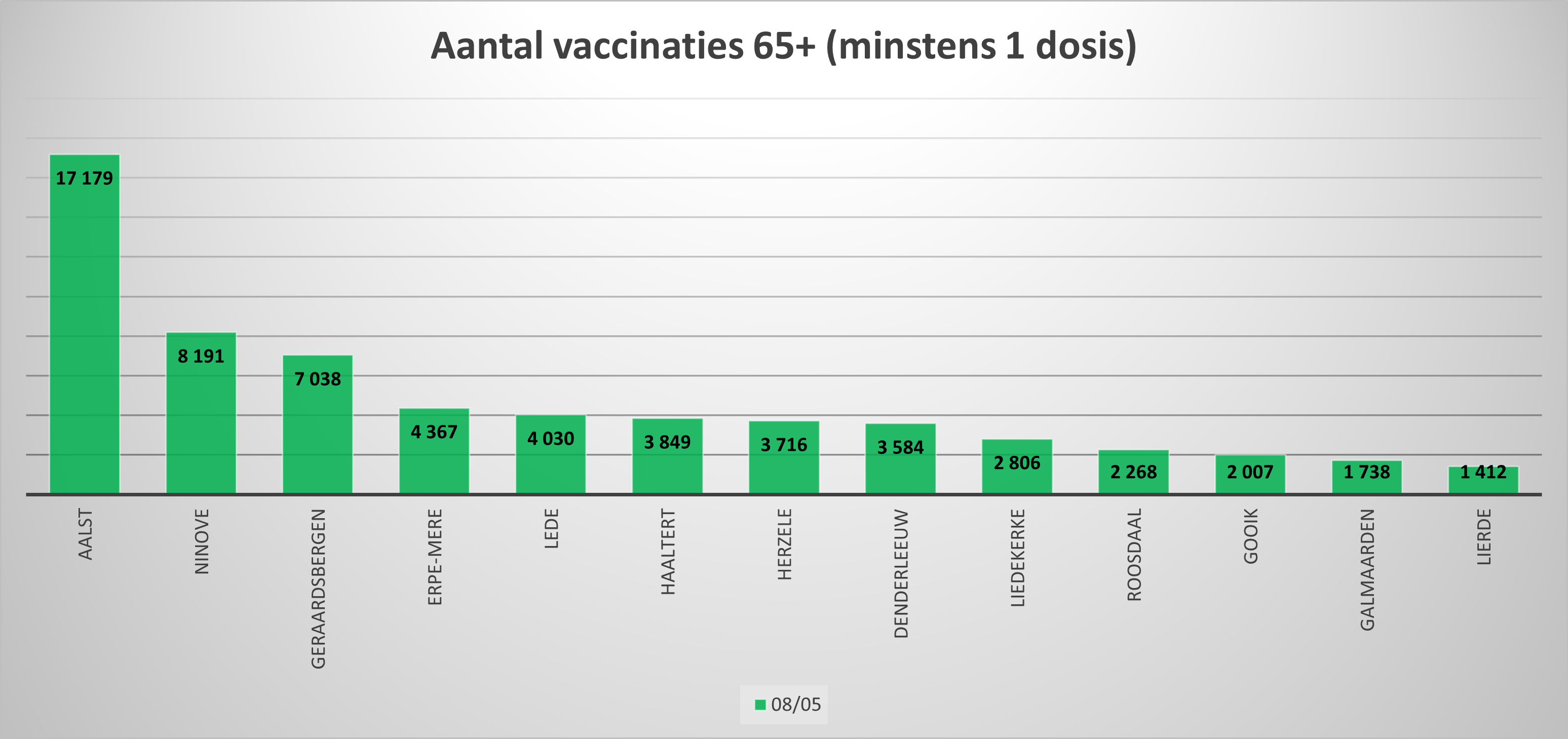 3.429 of 10,93 % van de volwassenen zijn volledig gevaccineerd. - 8.191 vaccins zijn toegediend in de leeftijdsgroep 65+ (ook minstens 1 prik), goed voor 100,73 %.