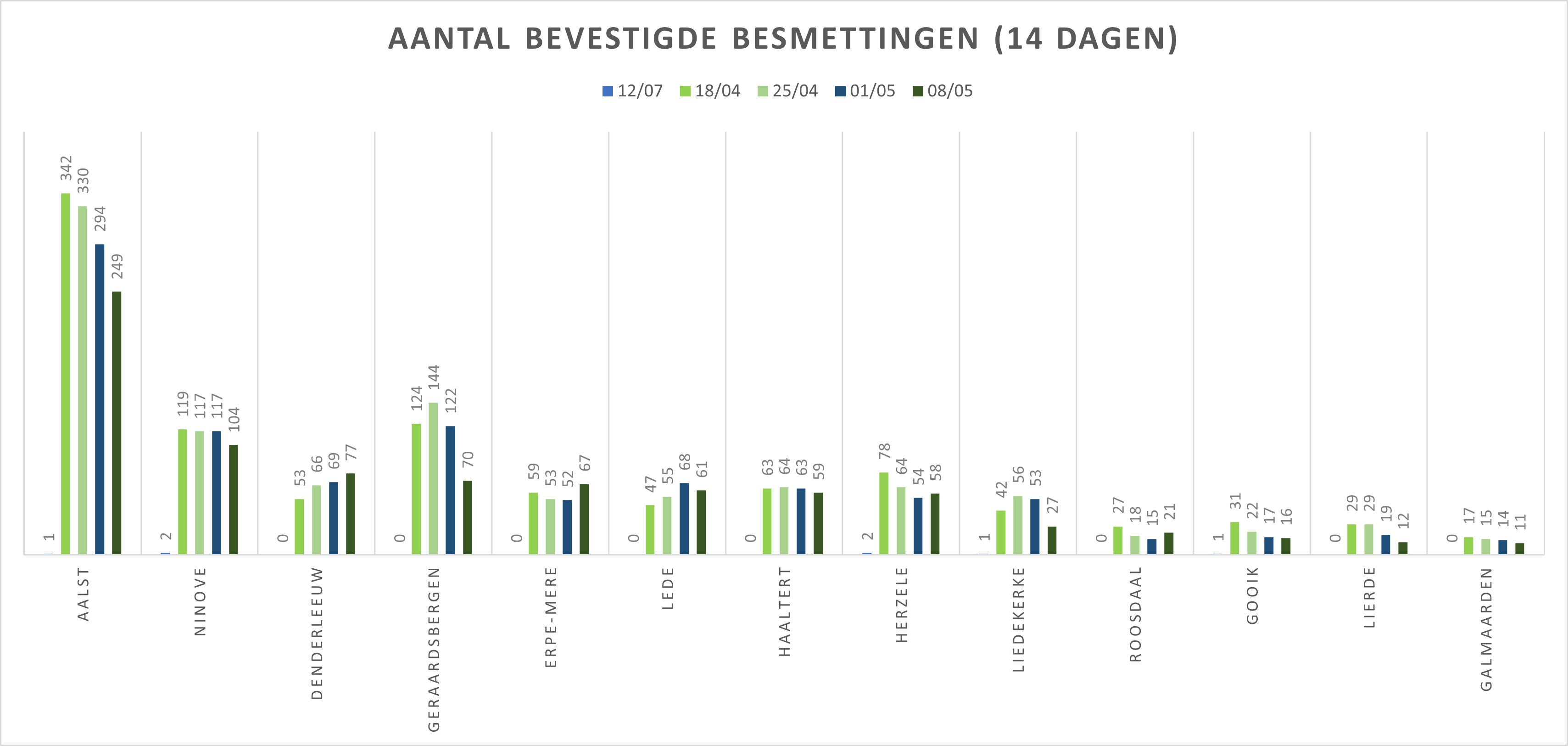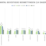 Hieronder een tabel met het aantal bevestigde besmettingen, telkens over een periode van 14 dagen (12 juli 2020 als referentie). Deze en de andere gegevens zetten we in grafieken (bijlagen).