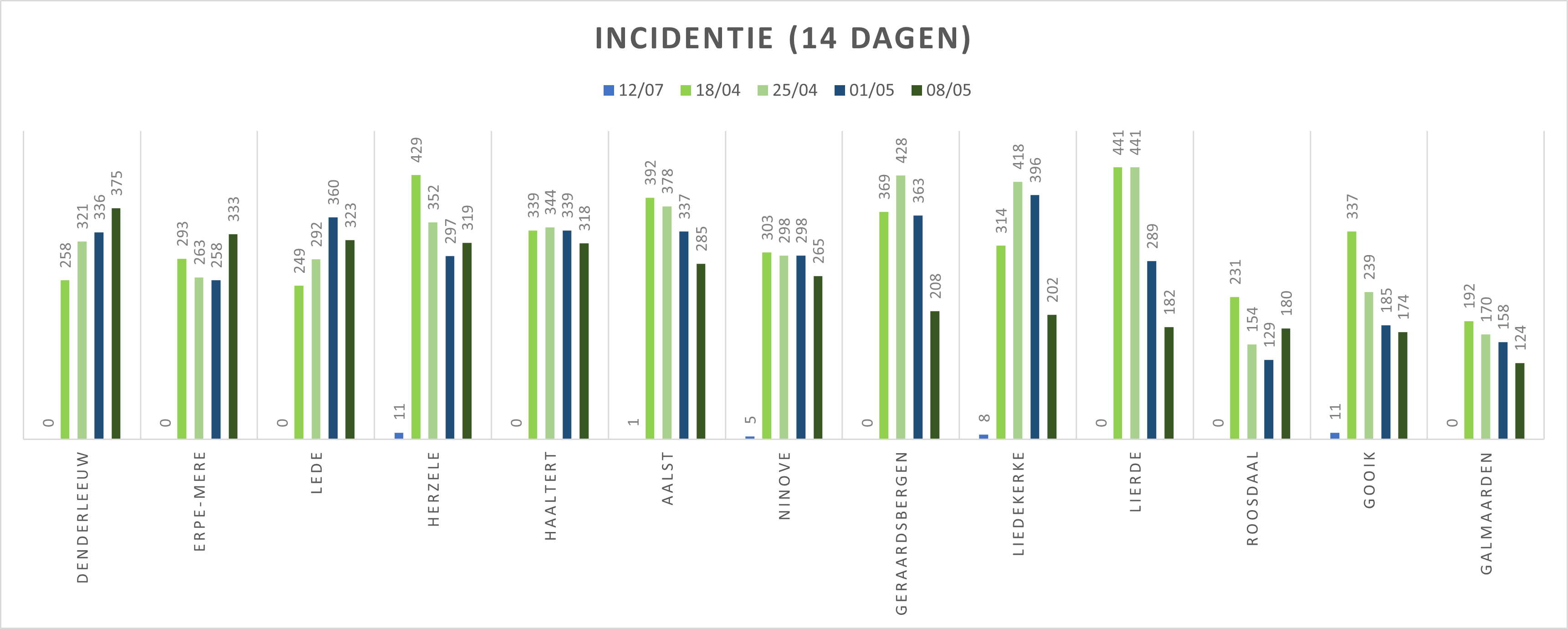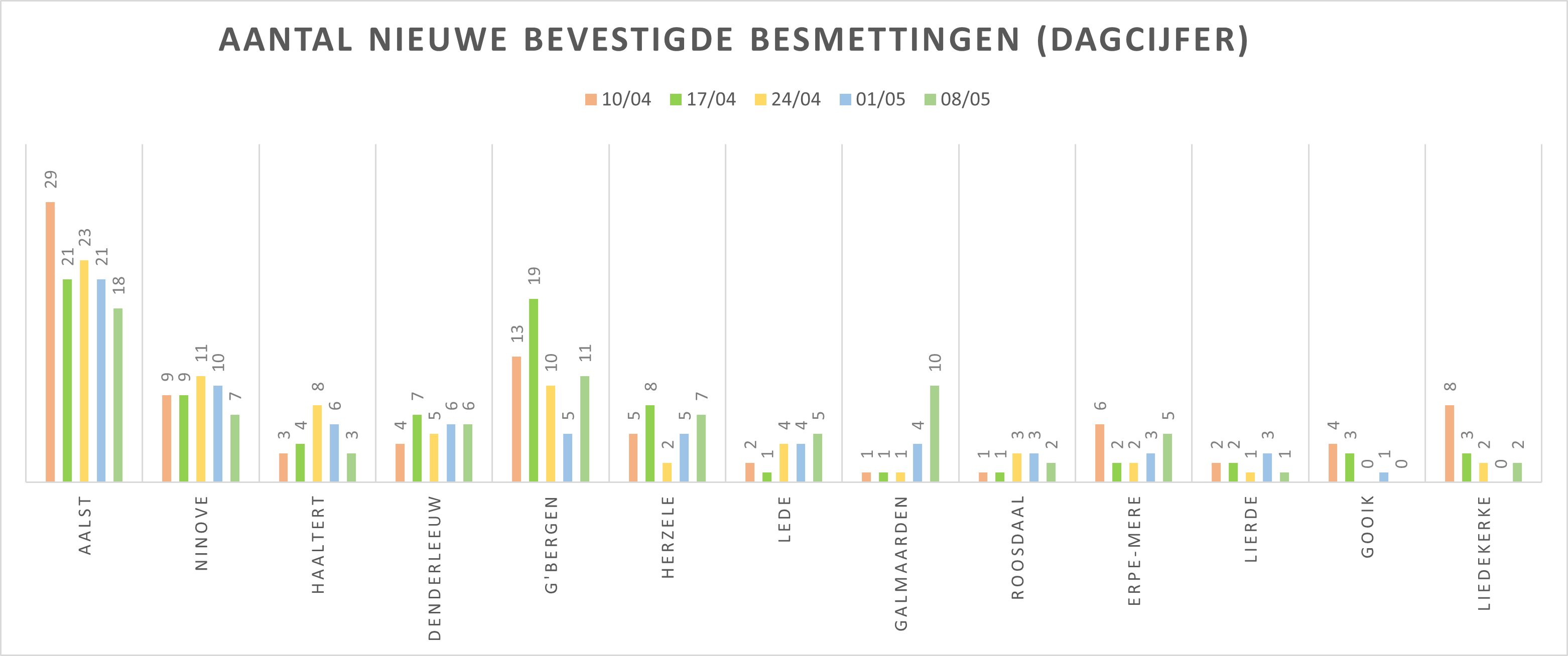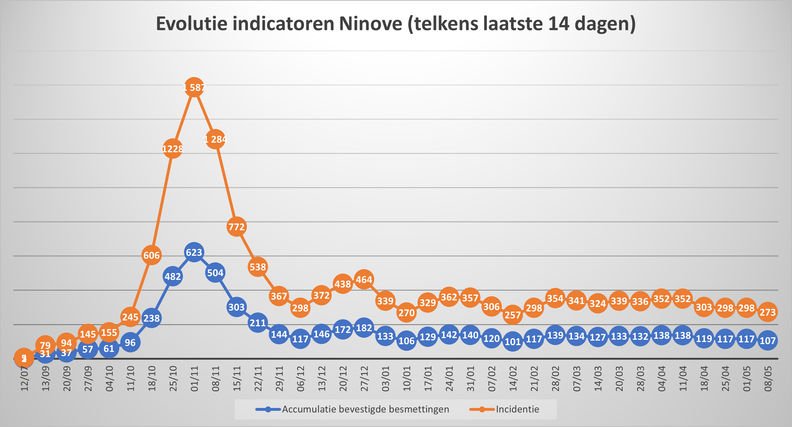 NINOVE – Volgens Sciensano zijn de afgelopen 14 dagen 104 bevestigde besmettingen genoteerd in Ninove. We brengen deze en andere cijfers van de omliggende steden en gemeenten elke week in kaart.