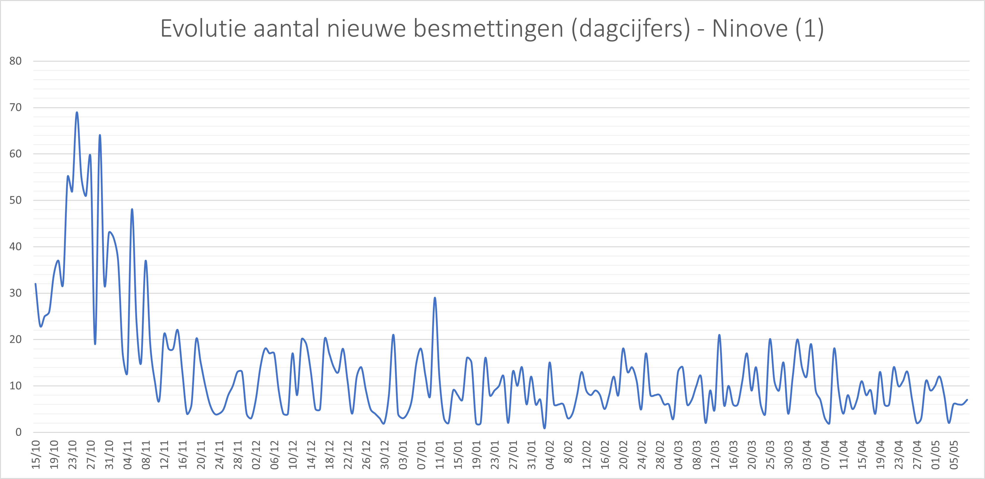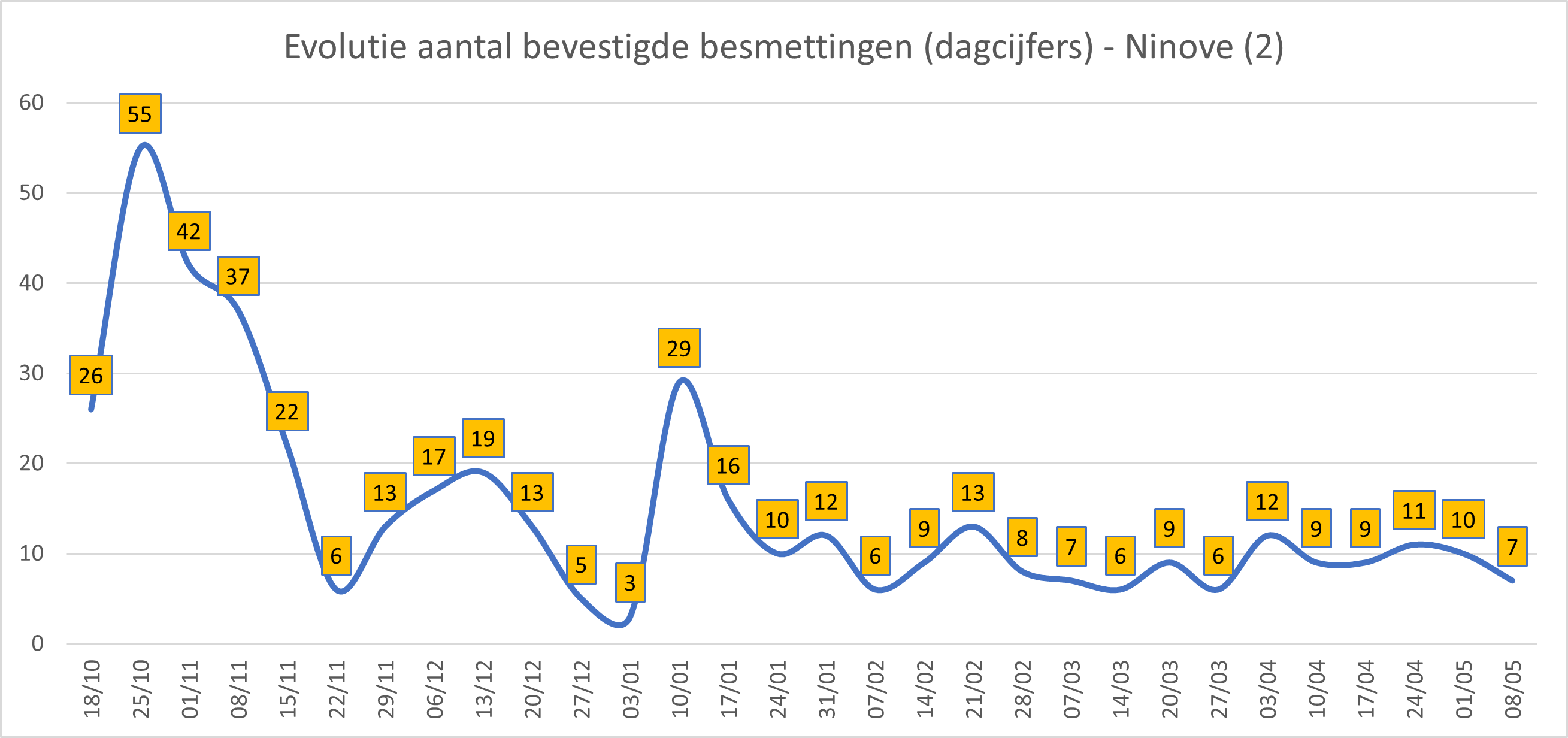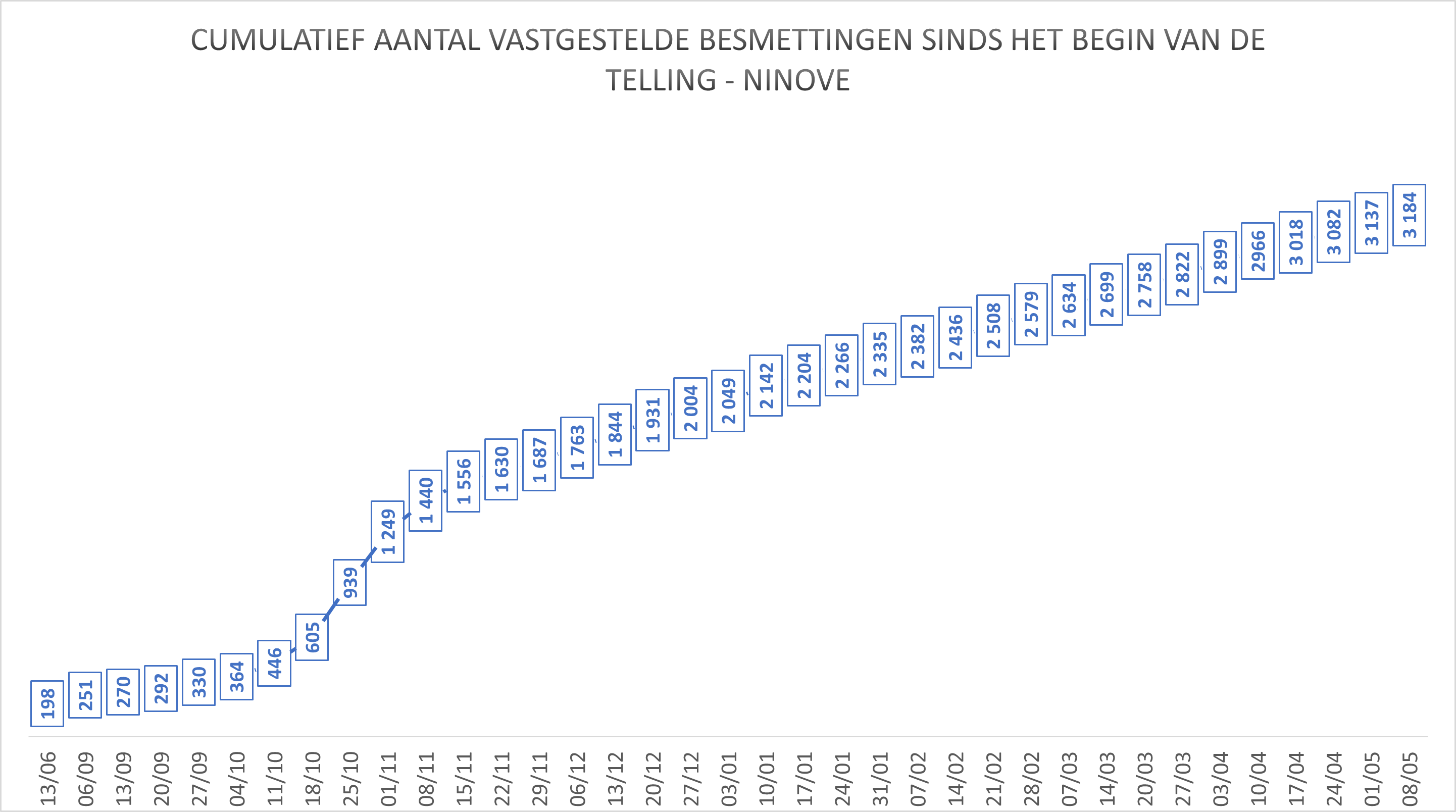 - In totaal zijn in Ninove 3.184 besmettingen genoteerd sinds het begin van de telling.