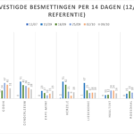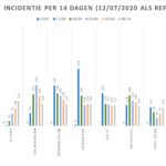 Hieronder een tabel met het aantal bevestigde besmettingen, telkens over een periode van 14 dagen (12 juli 2020 als referentie). Deze en de andere gegevens zetten we in grafieken (bijlagen).