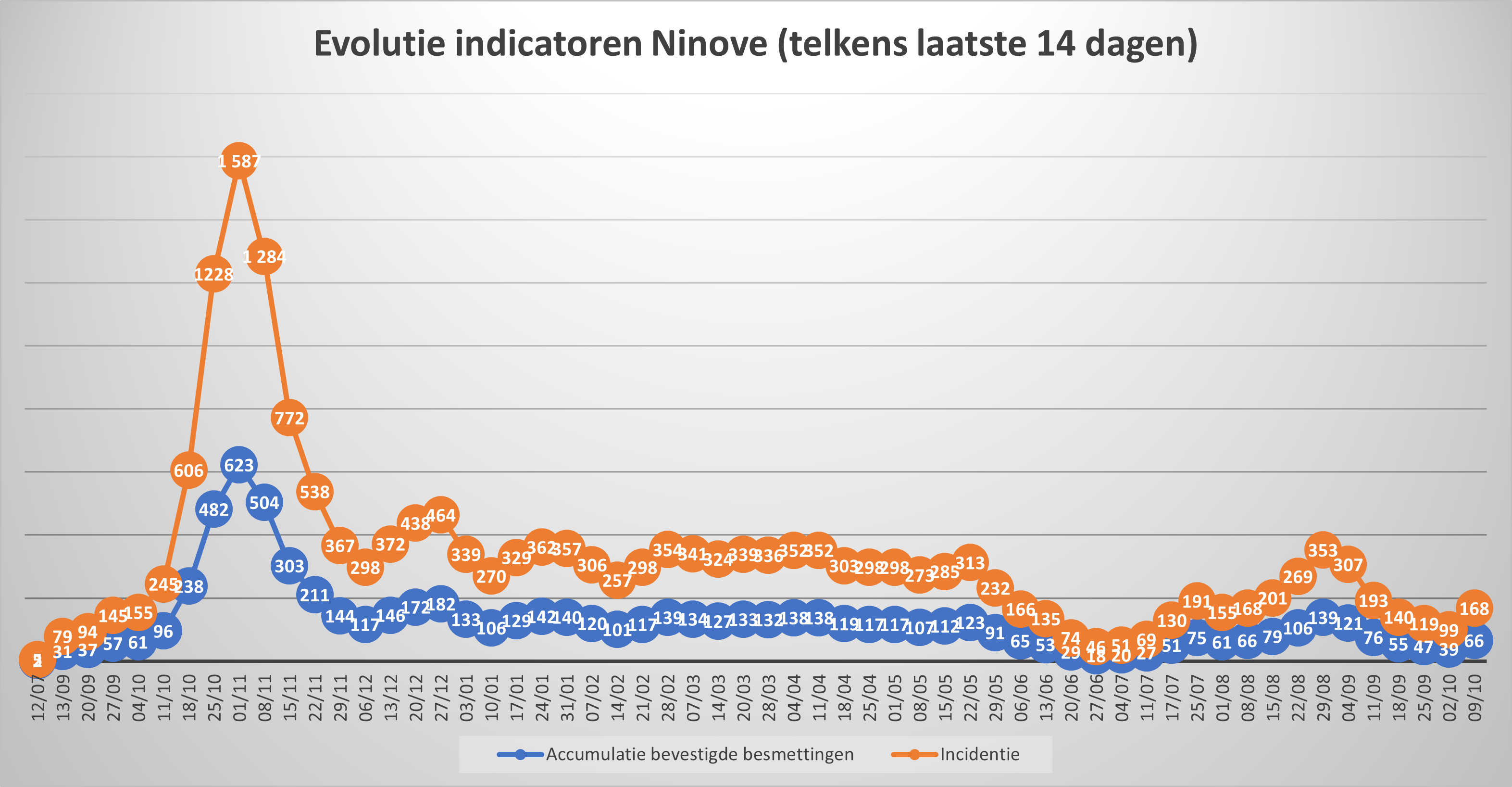 NINOVE – Volgens Sciensano zijn de afgelopen 14 dagen 66 bevestigde besmettingen genoteerd in Ninove. We brengen deze en andere cijfers van de omliggende steden en gemeenten elke week in kaart.