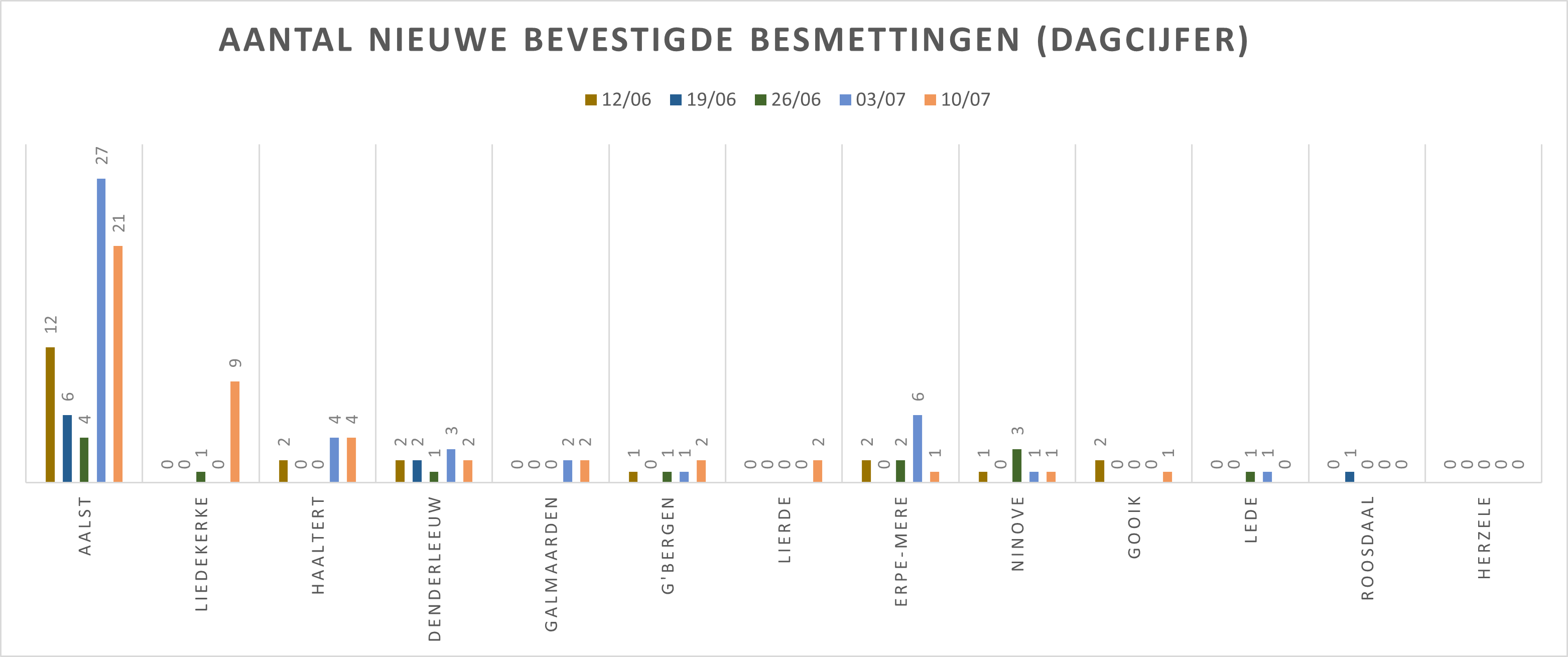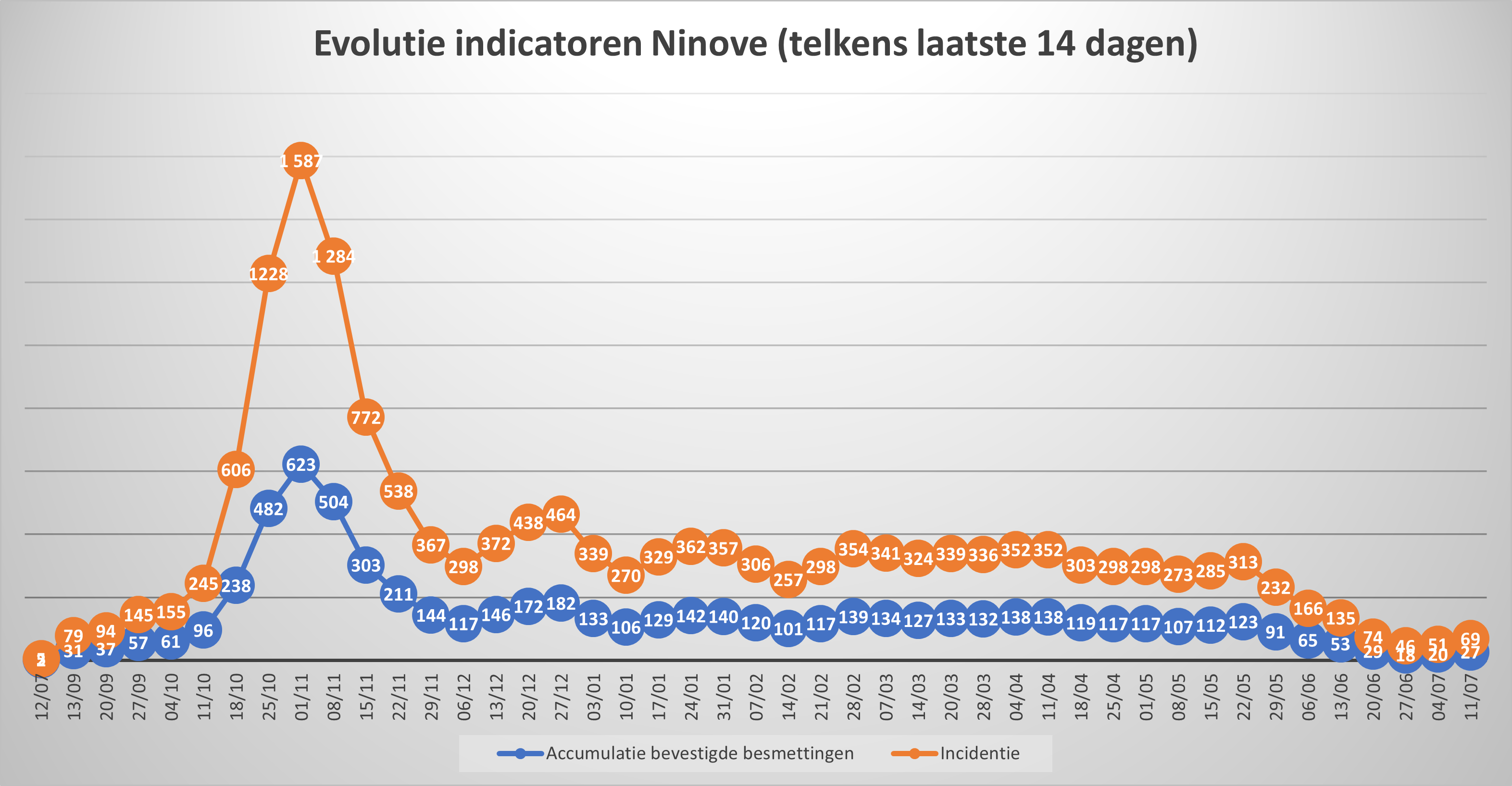 NINOVE – Volgens Sciensano zijn de afgelopen 14 dagen 27 bevestigde besmettingen genoteerd in Ninove. We brengen deze en andere cijfers van de omliggende steden en gemeenten elke week in kaart.