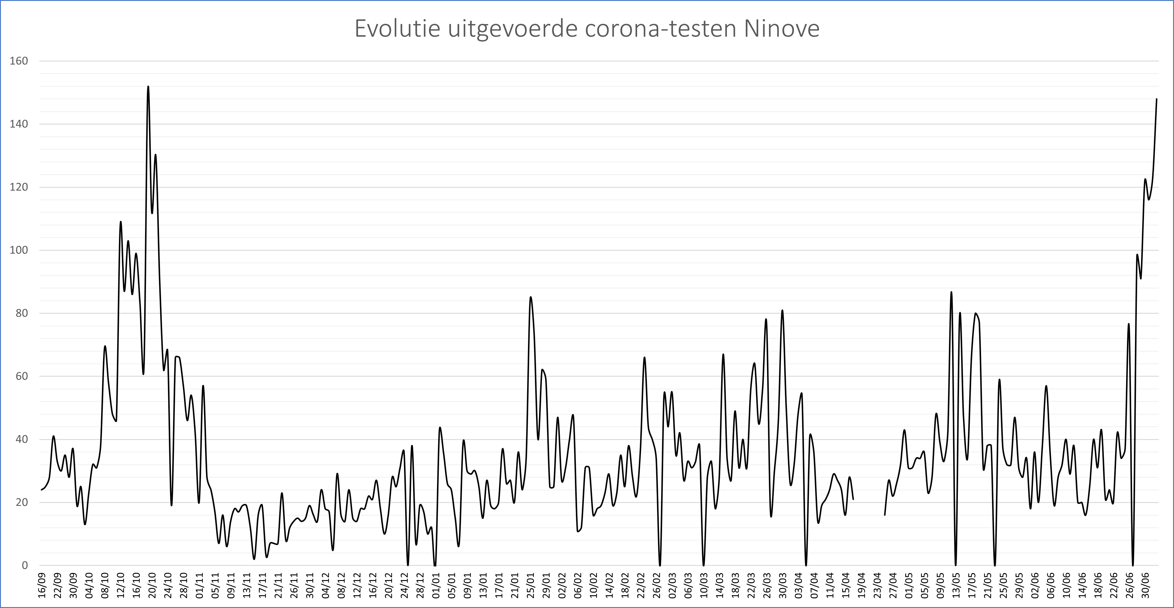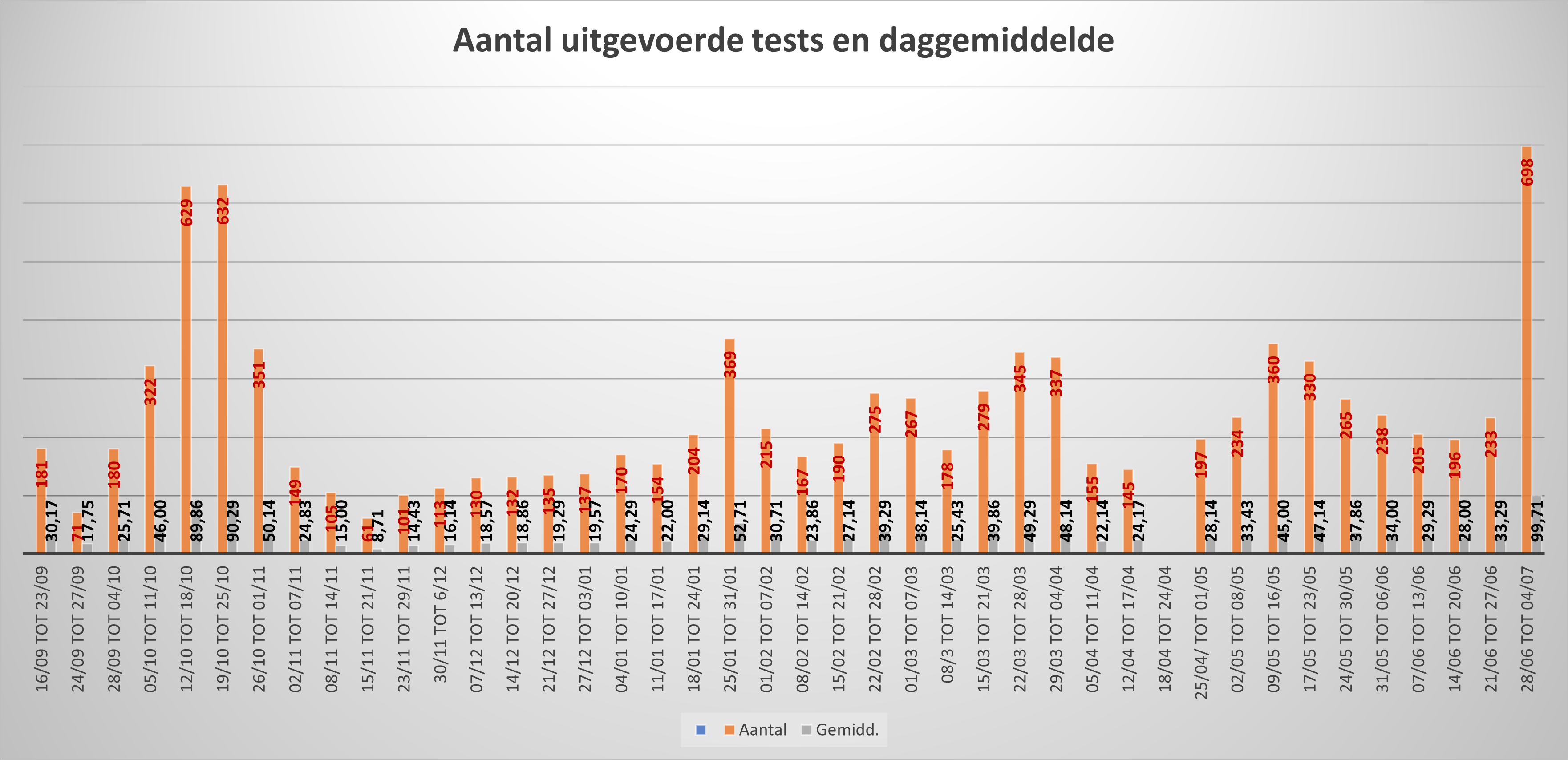 • In de week van 28/06 tot 04/07 gebeurden 698 corona-testen, gemiddeld 99,71 per dag.