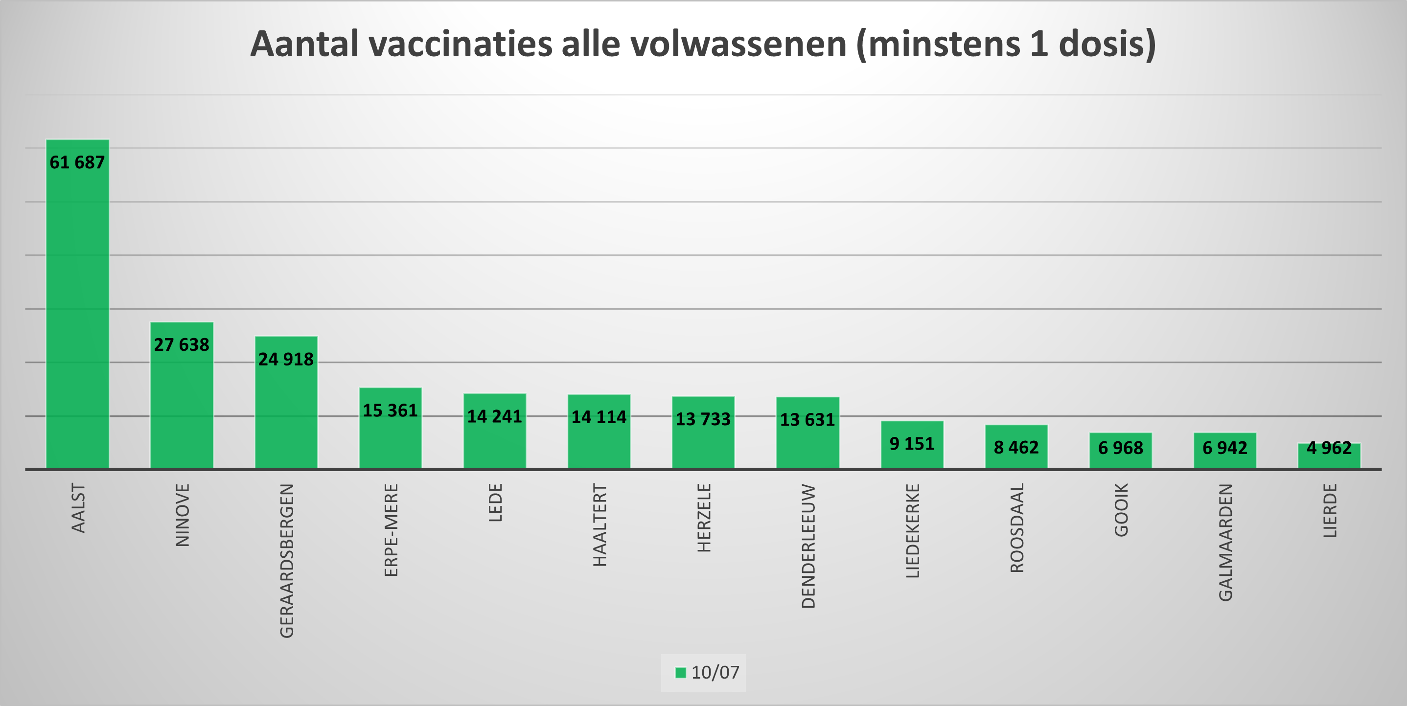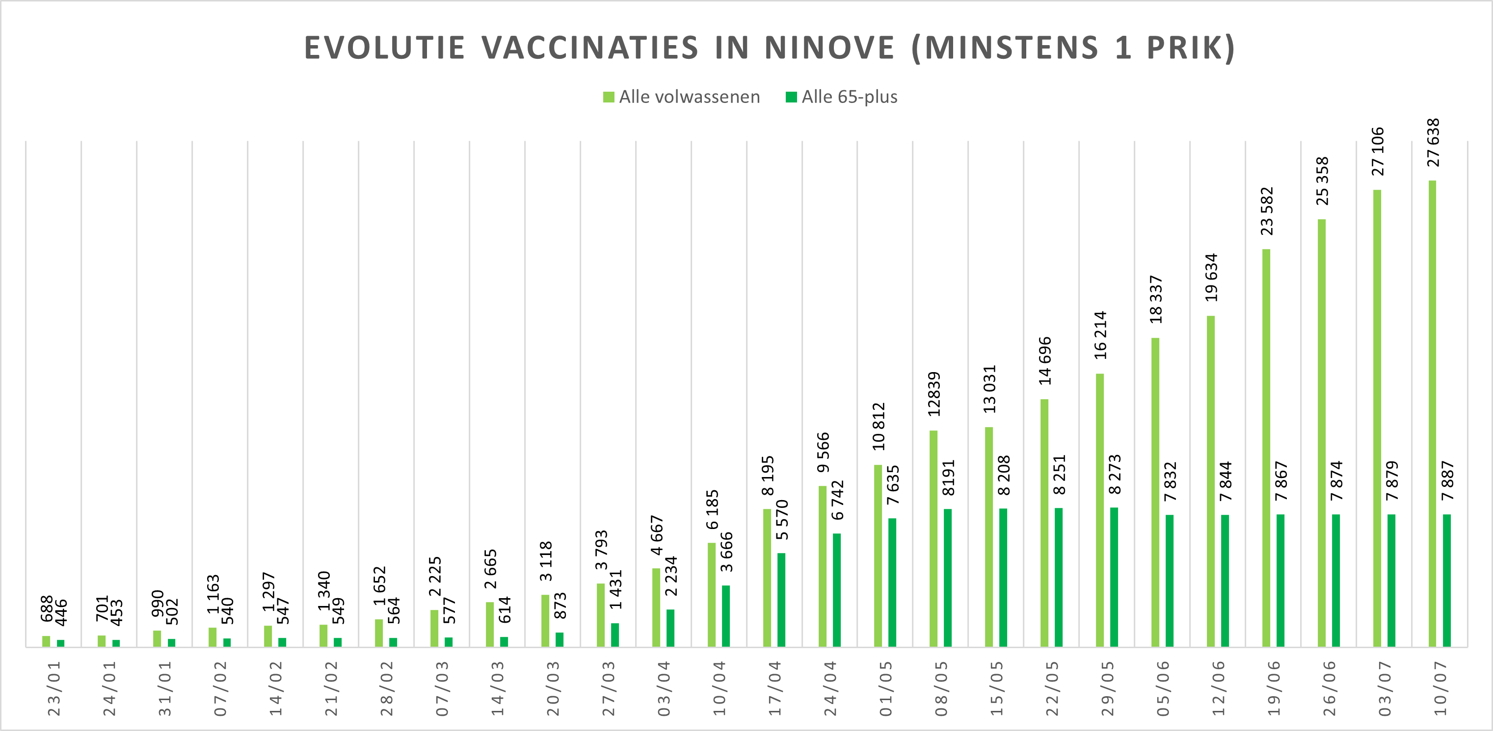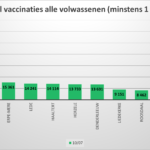 • Tot 10 juli kregen 27.638 van alle +18-jarigen minstens 1 vaccinatieprik. Dat is 87,79 % van die bevolkingsgroep.