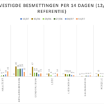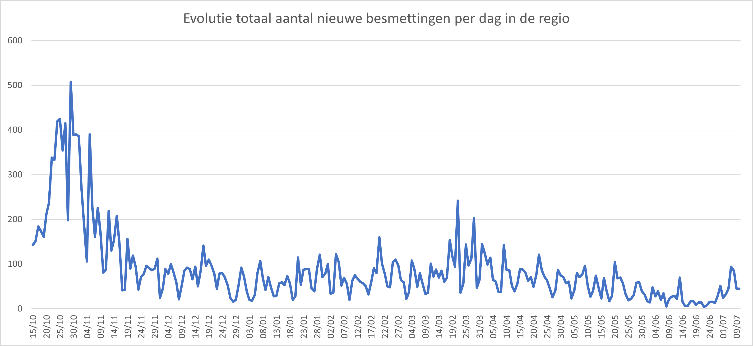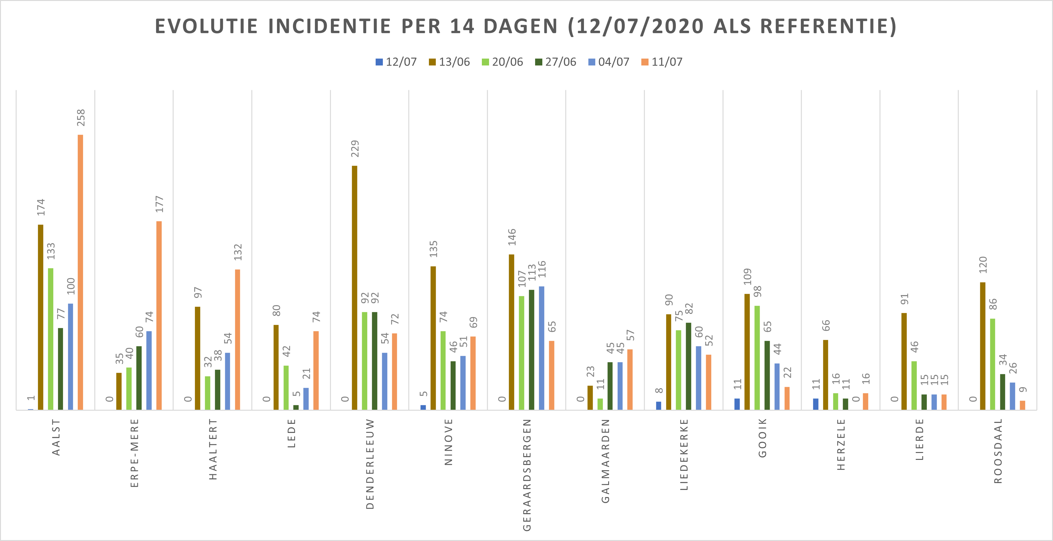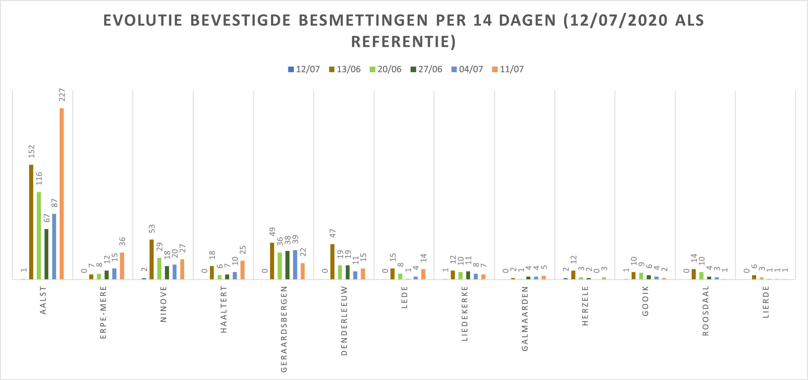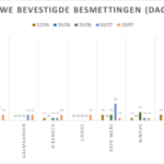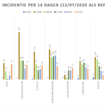 Hieronder een tabel met het aantal bevestigde besmettingen, telkens over een periode van 14 dagen (12 juli 2020 als referentie). Deze en de andere gegevens zetten we in grafieken (bijlagen).