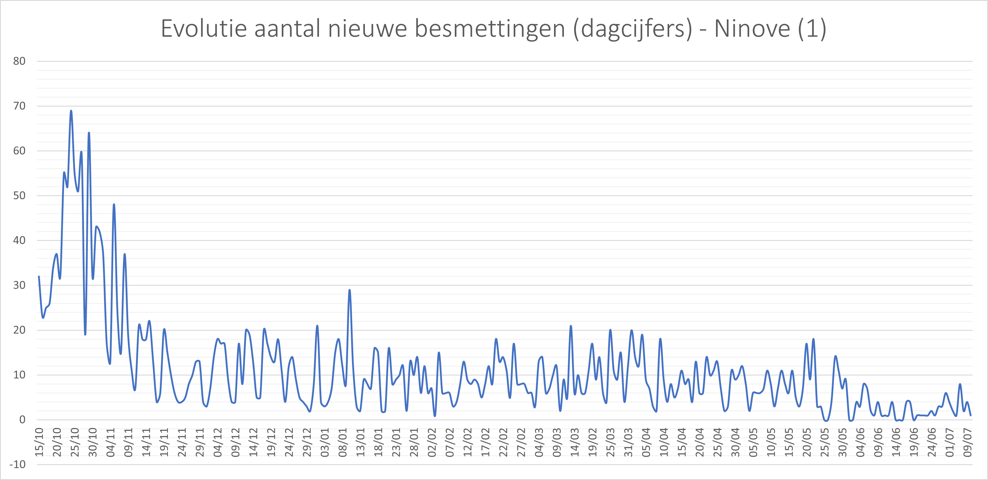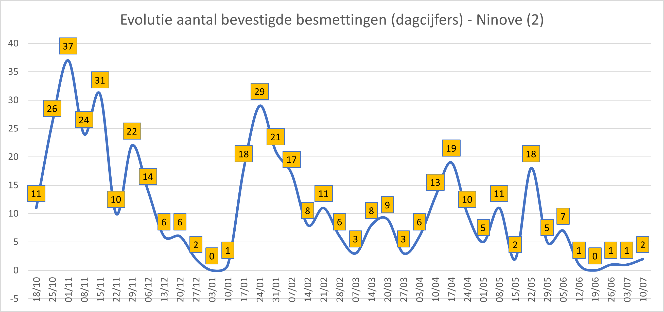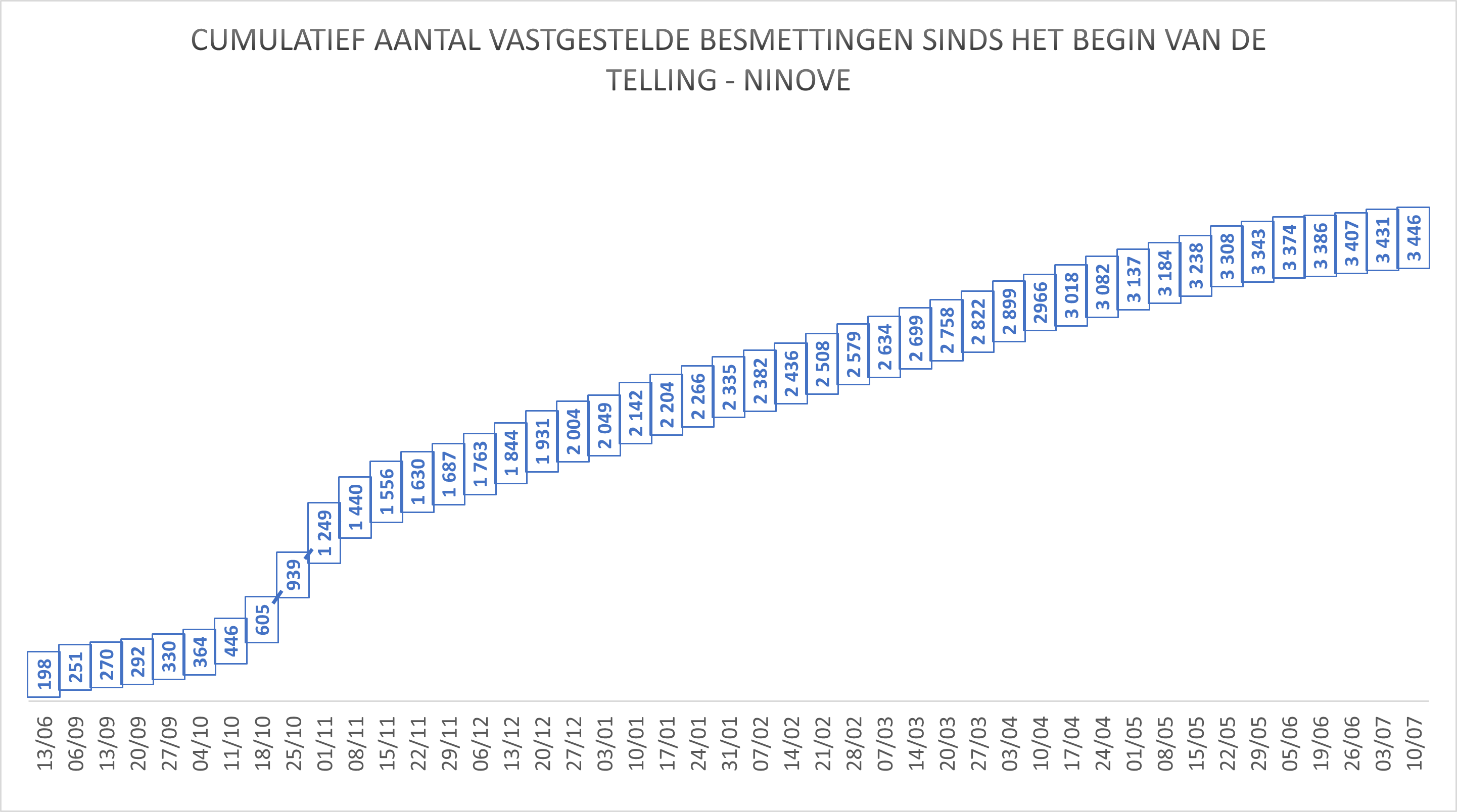 • In totaal zijn in Ninove 3.446 besmettingen genoteerd sinds het begin van de telling.