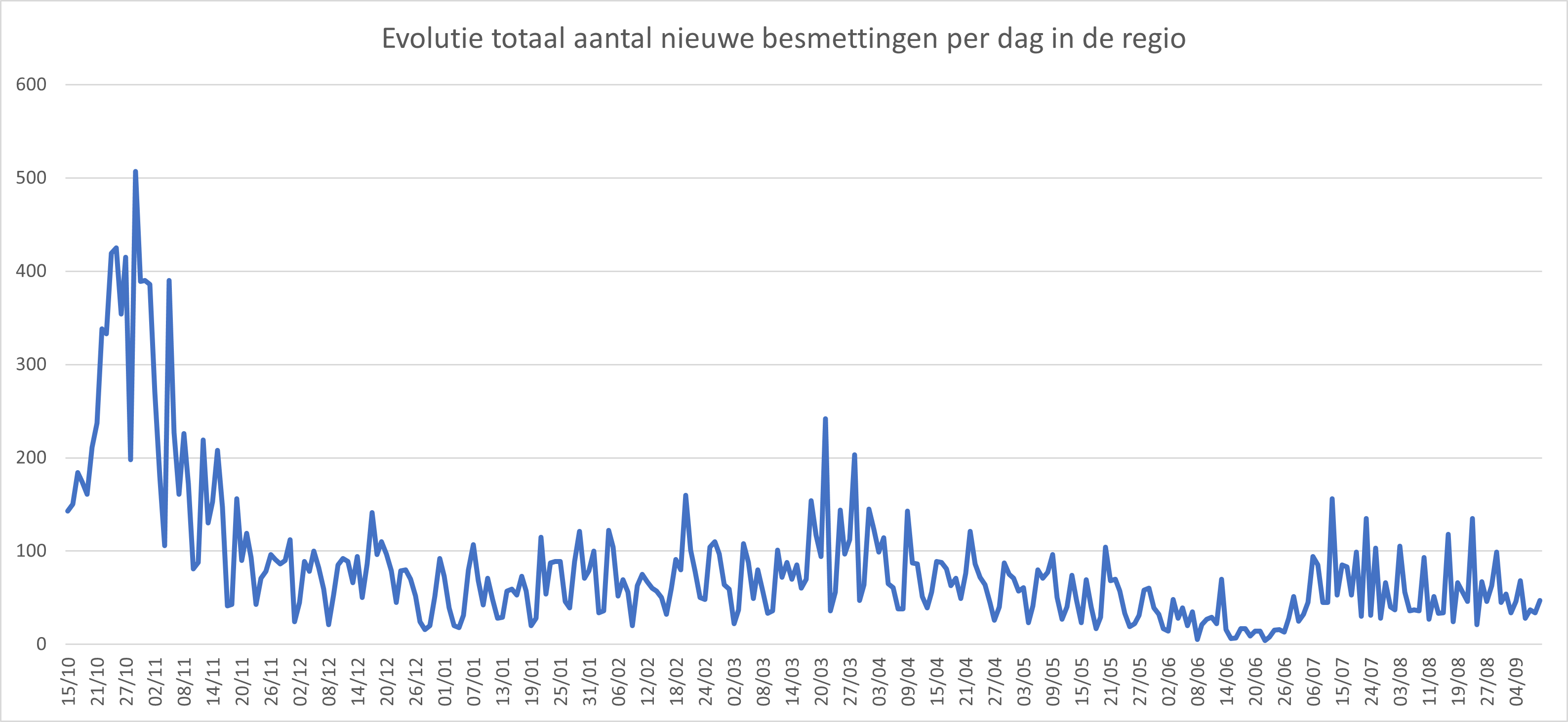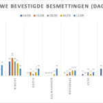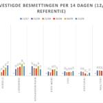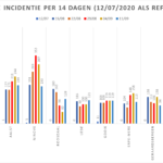 Hieronder een tabel met het aantal bevestigde besmettingen, telkens over een periode van 14 dagen (12 juli 2020 als referentie). Deze en de andere gegevens zetten we in grafieken (bijlagen).