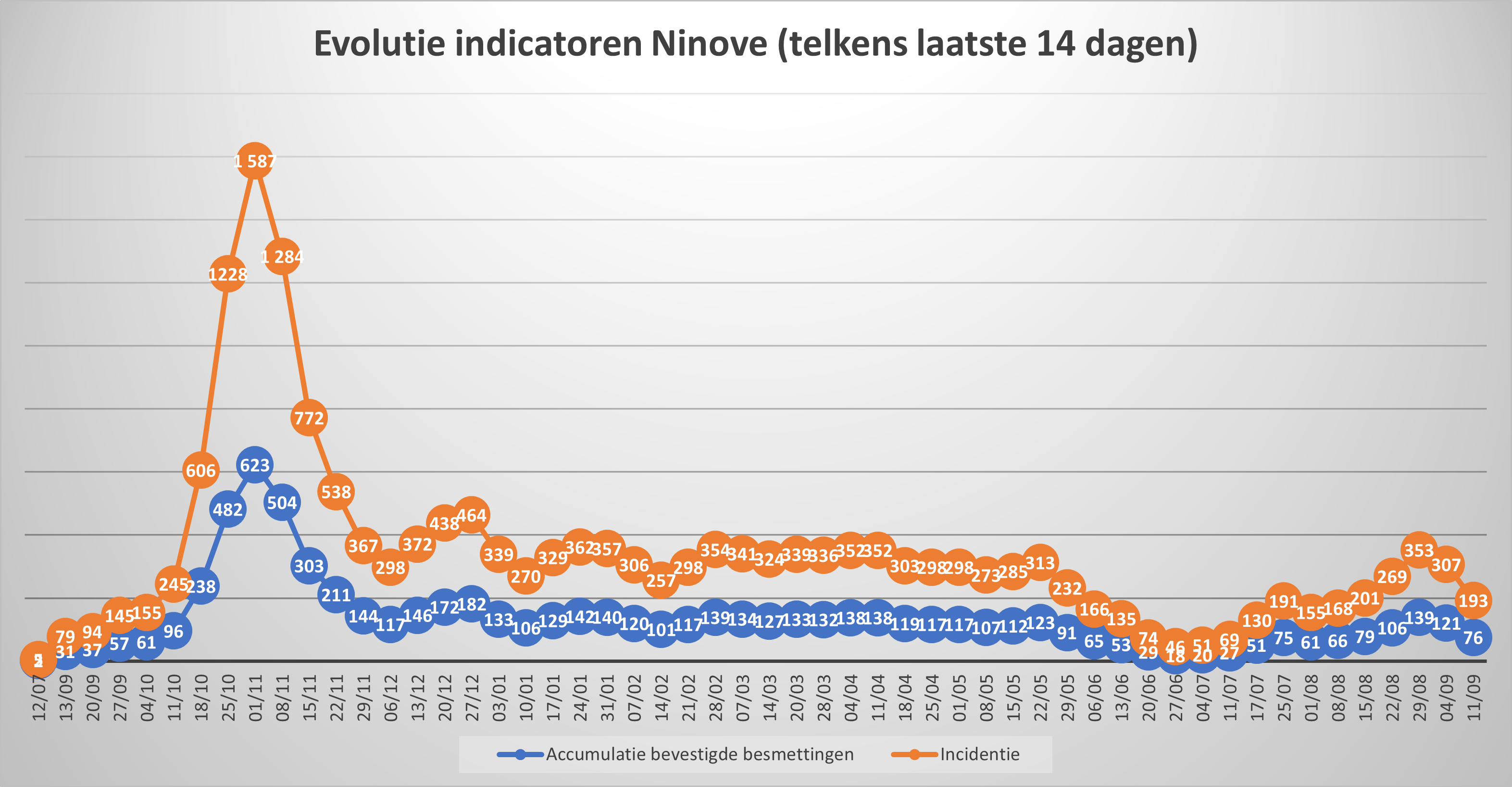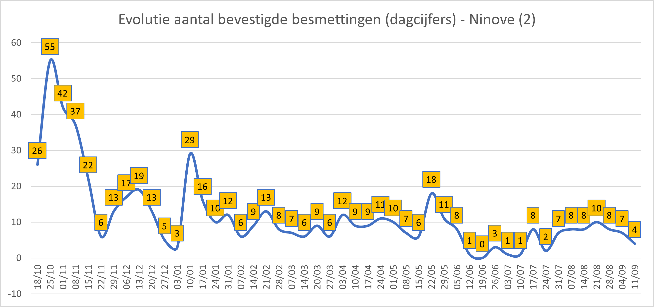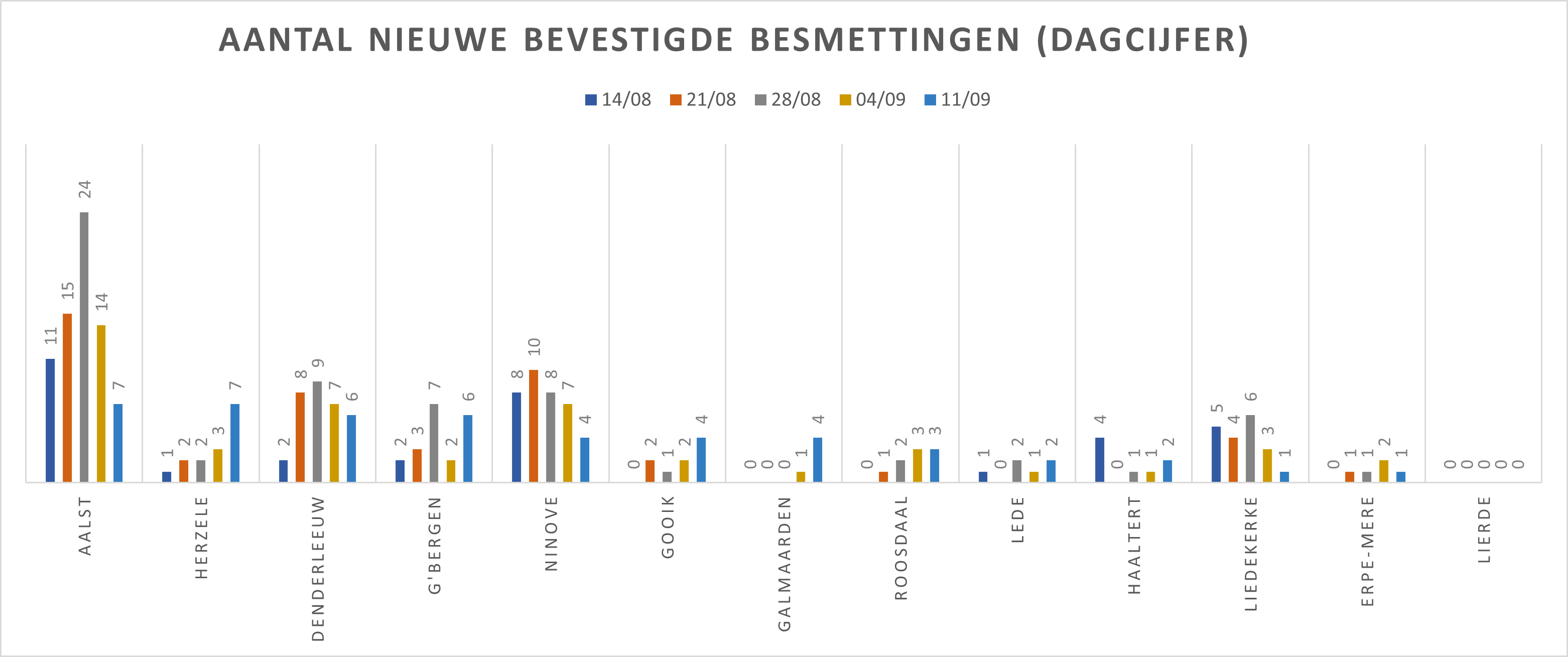 NINOVE – Volgens Sciensano zijn de afgelopen 14 dagen 76 bevestigde besmettingen genoteerd in Ninove. We brengen deze en andere cijfers van de omliggende steden en gemeenten elke week in kaart.