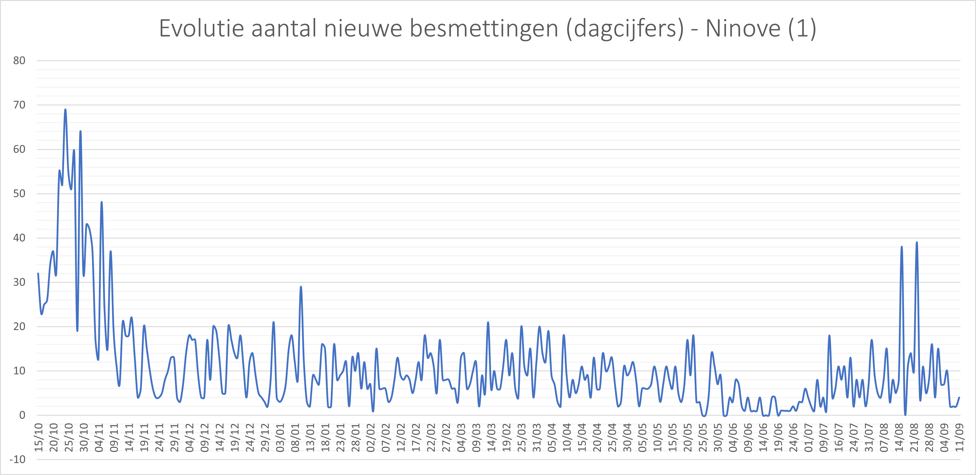 - In totaal zijn in Ninove 3.844 besmettingen genoteerd sinds het begin van de telling.
