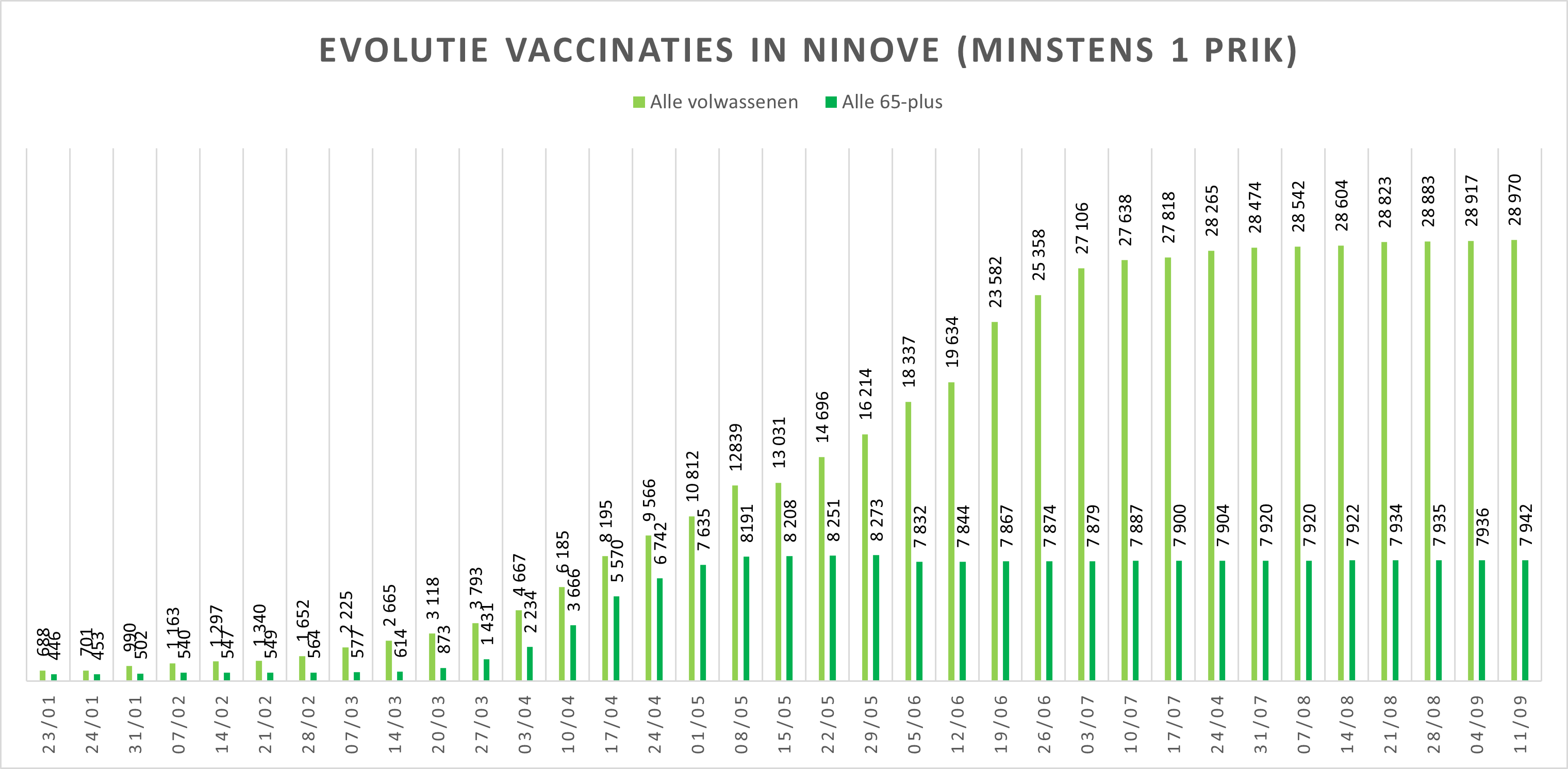 - 7.896 of 95,79 % van de 65-plussers zijn tot 11 september eveneens volledig gevaccineerd.