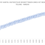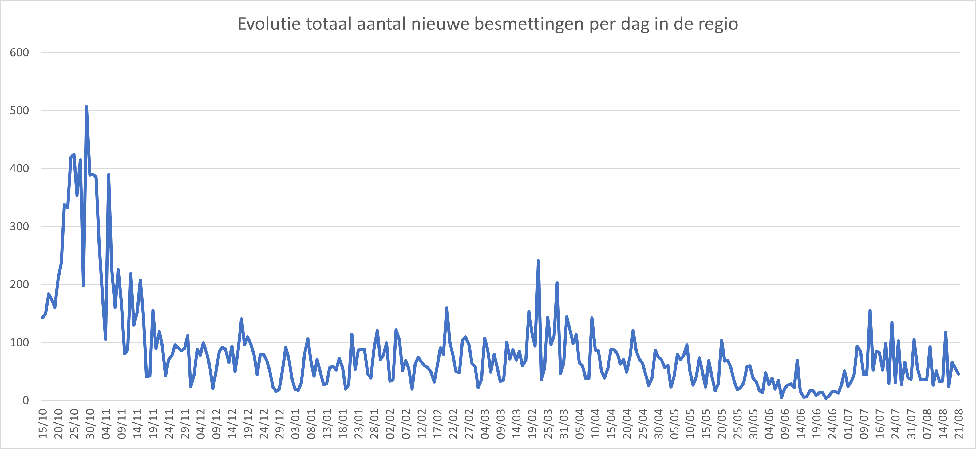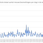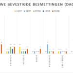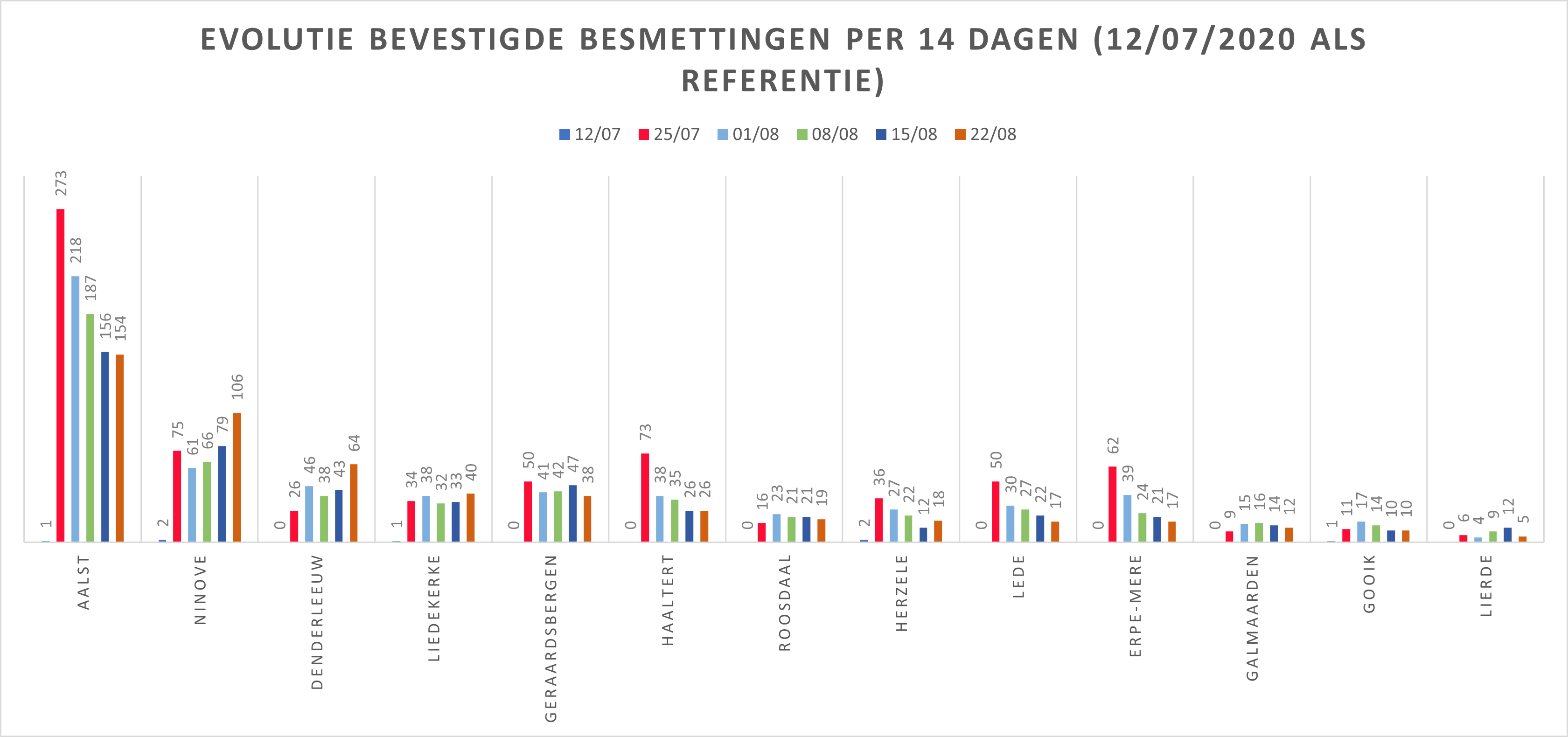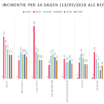 Hieronder een tabel met het aantal bevestigde besmettingen, telkens over een periode van 14 dagen (12 juli 2020 als referentie). Deze en de andere gegevens zetten we in grafieken (bijlagen).
