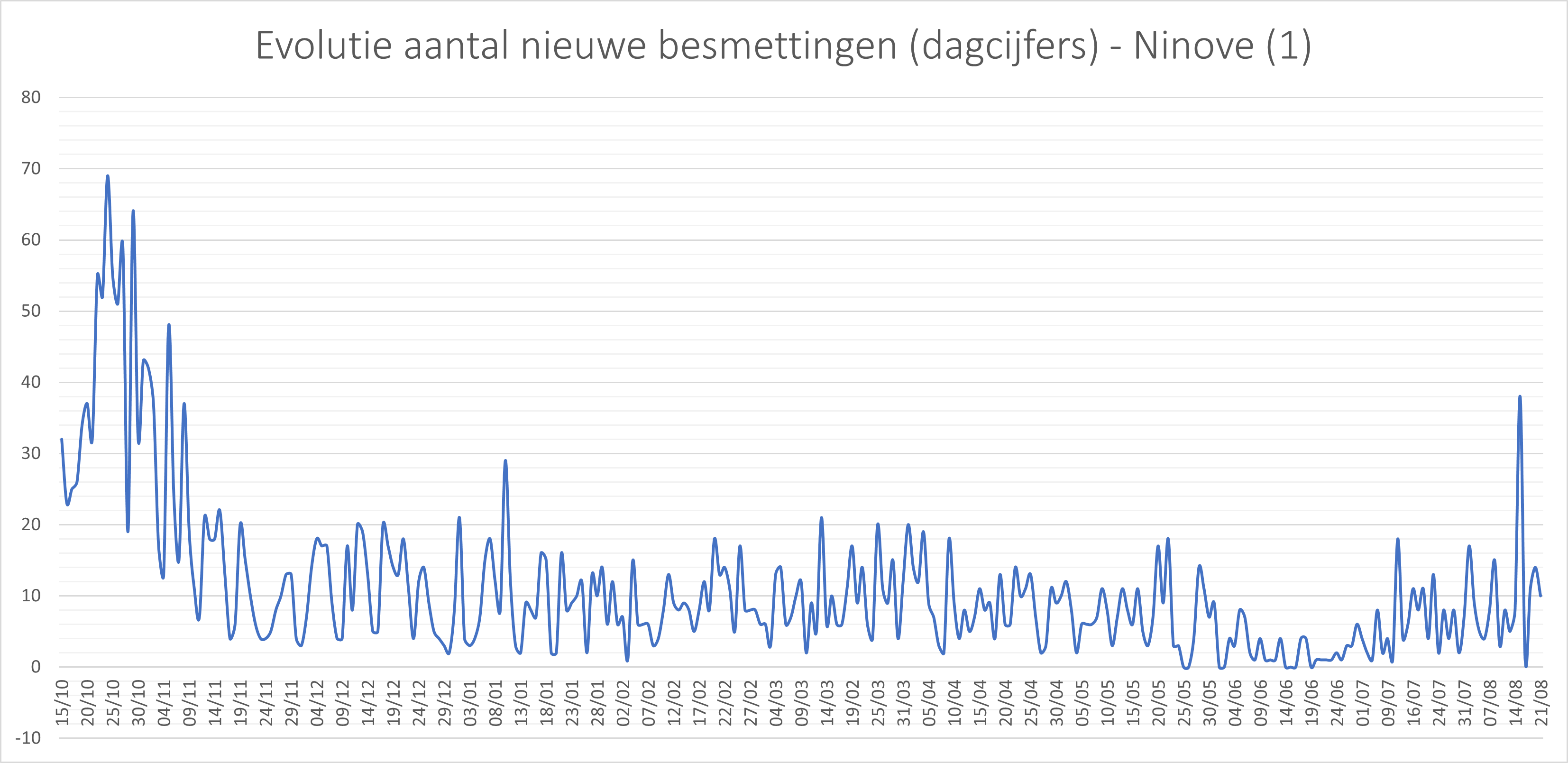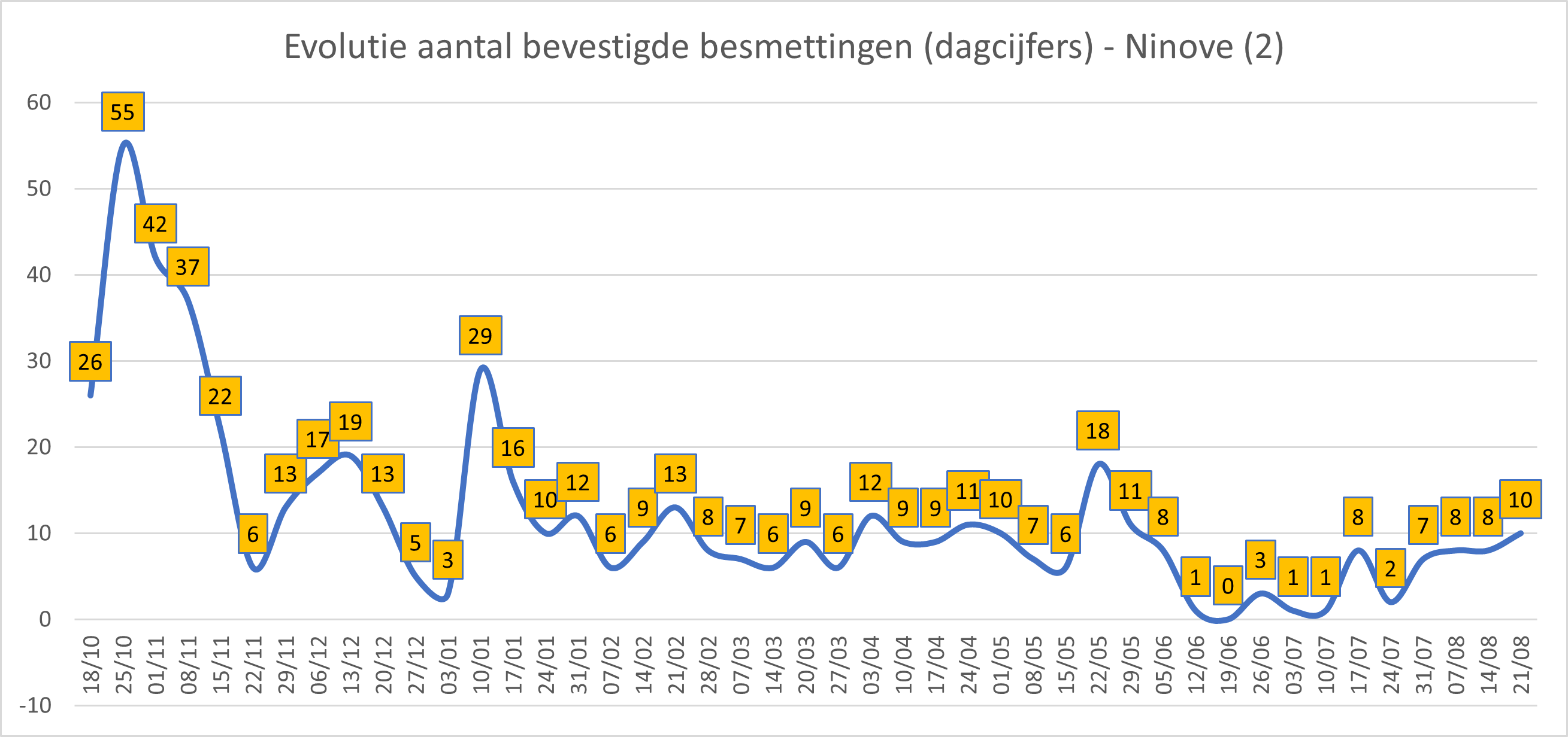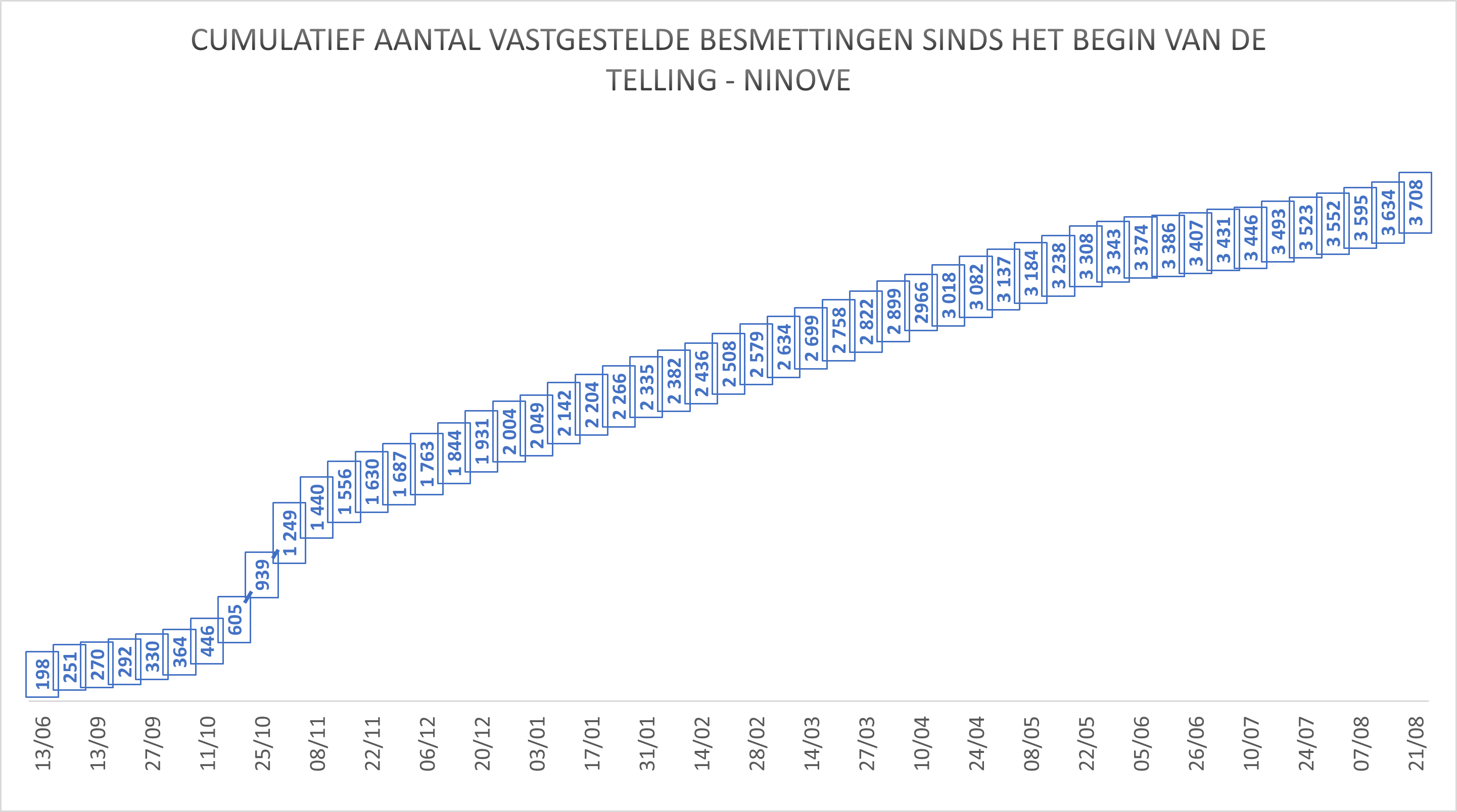 - In totaal zijn in Ninove 3.708 besmettingen genoteerd sinds het begin van de telling.