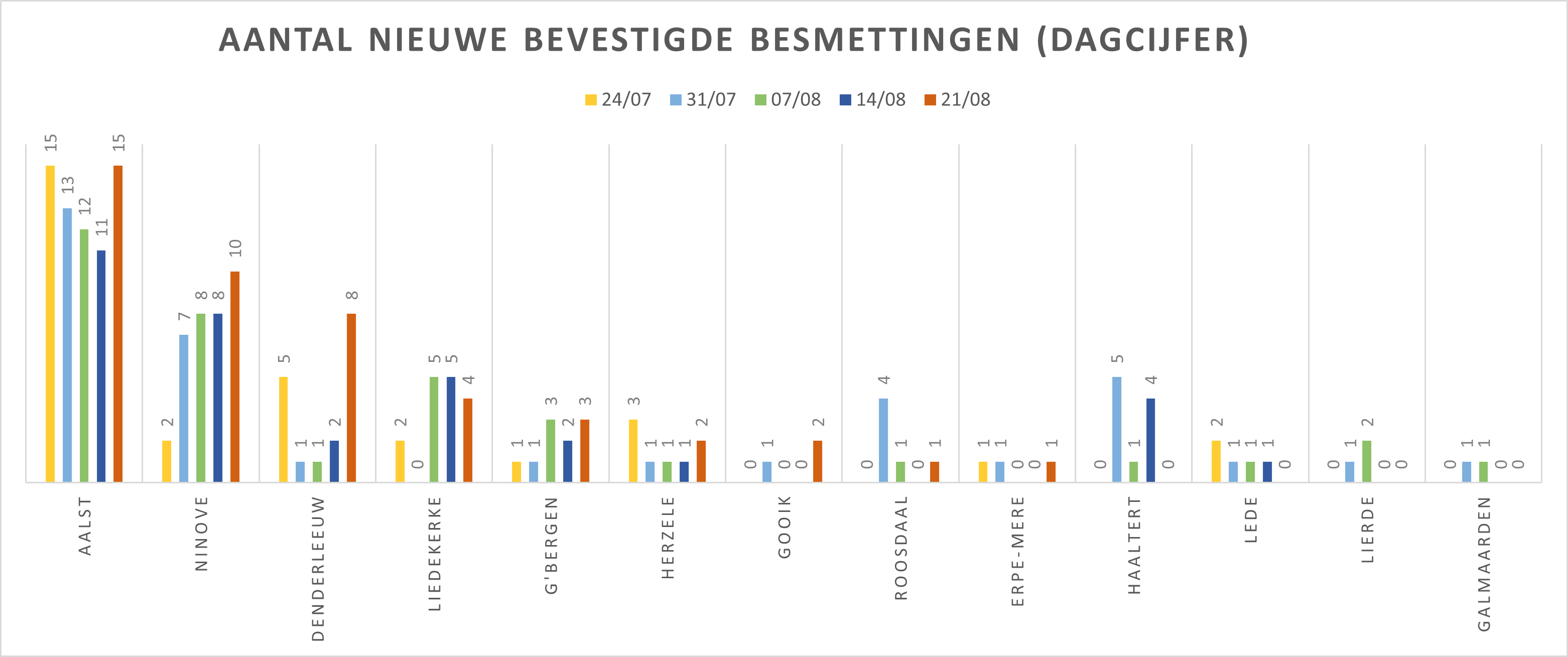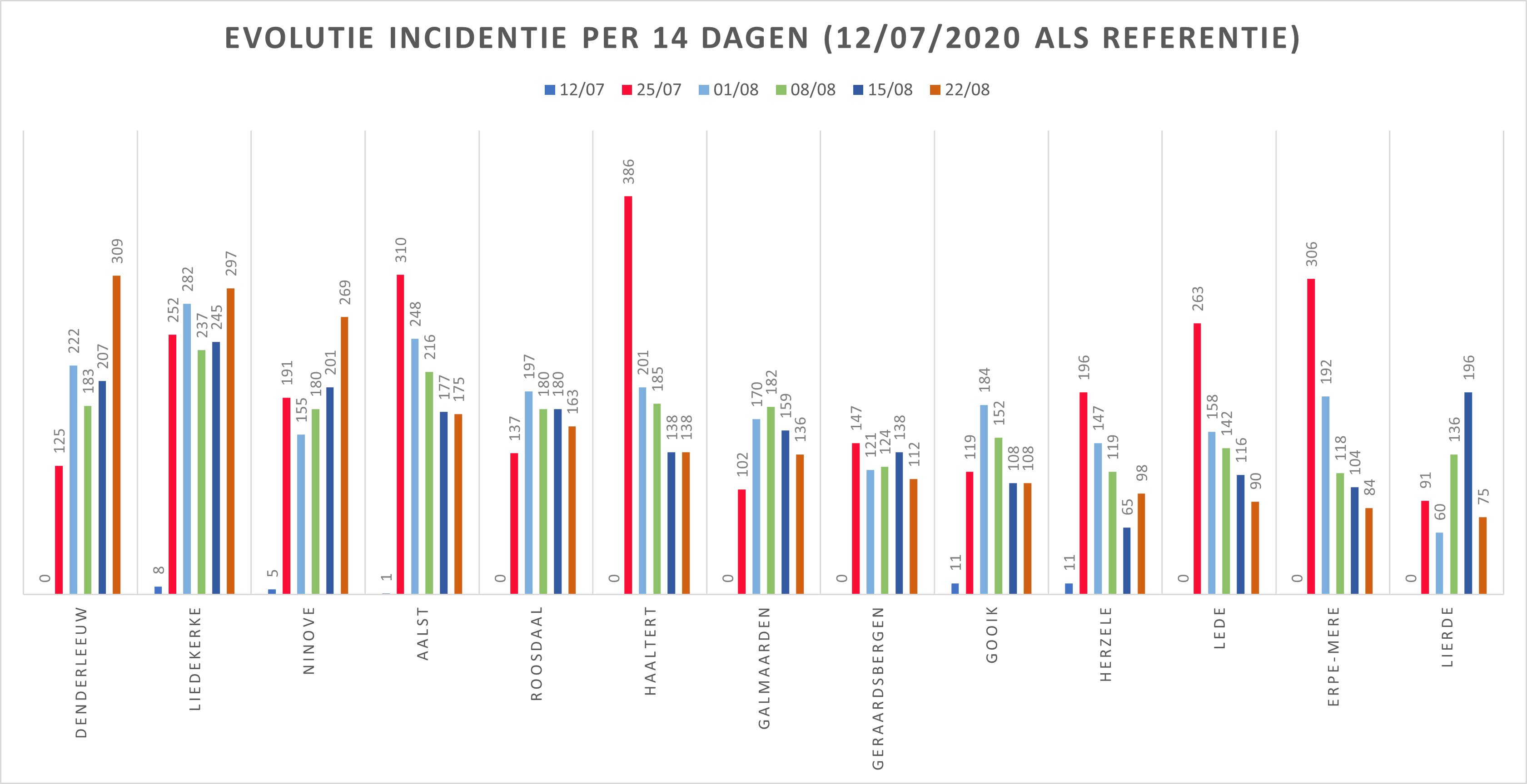 | Gemeente/Stad | 12/07/2020 | 25/07 | 01/08 | 08/08 | 15/08 | 22/08 |