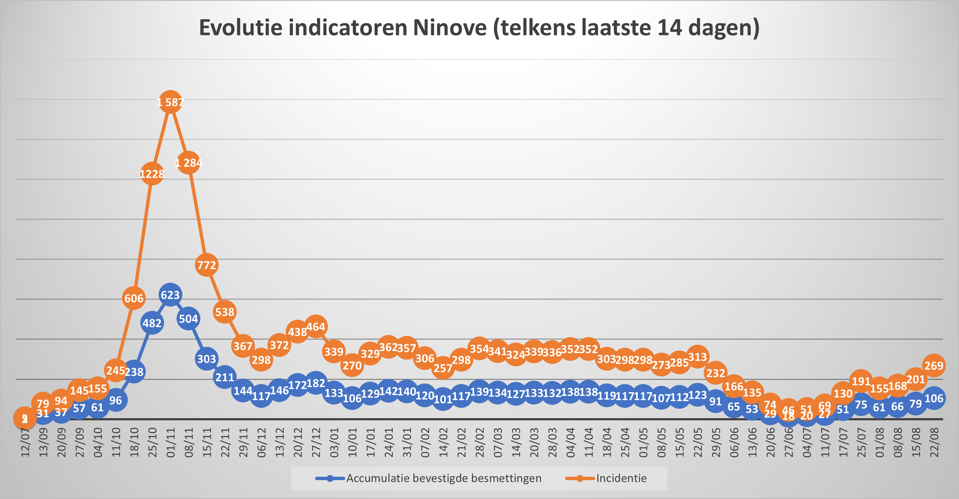 NINOVE – Volgens Sciensano zijn de afgelopen 14 dagen 106 bevestigde besmettingen genoteerd in Ninove. We brengen deze en andere cijfers van de omliggende steden en gemeenten elke week in kaart.