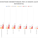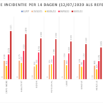 Hieronder een tabel met het aantal bevestigde besmettingen, telkens over een periode van 14 dagen (12 juli 2020 als referentie). Deze en de andere gegevens zetten we in grafieken (bijlagen).