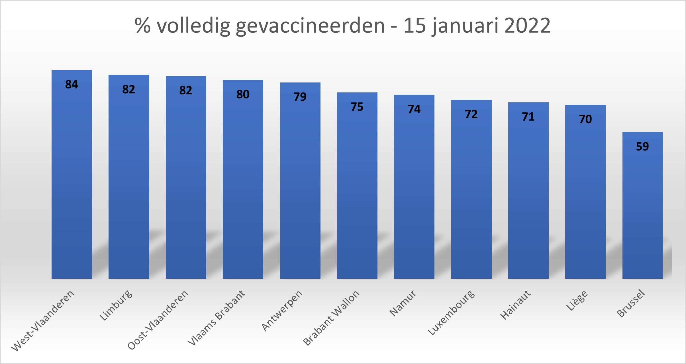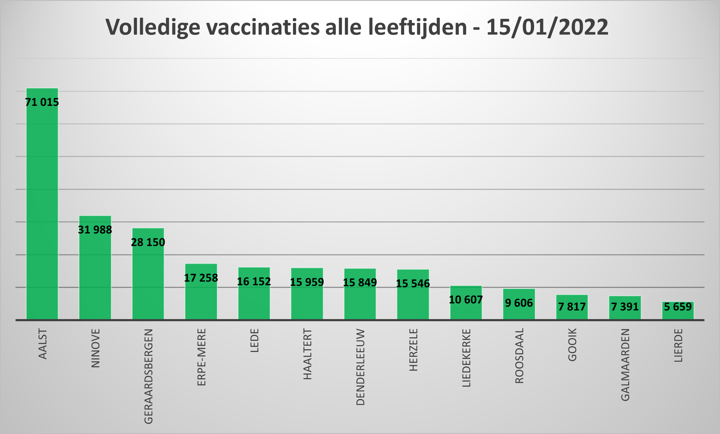 - Tot 15 januari 2022 zijn 31.988 (81,25 %) personen van alle leeftijden in Ninove volledig gevaccineerd.