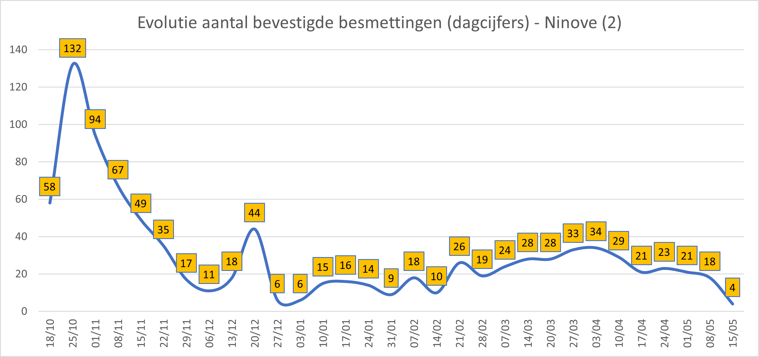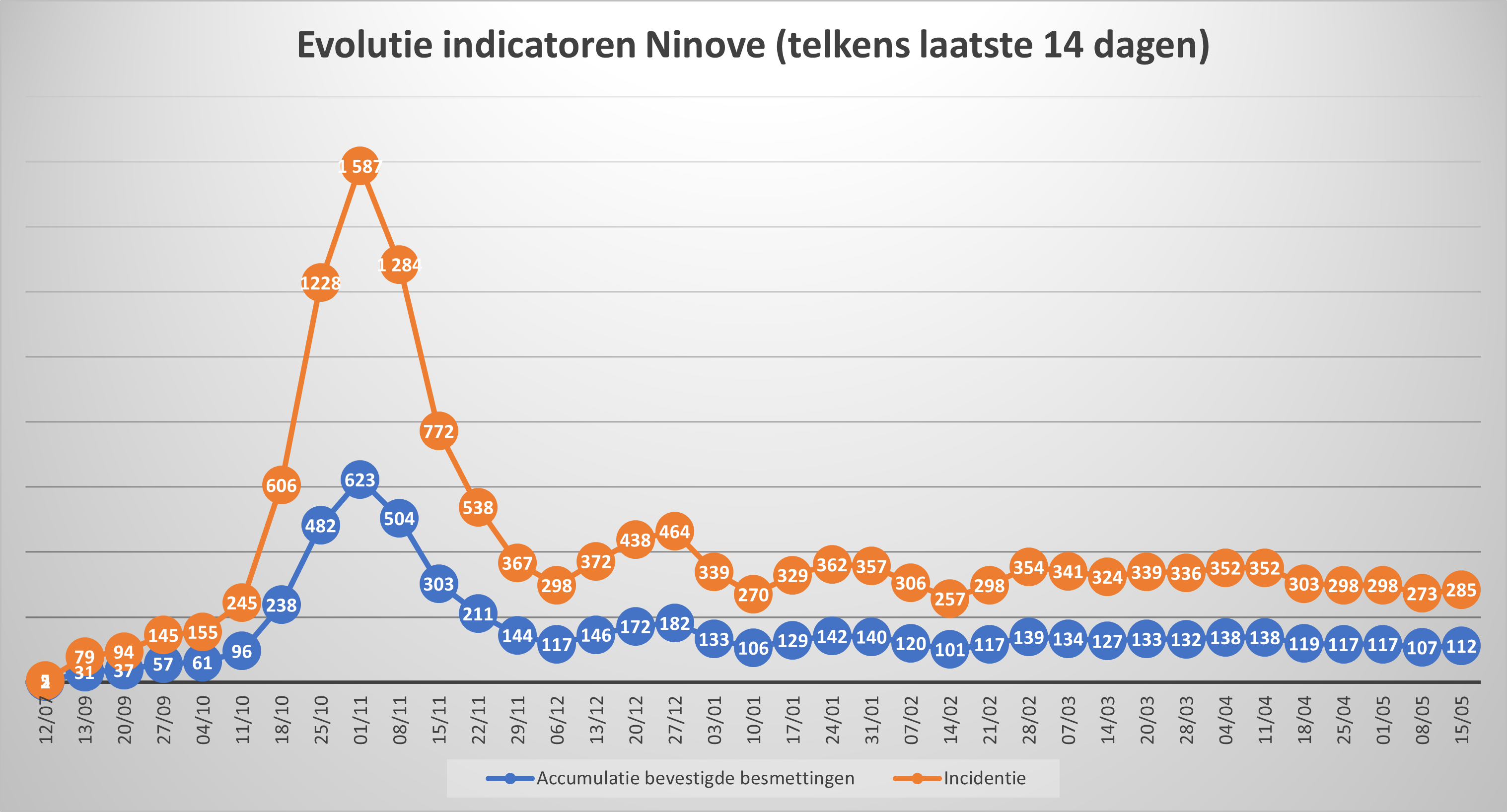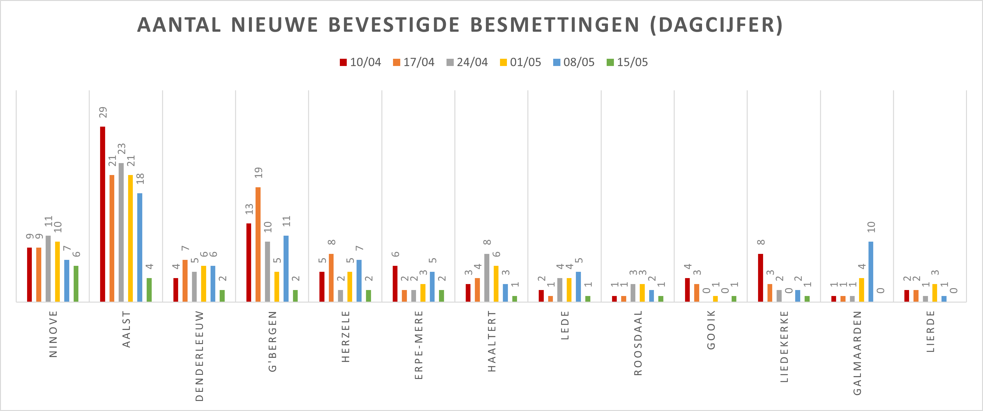 NINOVE – Volgens Sciensano zijn de afgelopen 14 dagen 112 bevestigde besmettingen genoteerd in Ninove. We brengen deze en andere cijfers van de omliggende steden en gemeenten elke week in kaart.