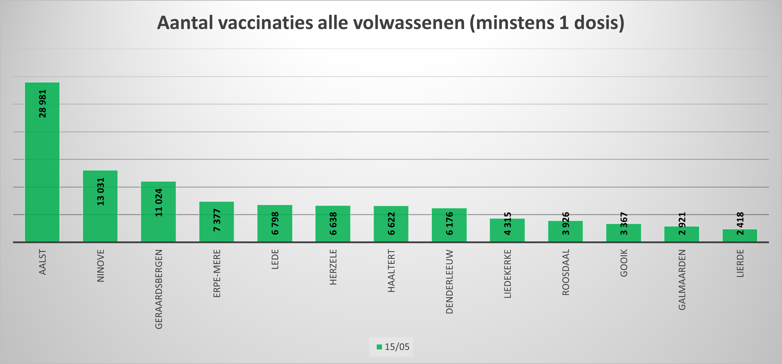 4.698 (14,92 %) volwassenen zijn volledig gevaccineerd. - 8.208 vaccins zijn tot 15 mei toegediend in de leeftijdsgroep 65+ (ook minstens 1 prik), goed voor 99,58 %.