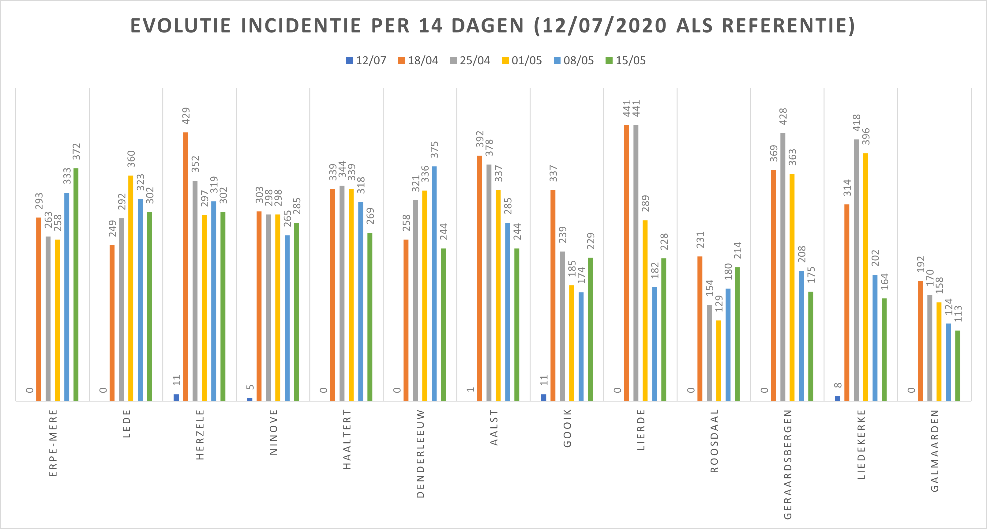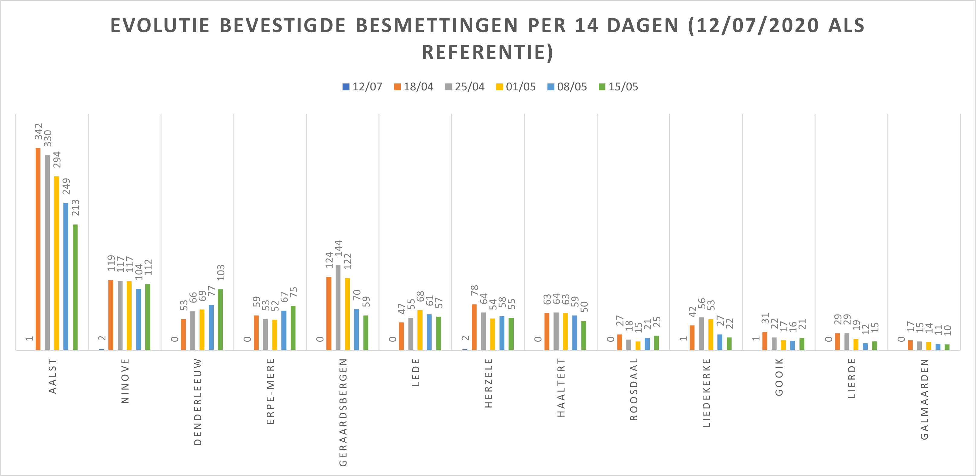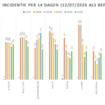 Hieronder een tabel met het aantal bevestigde besmettingen, telkens over een periode van 14 dagen (12 juli 2020 als referentie). Deze en de andere gegevens zetten we in grafieken (bijlagen).