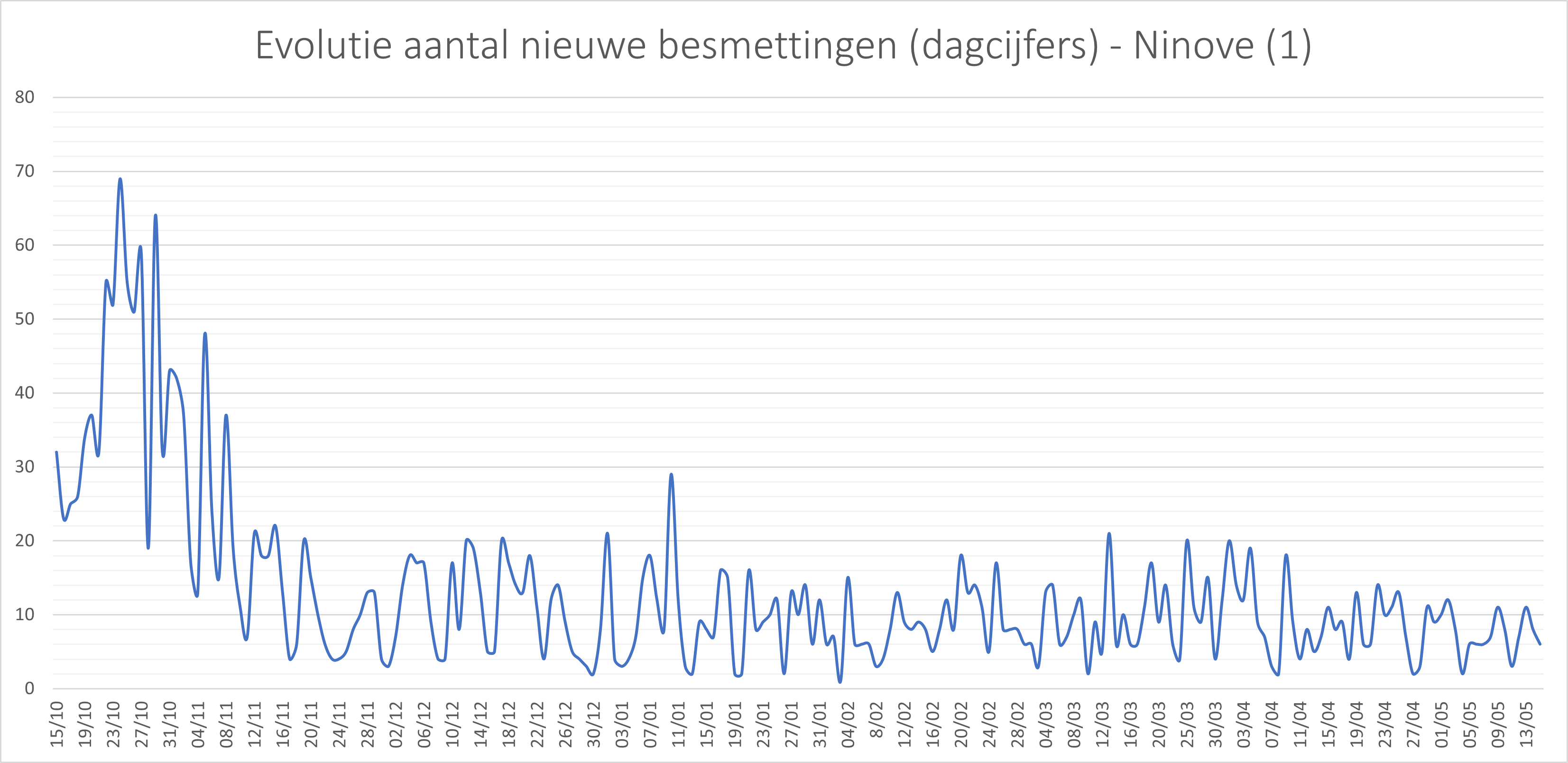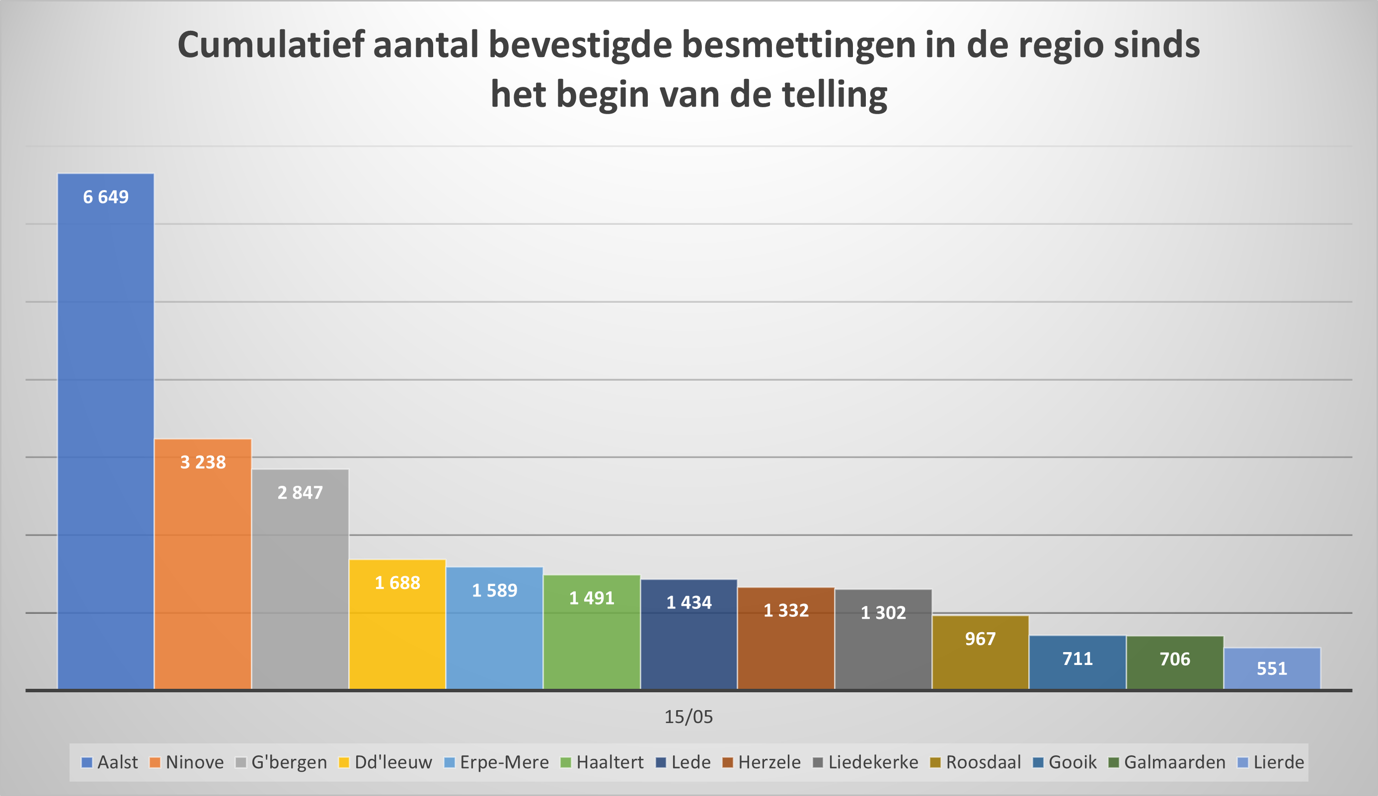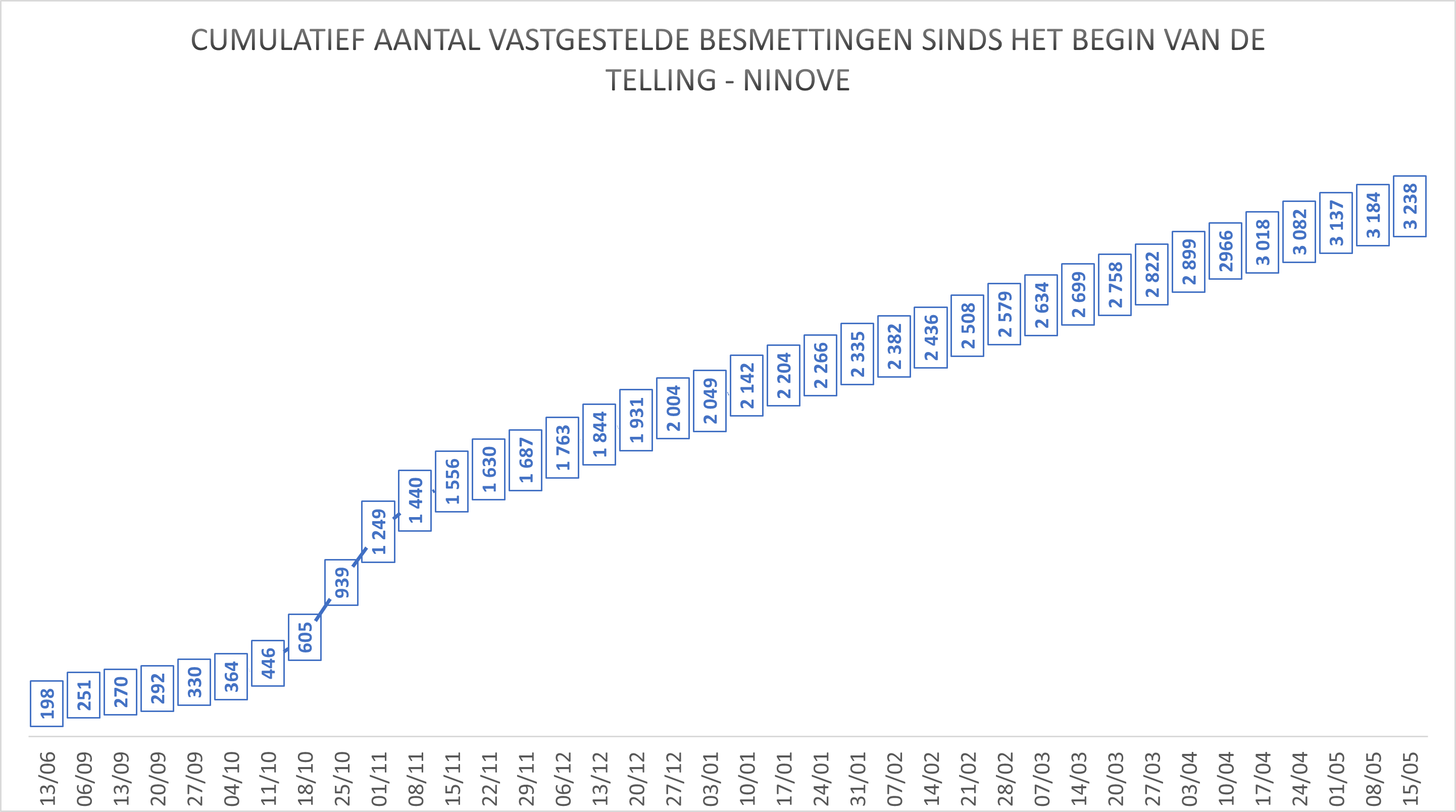 - In totaal zijn in Ninove 3.238 besmettingen genoteerd sinds het begin van de telling.