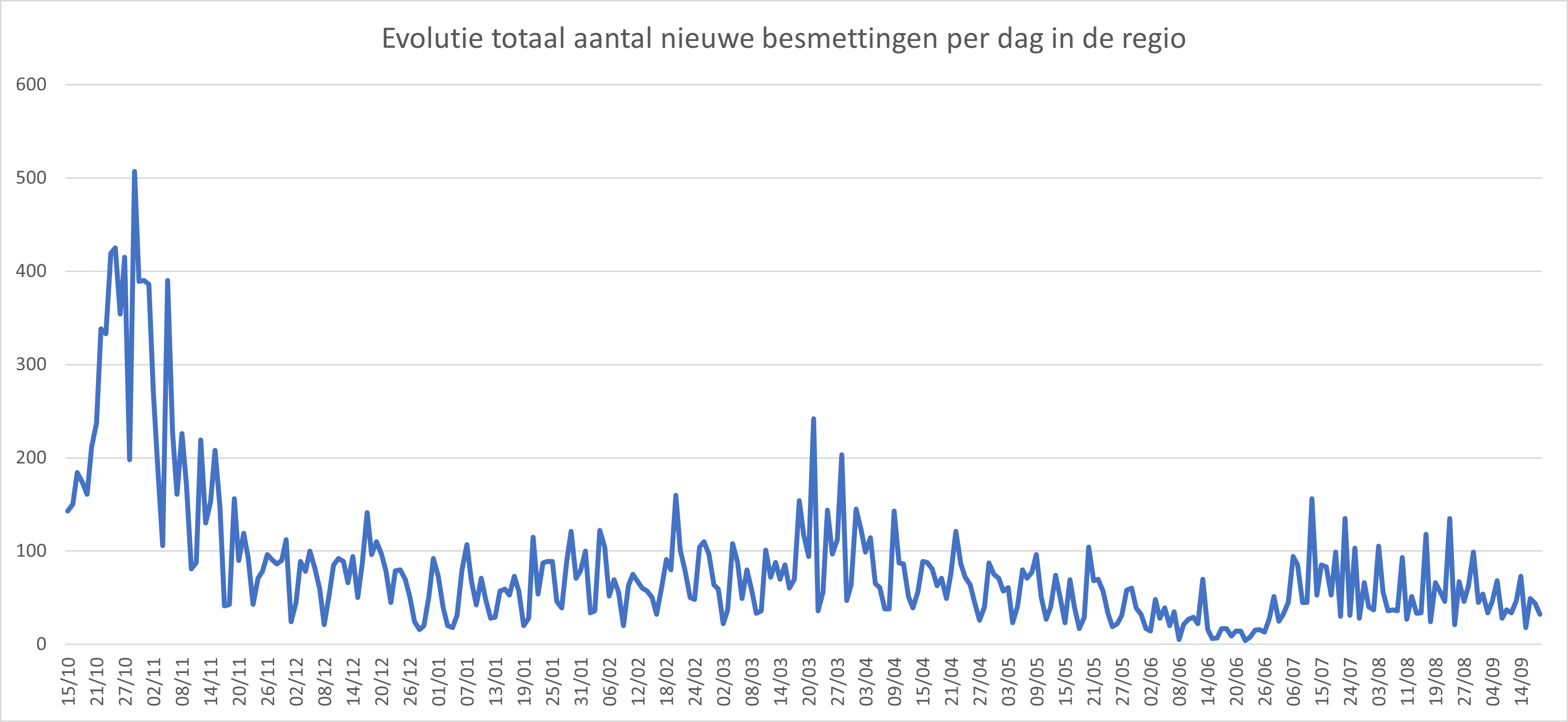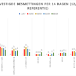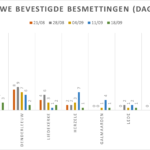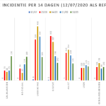 Hieronder een tabel met het aantal bevestigde besmettingen, telkens over een periode van 14 dagen (12 juli 2020 als referentie). Deze en de andere gegevens zetten we in grafieken (bijlagen).
