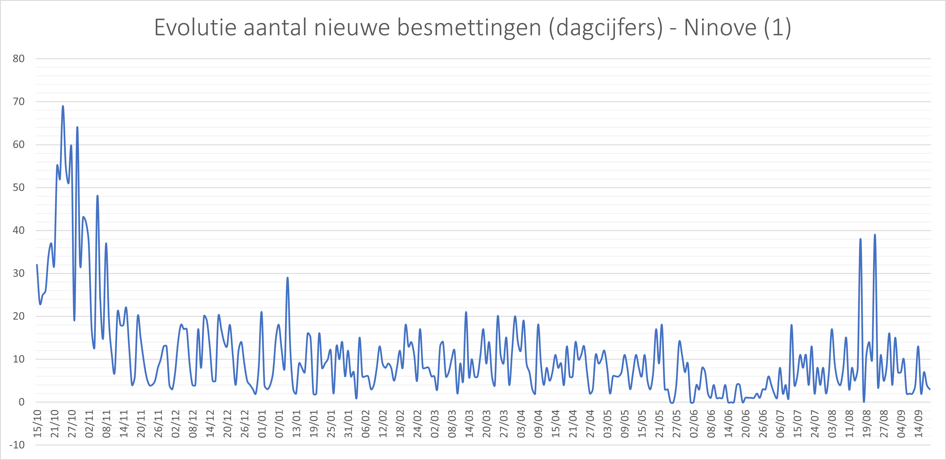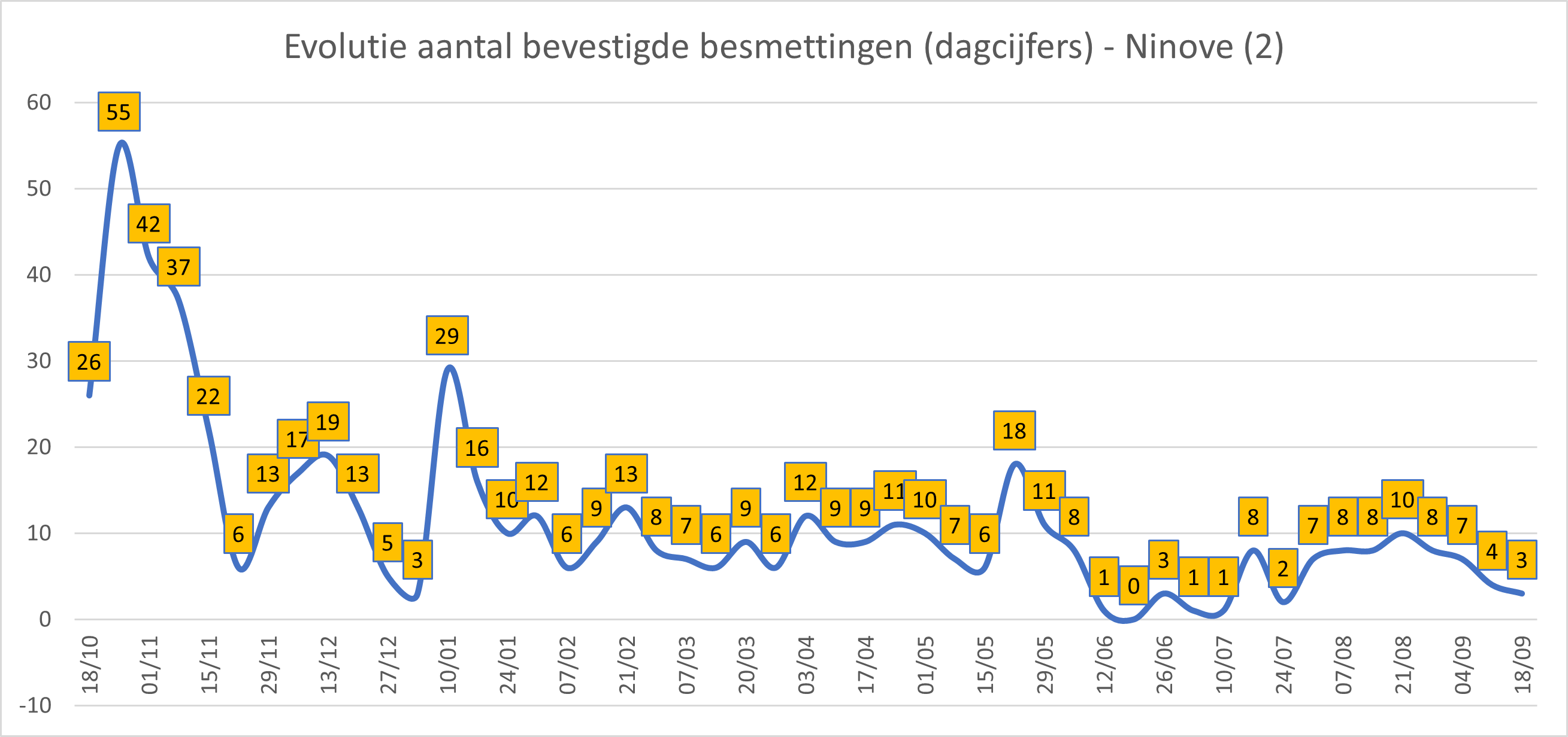 NINOVE – Volgens Sciensano zijn de afgelopen 14 dagen 55 bevestigde besmettingen genoteerd in Ninove. We brengen deze en andere cijfers van de omliggende steden en gemeenten elke week in kaart.