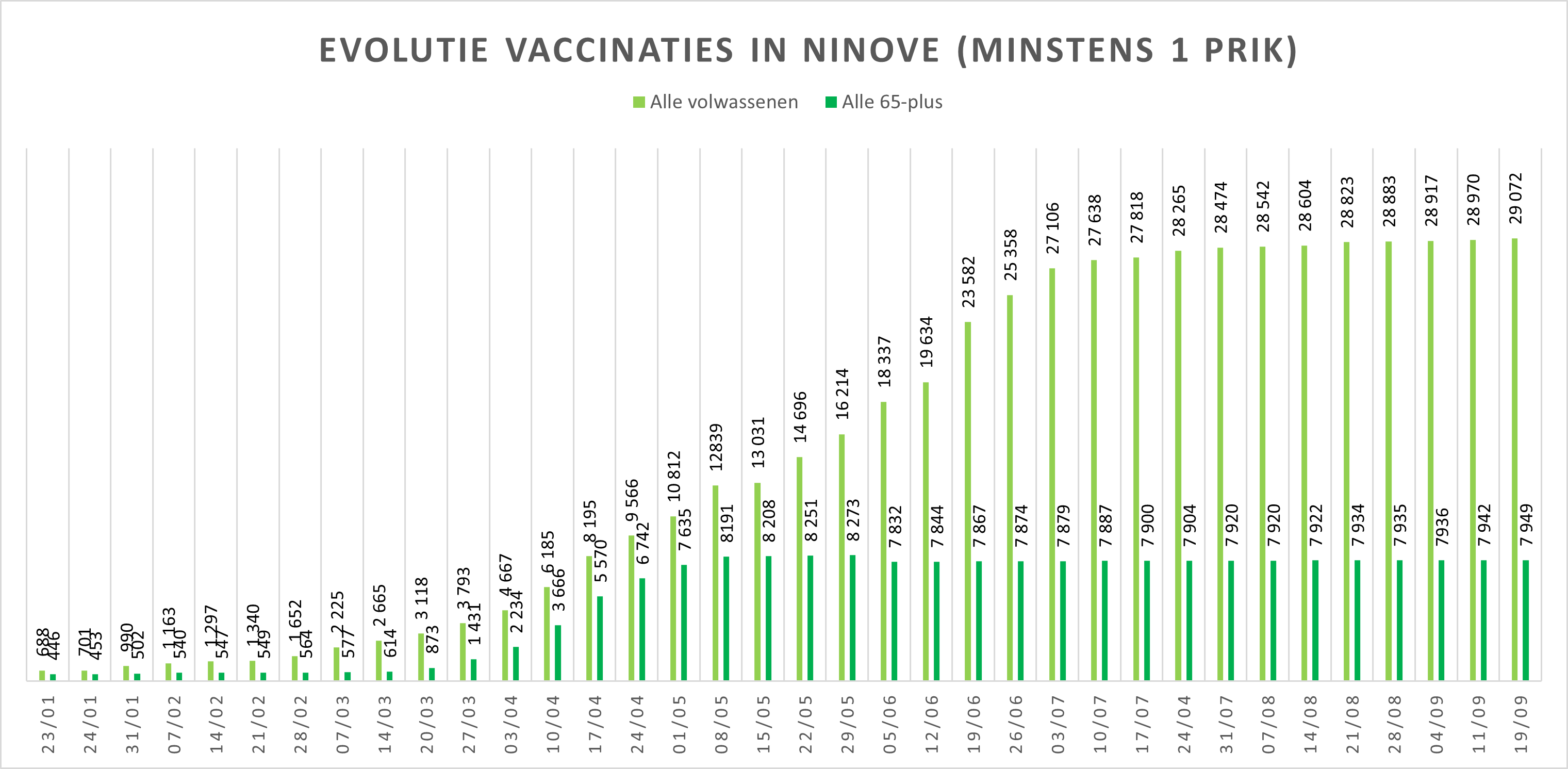 - Tot 19 september zijn 28.670 van alle +18-jarigen volledig gevaccineerd. Dat is 91,07 % van die bevolkingsgroep.
