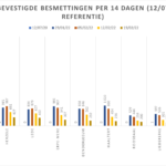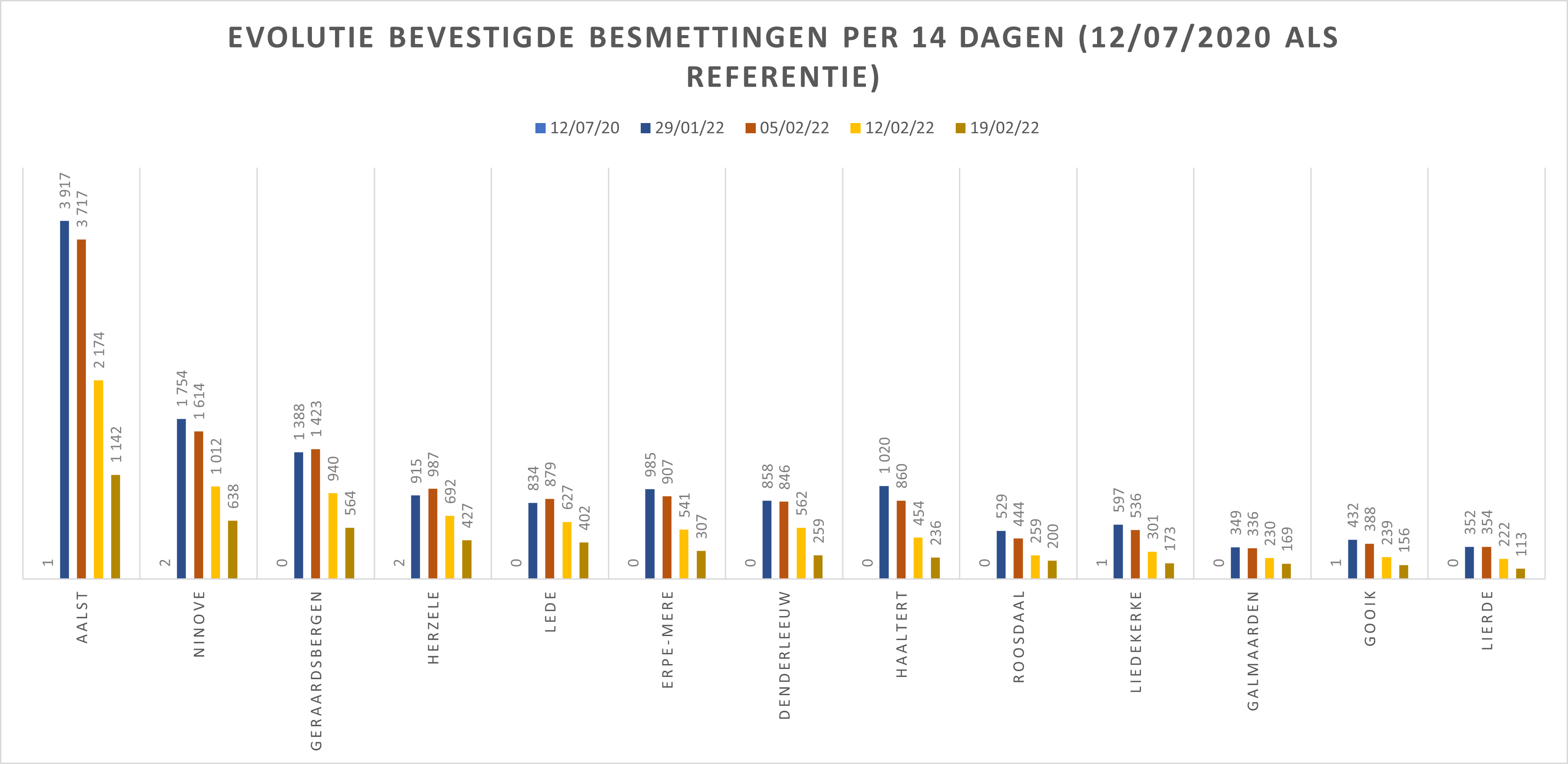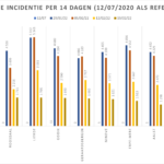 Hieronder een tabel met het aantal bevestigde besmettingen, telkens over een periode van 14 dagen (12 juli 2020 als referentie). Deze en de andere gegevens zetten we in grafieken (bijlagen).