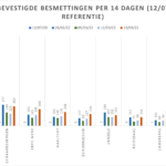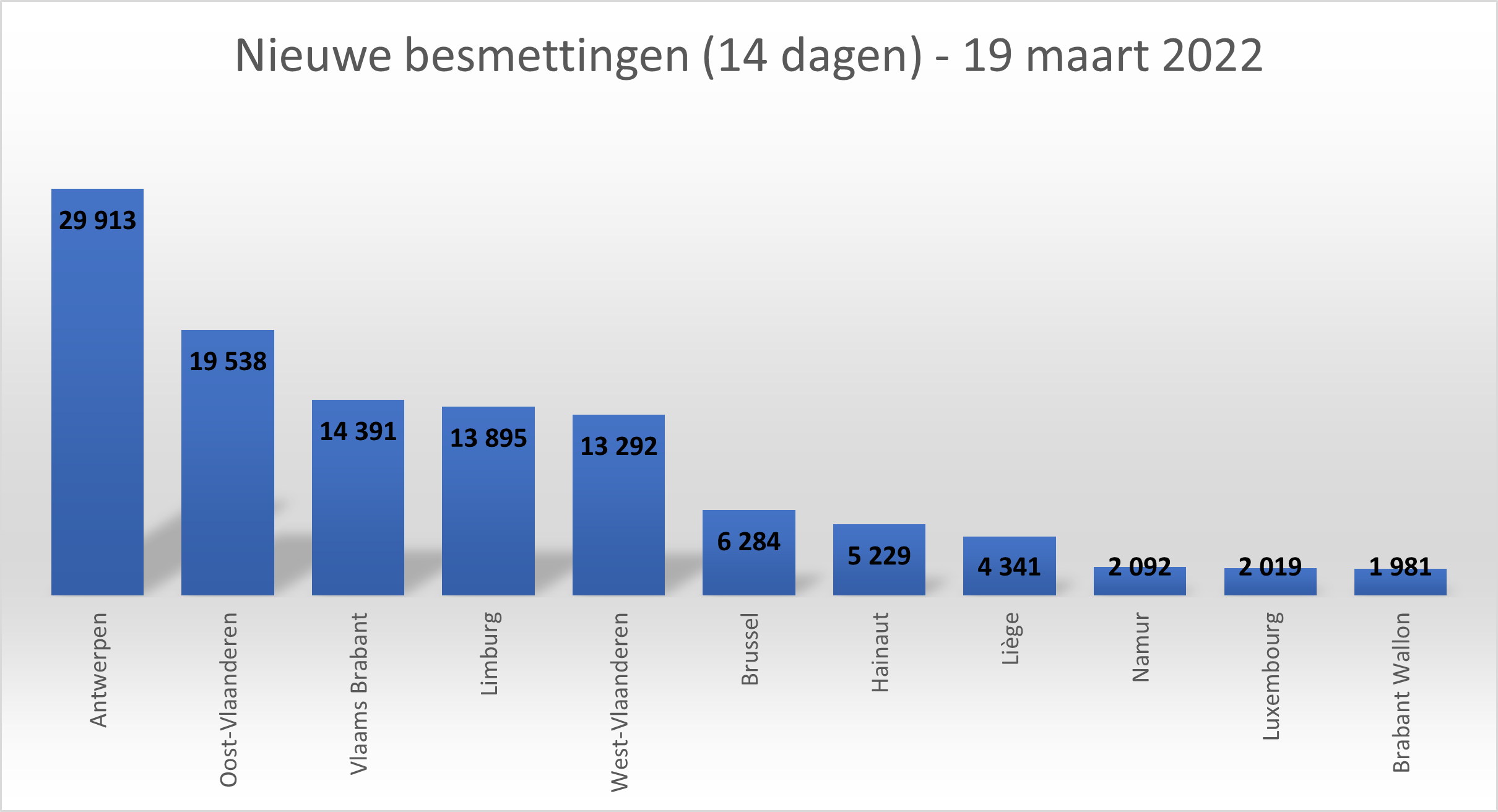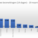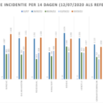 Hieronder een tabel met het aantal bevestigde besmettingen, telkens over een periode van 14 dagen (12 juli 2020 als referentie). Deze en de andere gegevens zetten we in grafieken (bijlagen).