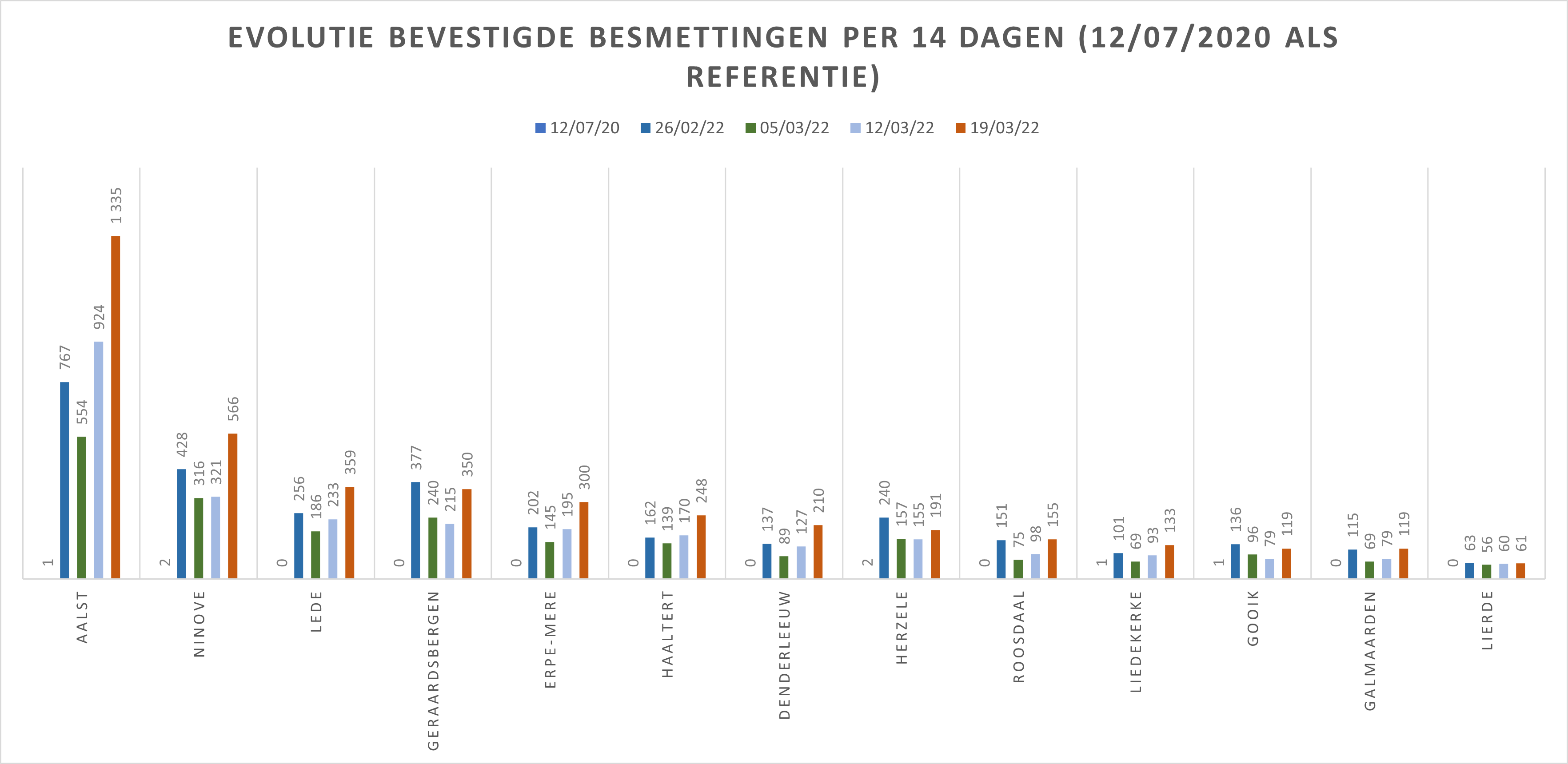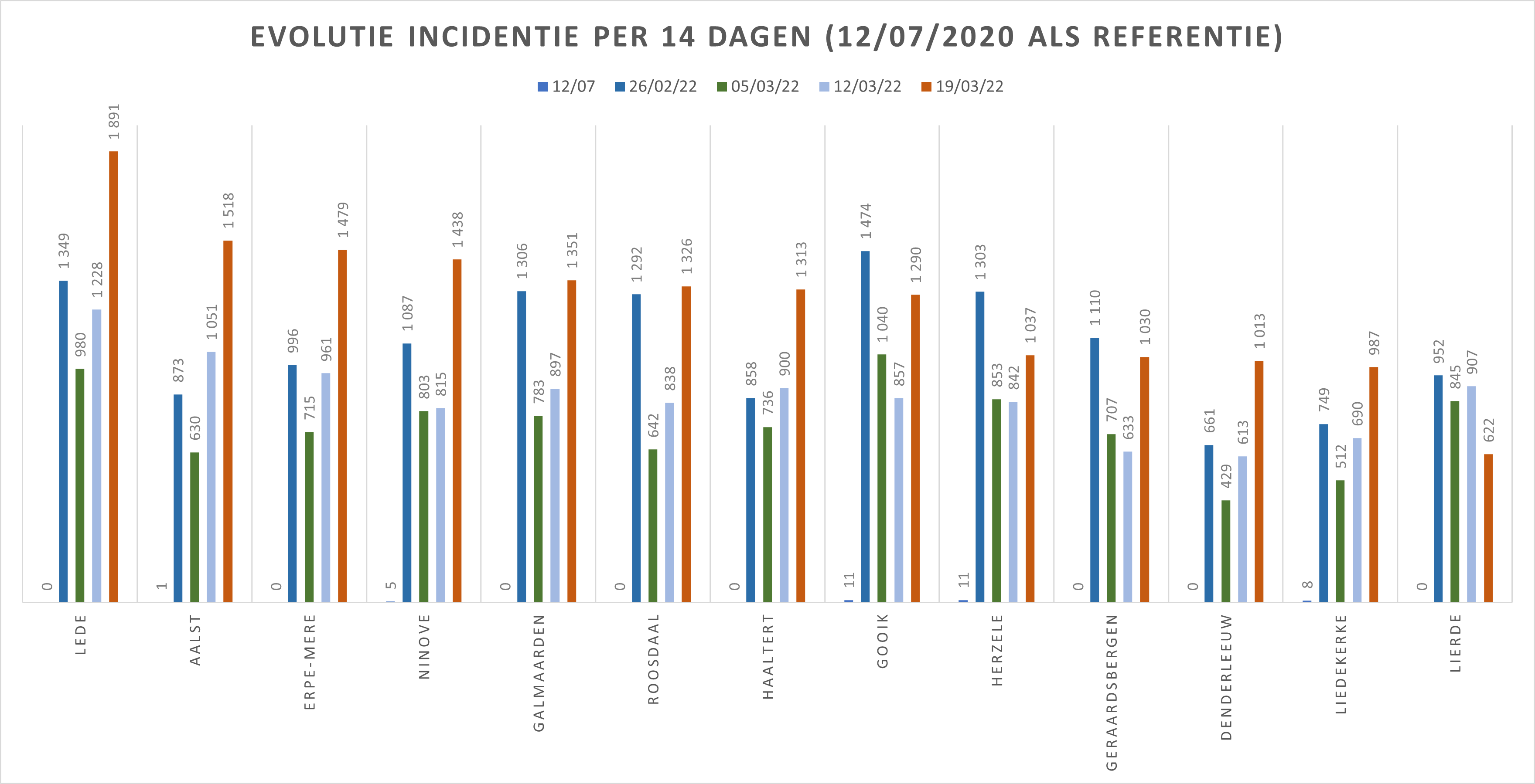 | Gemeente/Stad | 19/02/22 | 26/02/22 | 05/03/22 | 12/03/22 | 19/03/22 |