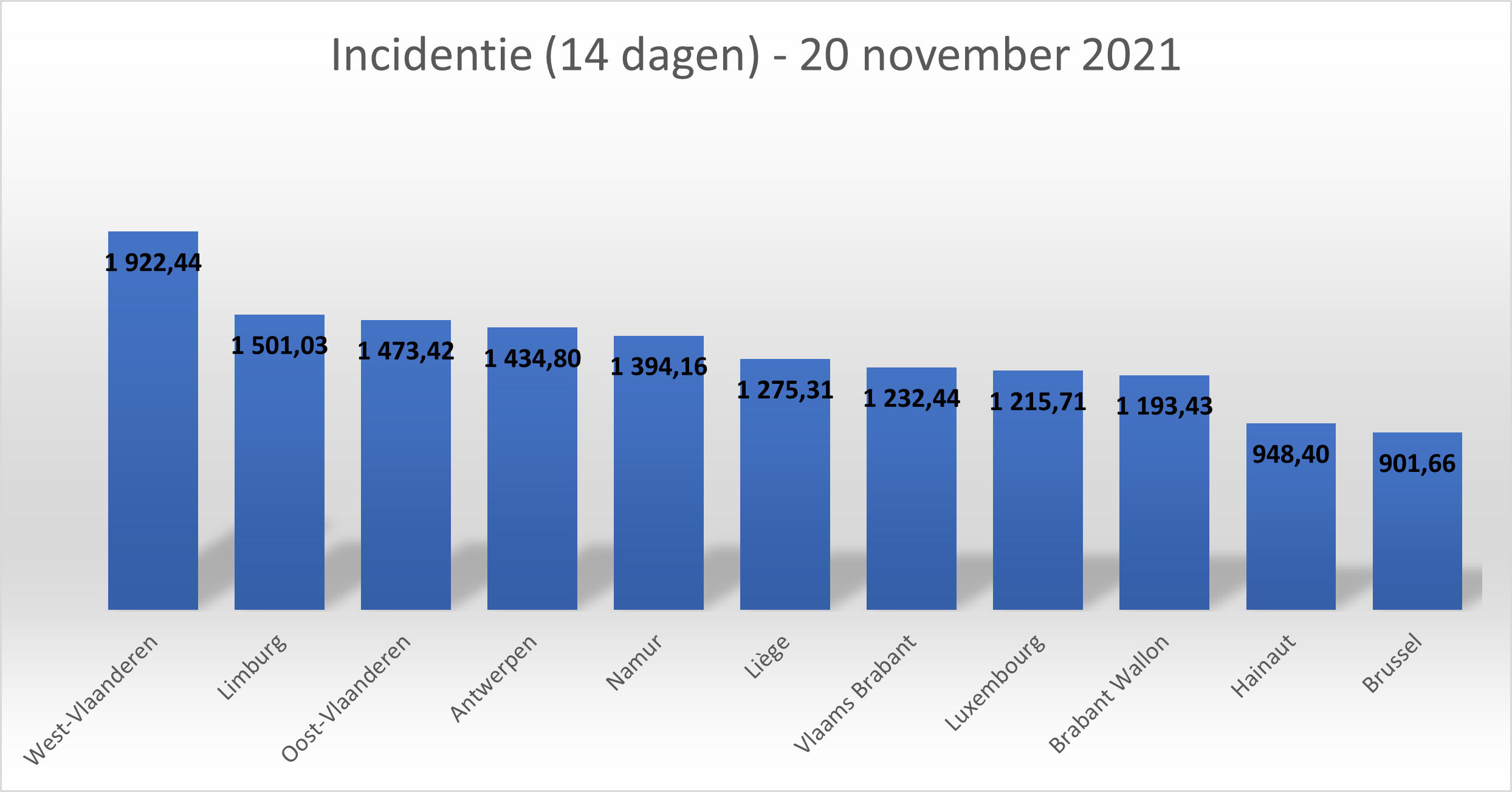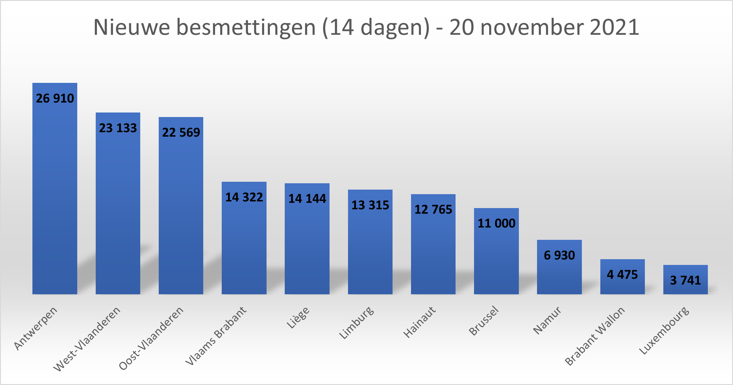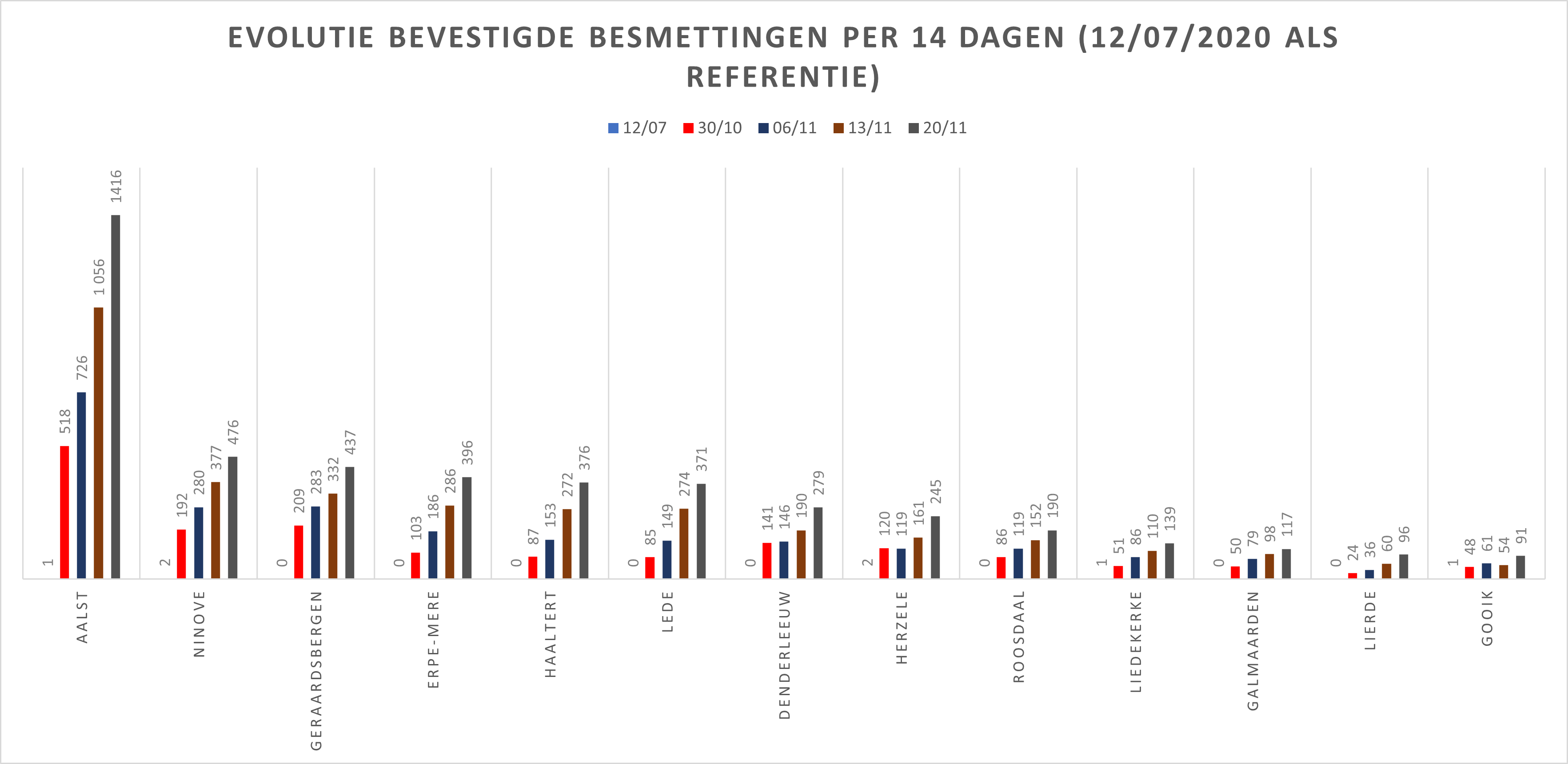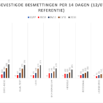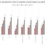 Hieronder een tabel met het aantal bevestigde besmettingen, telkens over een periode van 14 dagen (12 juli 2020 als referentie). Deze en de andere gegevens zetten we in grafieken (bijlagen).