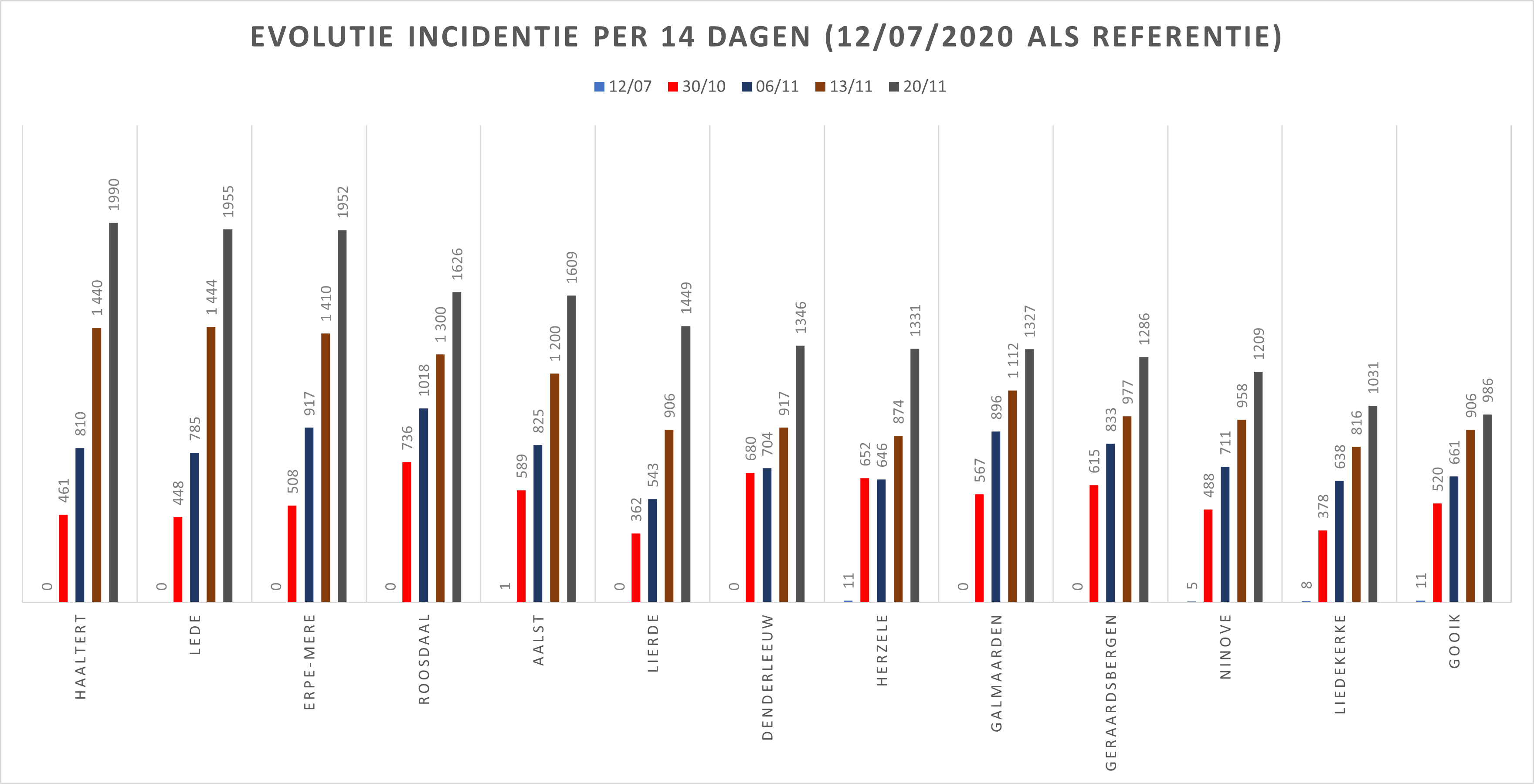 | Gemeente/Stad | 12/07/20 | 30/10/21 | 06/11/21 | 13/11/21 | 20/11/21 |