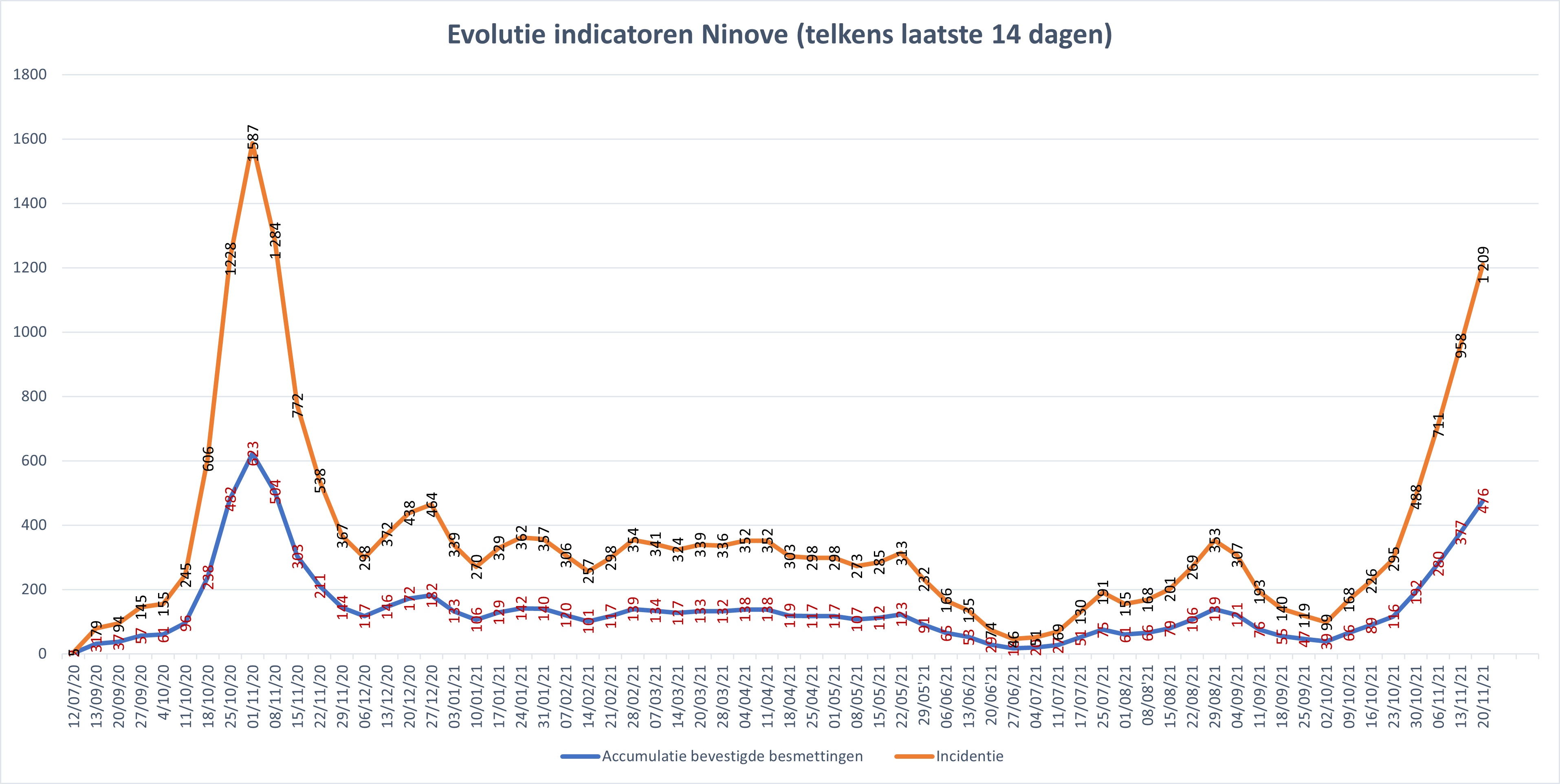 NINOVE – Volgens Sciensano zijn de afgelopen 14 dagen 476 bevestigde besmettingen genoteerd in Ninove. We brengen deze en andere cijfers van de omliggende steden en gemeenten elke week in kaart.