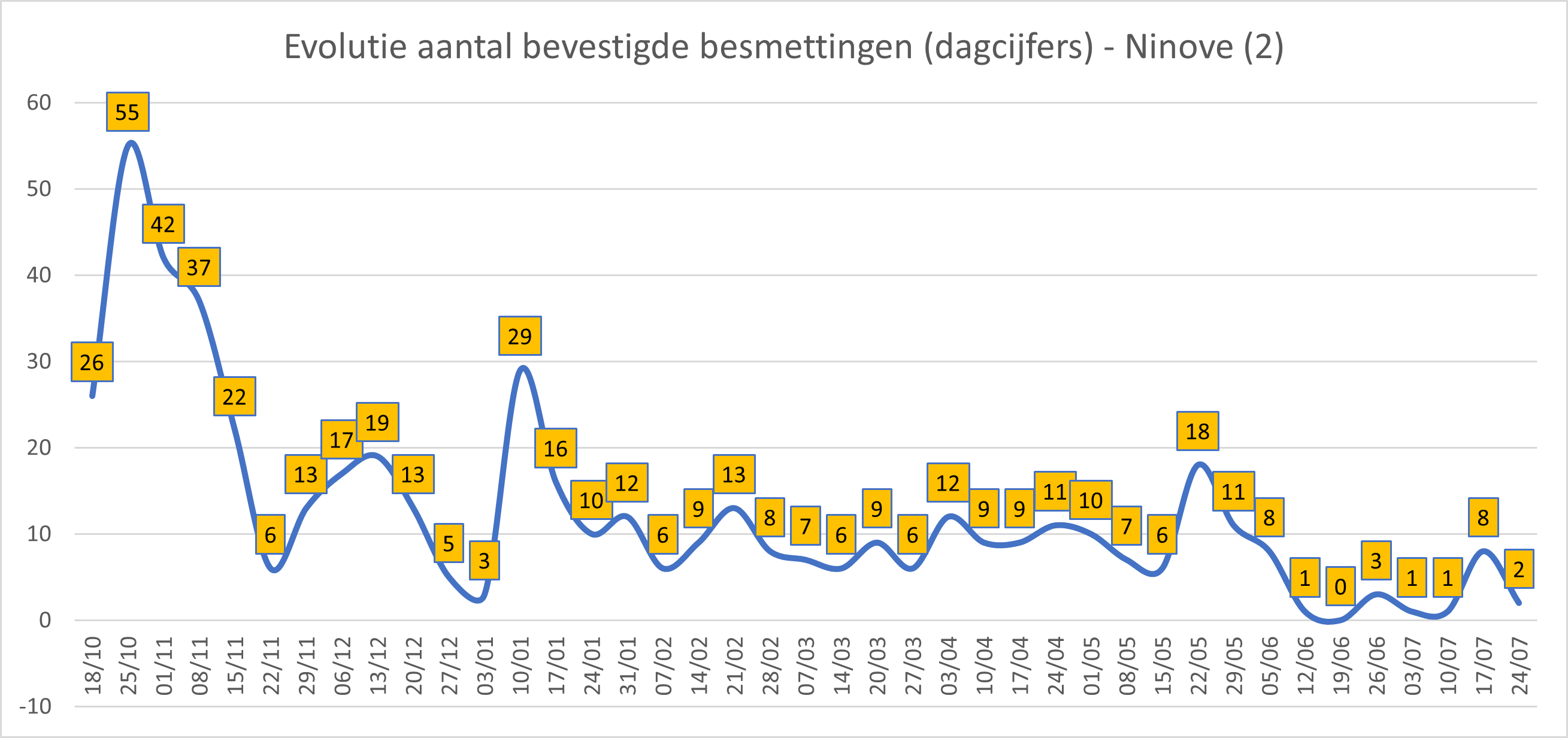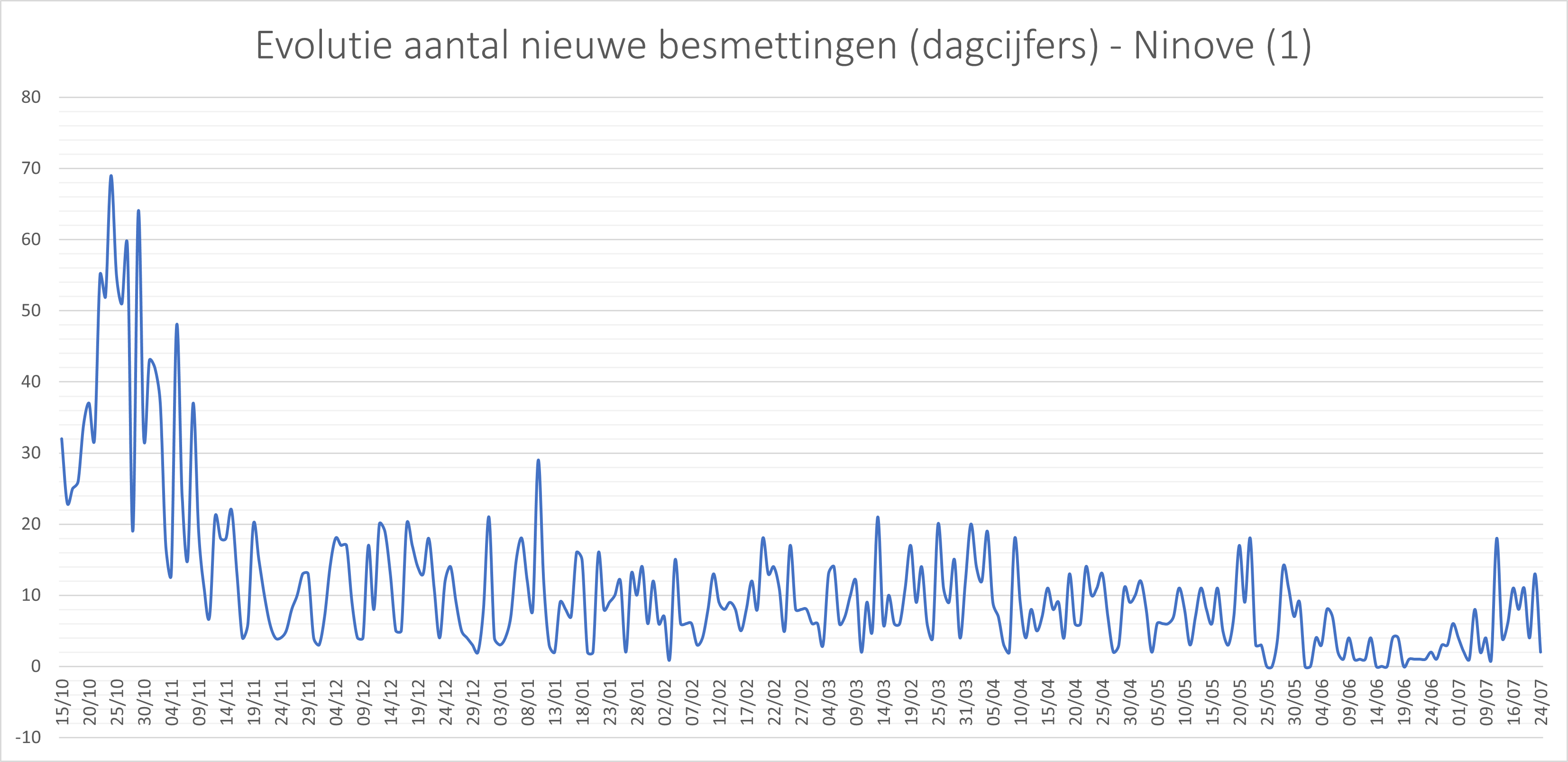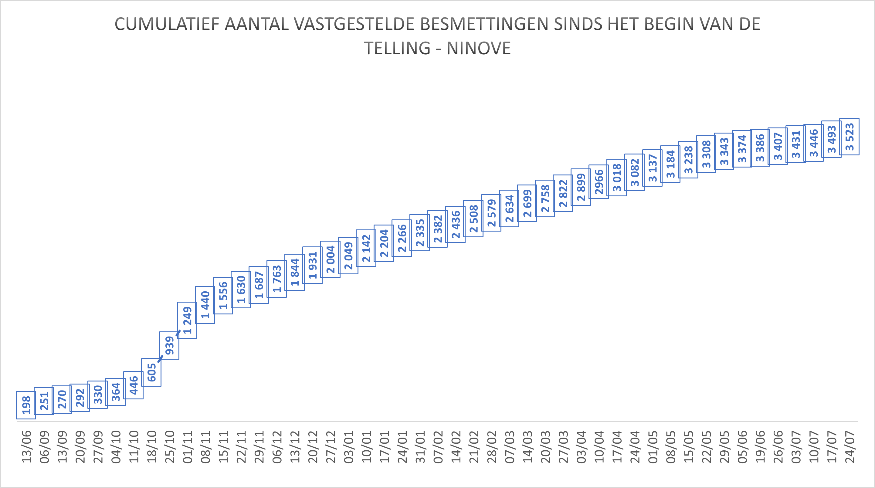 • In totaal zijn in Ninove 3.523 besmettingen genoteerd sinds het begin van de telling.