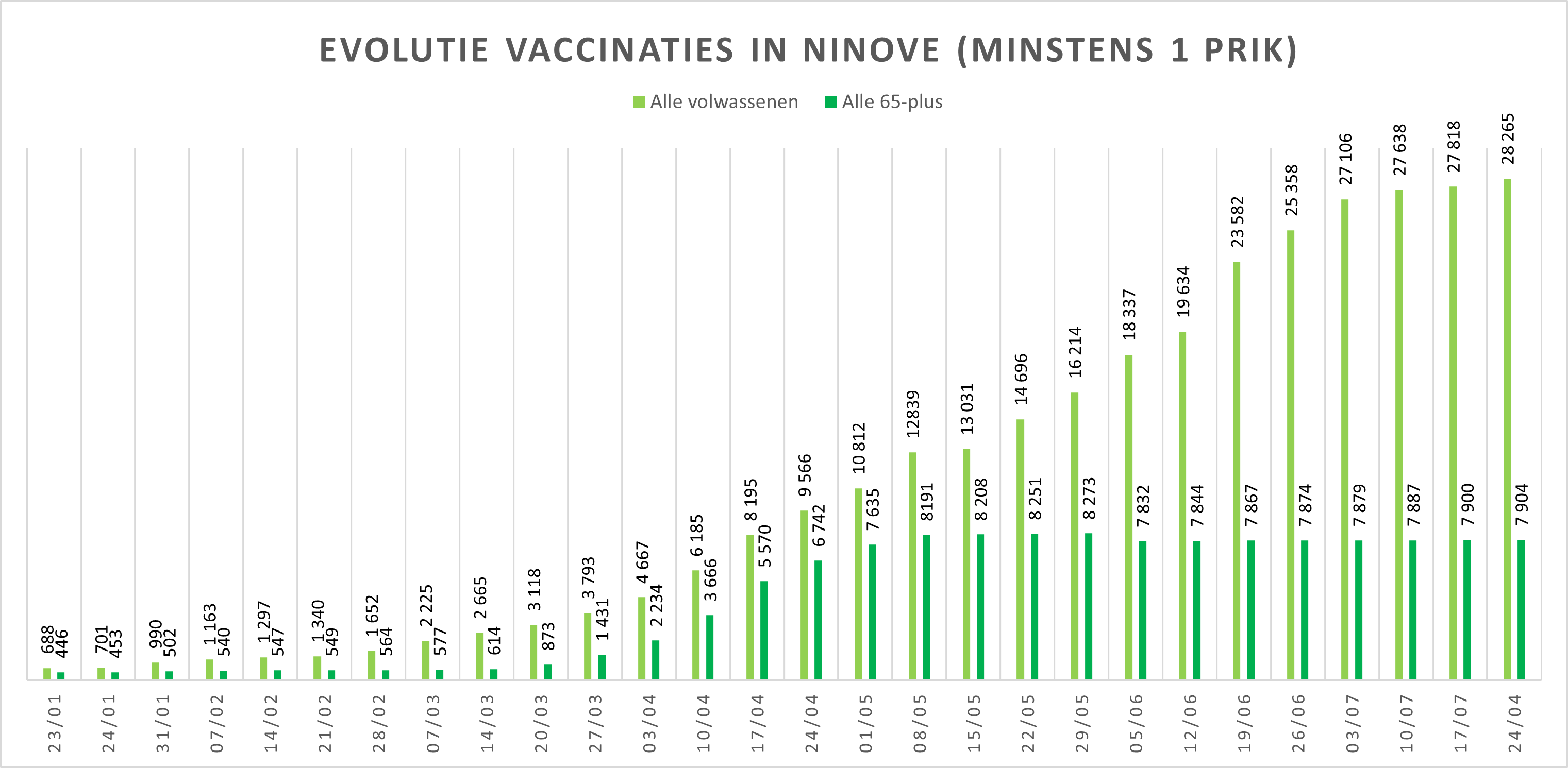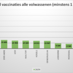 • Tot 24 juli kregen 28.265 van alle +18-jarigen minstens 1 vaccinatieprik. Dat is 89,78 % van die bevolkingsgroep.
