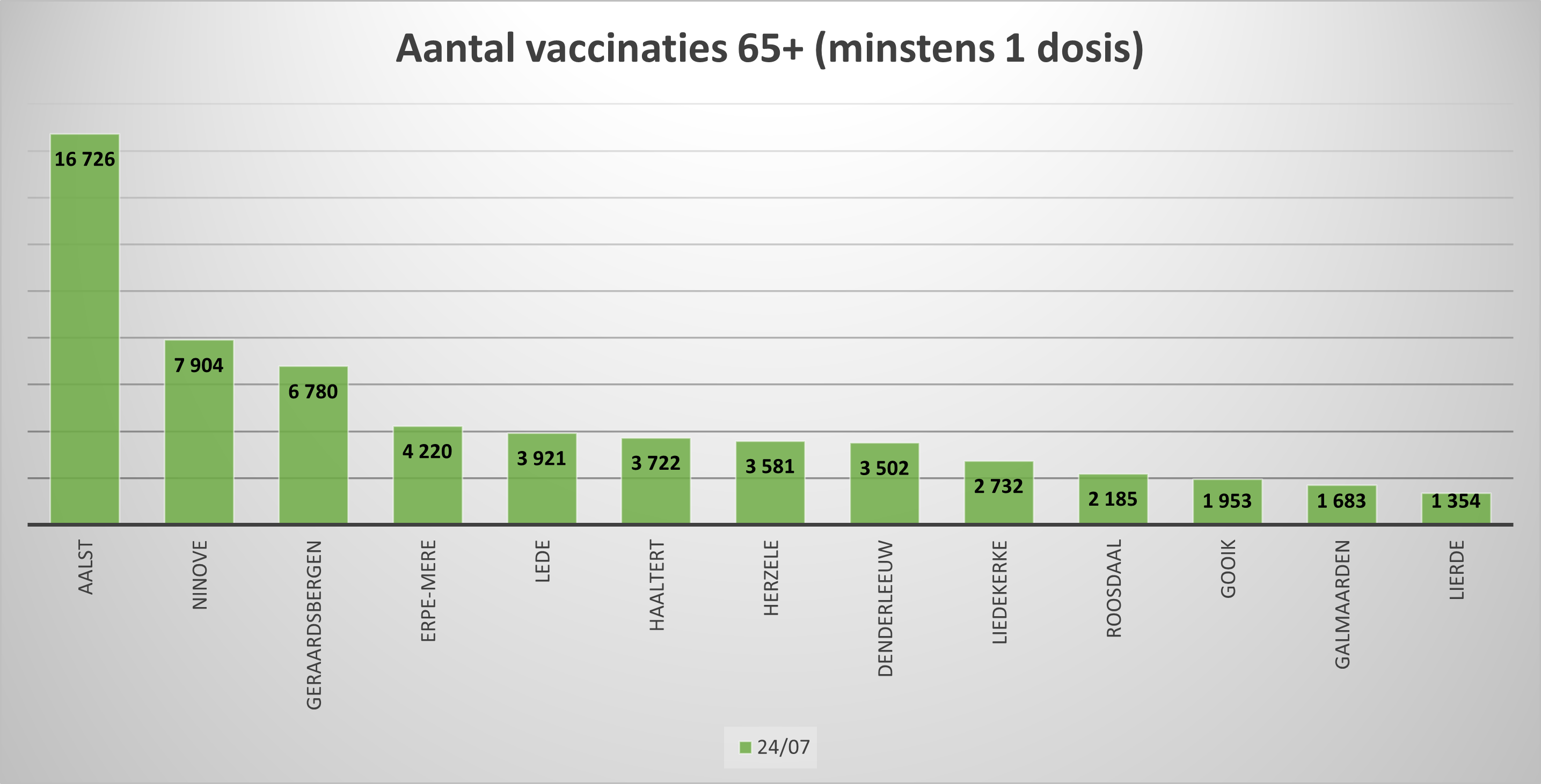 • 7.904 vaccins zijn tot 24 juli toegediend in de leeftijdsgroep 65+ (ook minstens 1 prik), goed voor 95,89 %