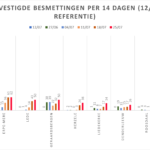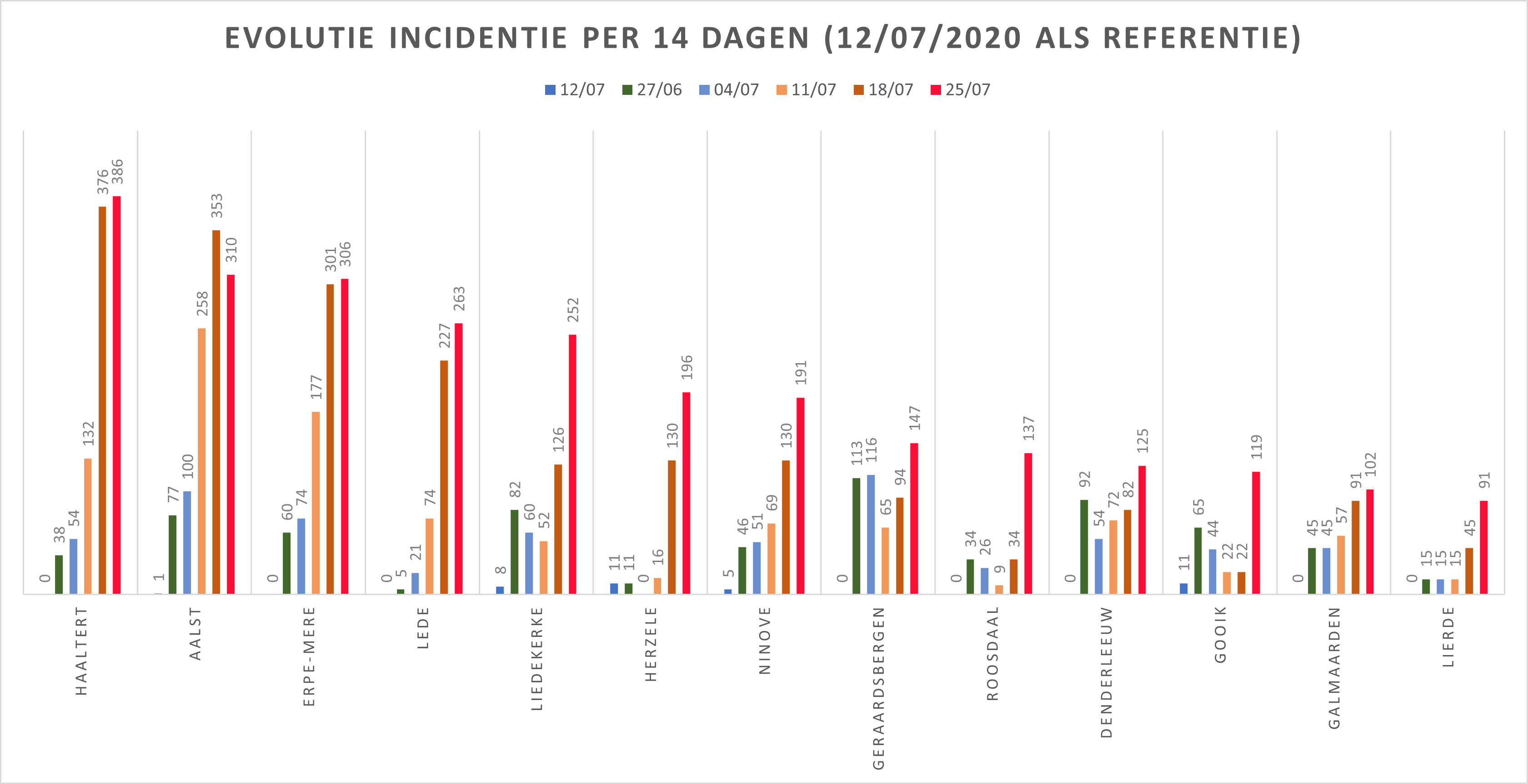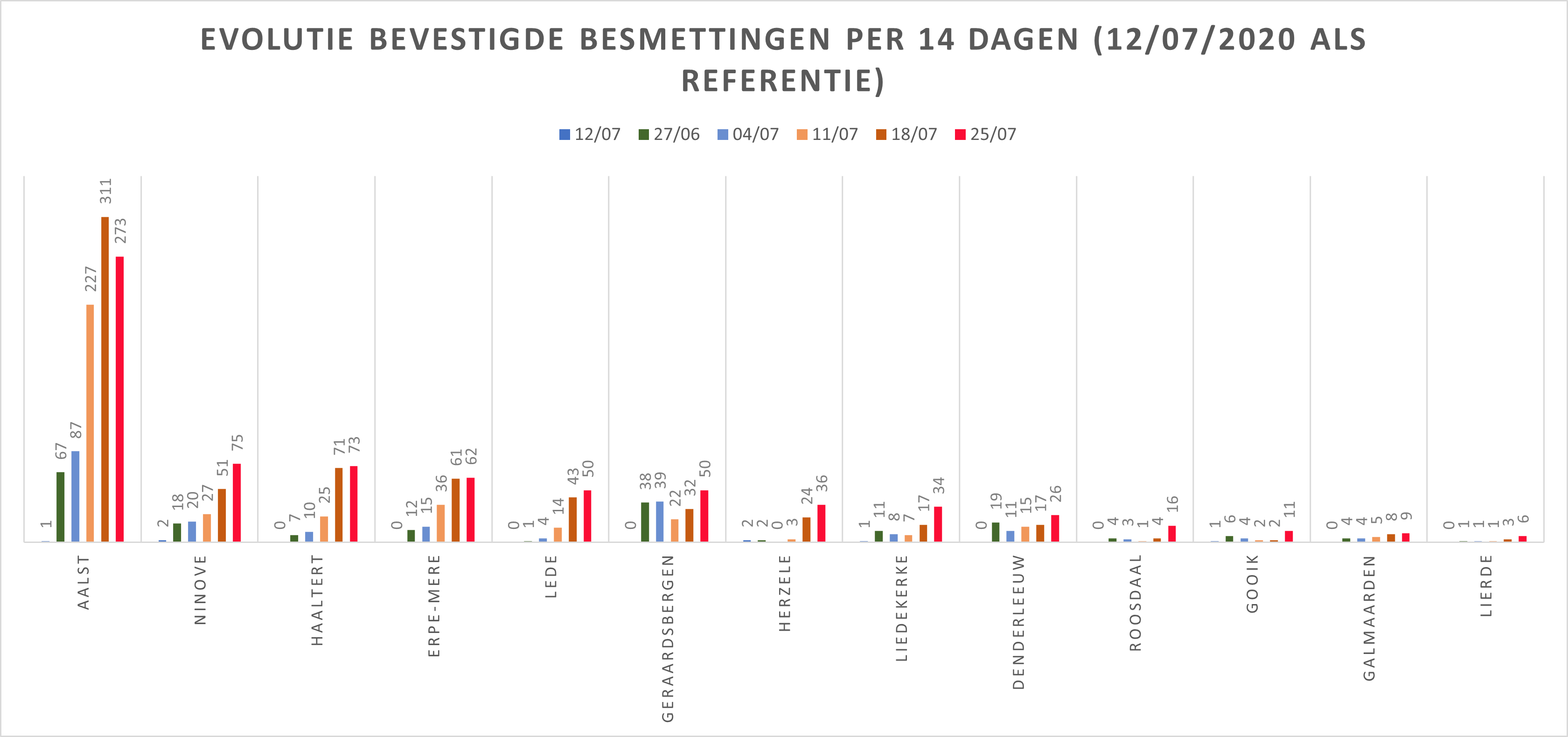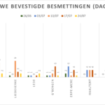 Hieronder een tabel met het aantal bevestigde besmettingen, telkens over een periode van 14 dagen (12 juli 2020 als referentie). Deze en de andere gegevens zetten we in grafieken (bijlagen).