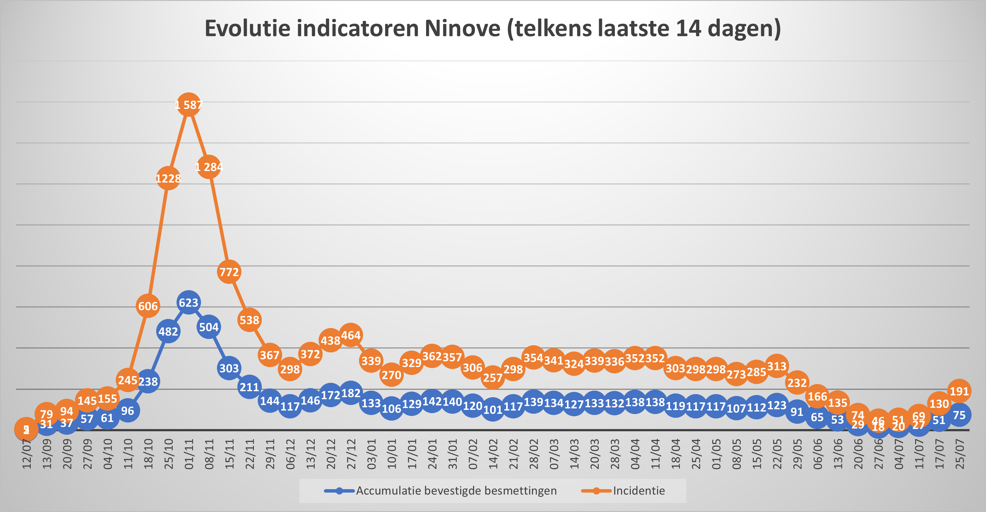 NINOVE – Volgens Sciensano zijn de afgelopen 14 dagen 75 bevestigde besmettingen genoteerd in Ninove. We brengen deze en andere cijfers van de omliggende steden en gemeenten elke week in kaart.