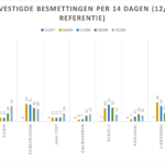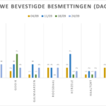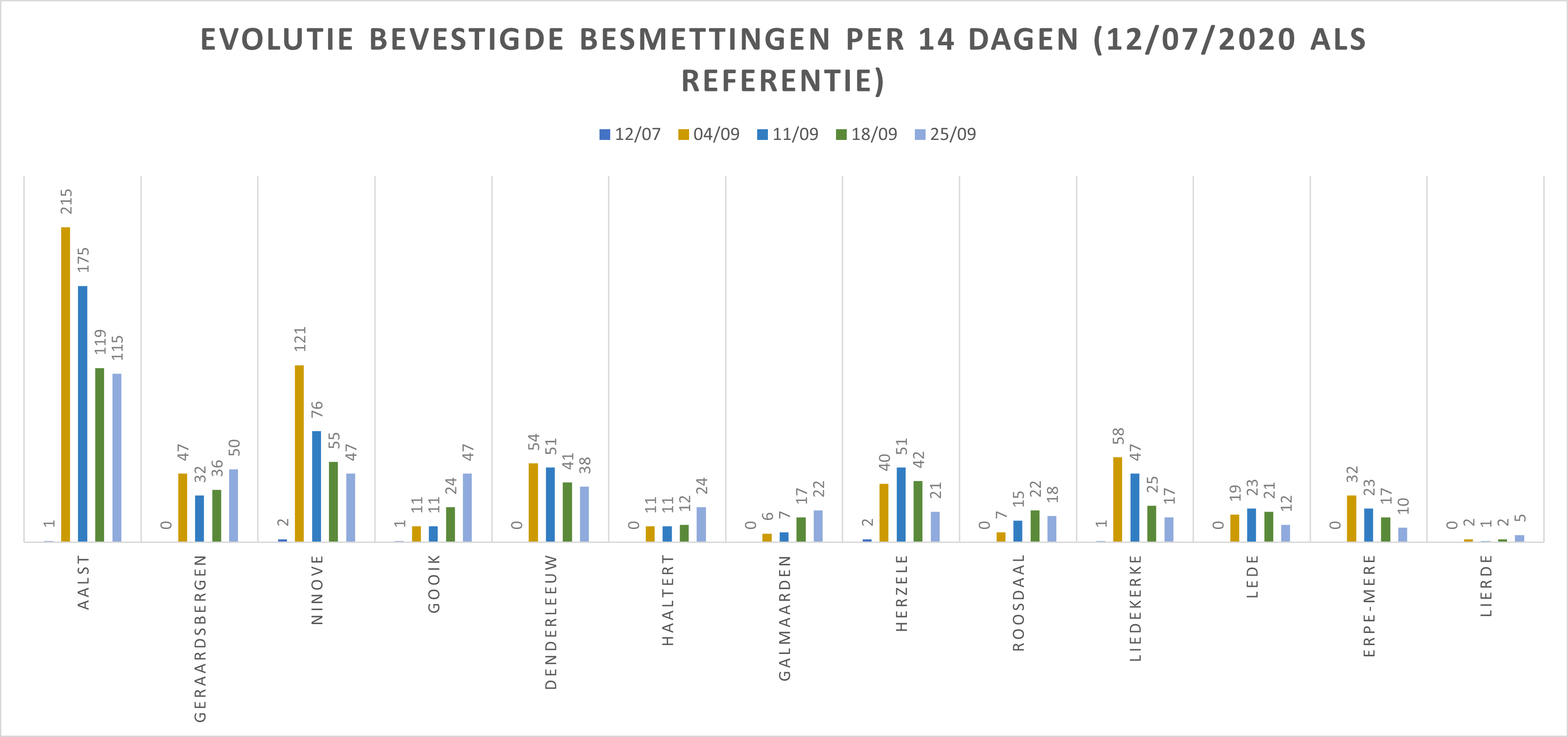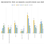 Hieronder een tabel met het aantal bevestigde besmettingen, telkens over een periode van 14 dagen (12 juli 2020 als referentie). Deze en de andere gegevens zetten we in grafieken (bijlagen).